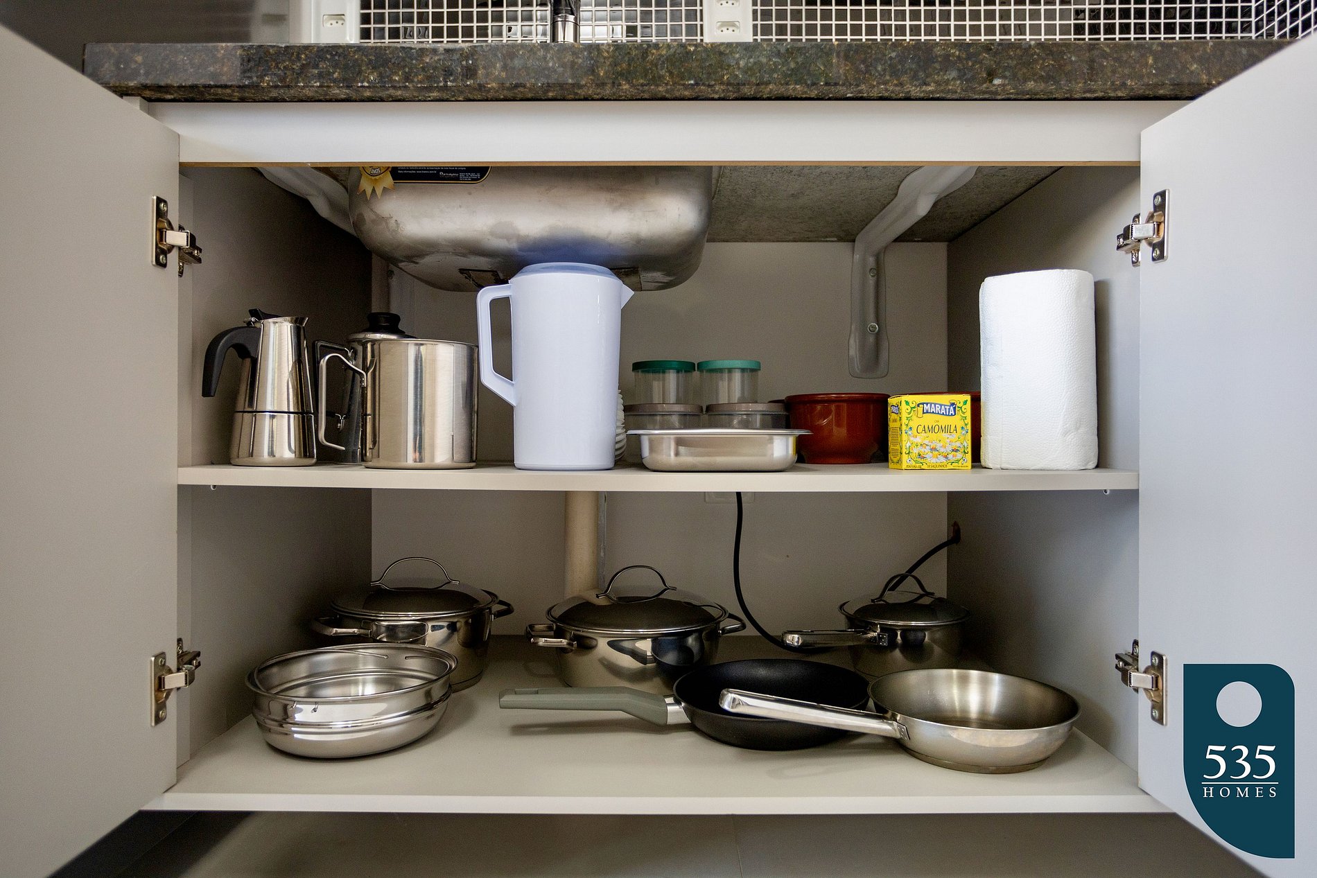 Essential appliances such as airfryer, rice cooker, sandwich maker, blender, induction cooktop, range hood, microwave, and Italian coffee maker.