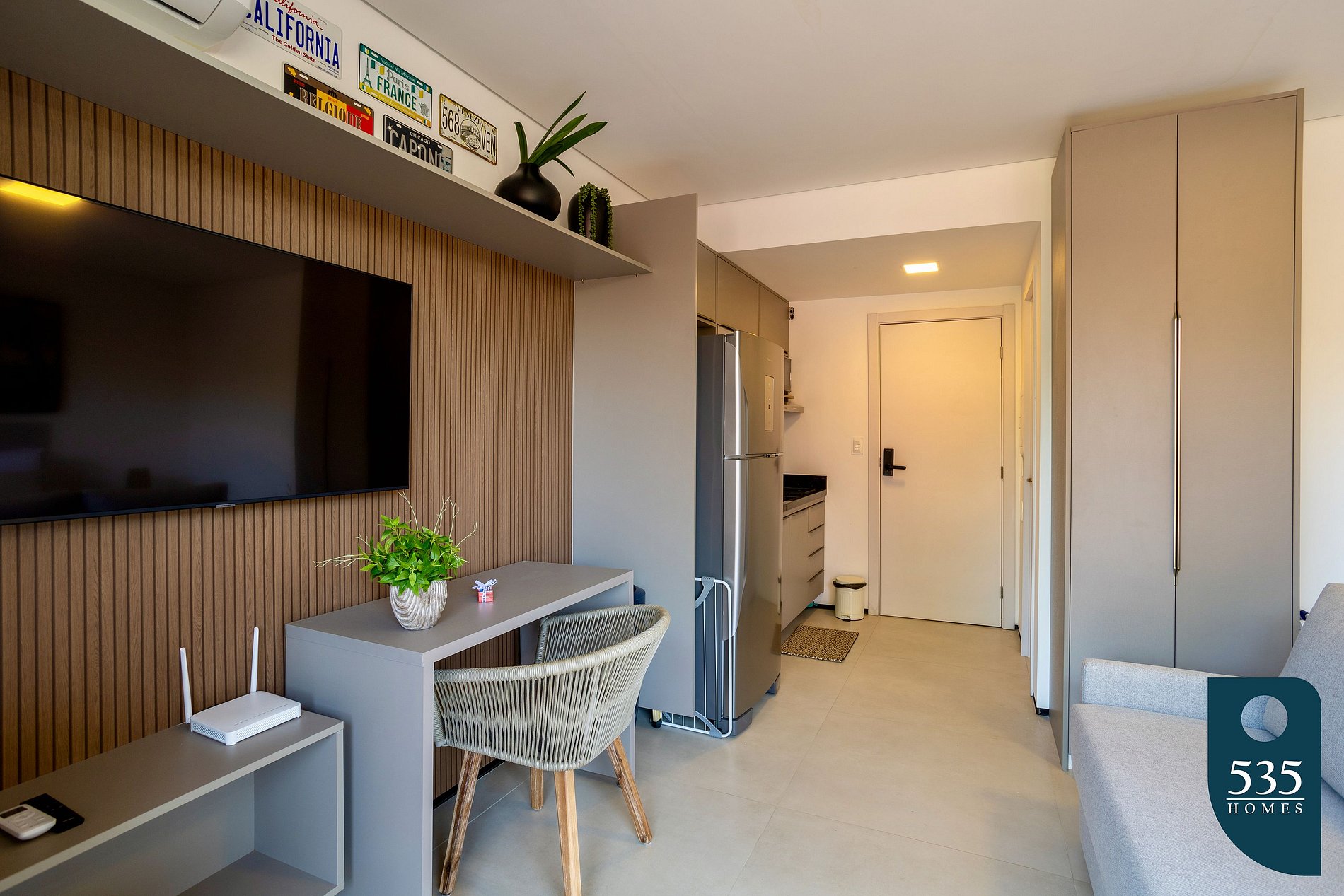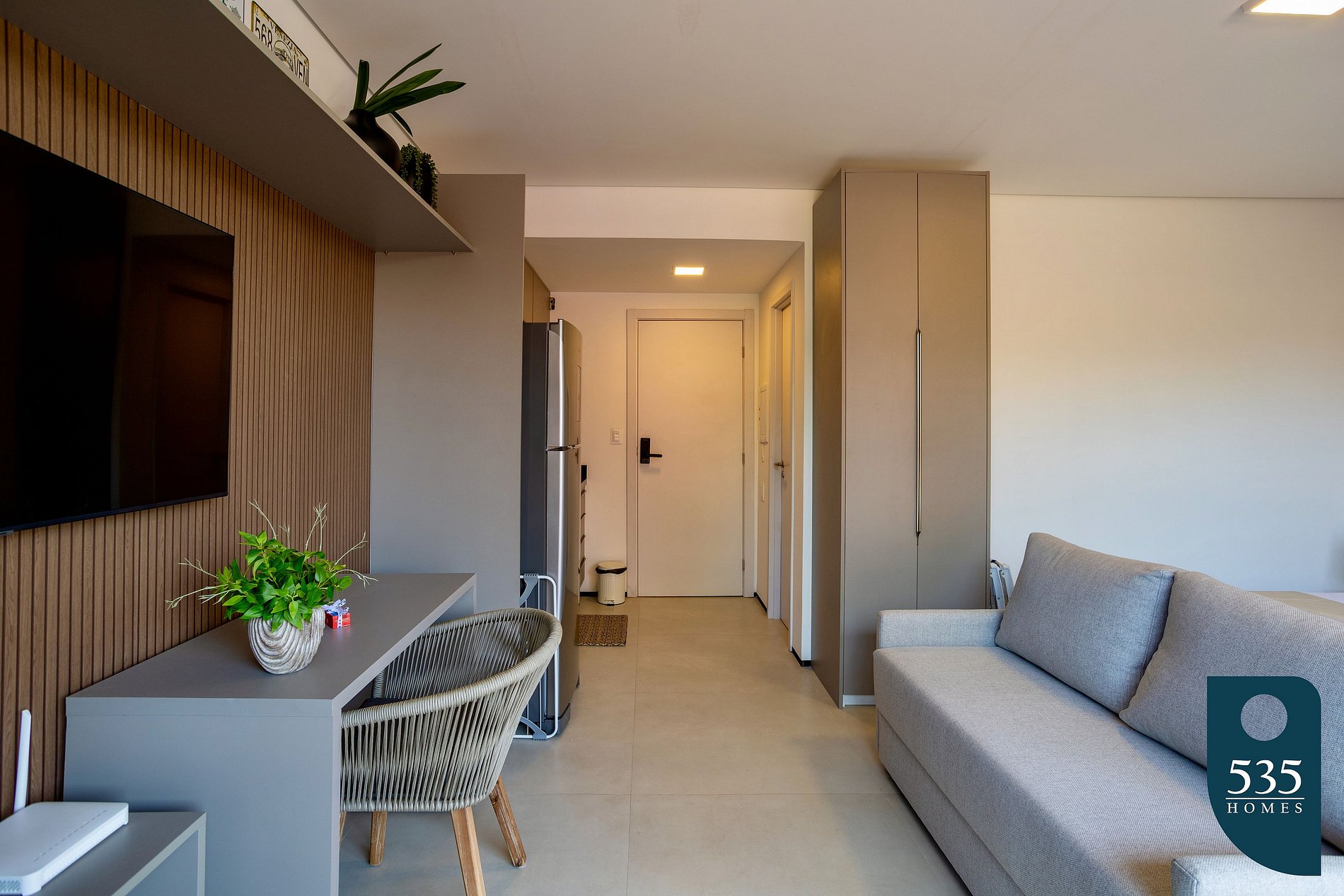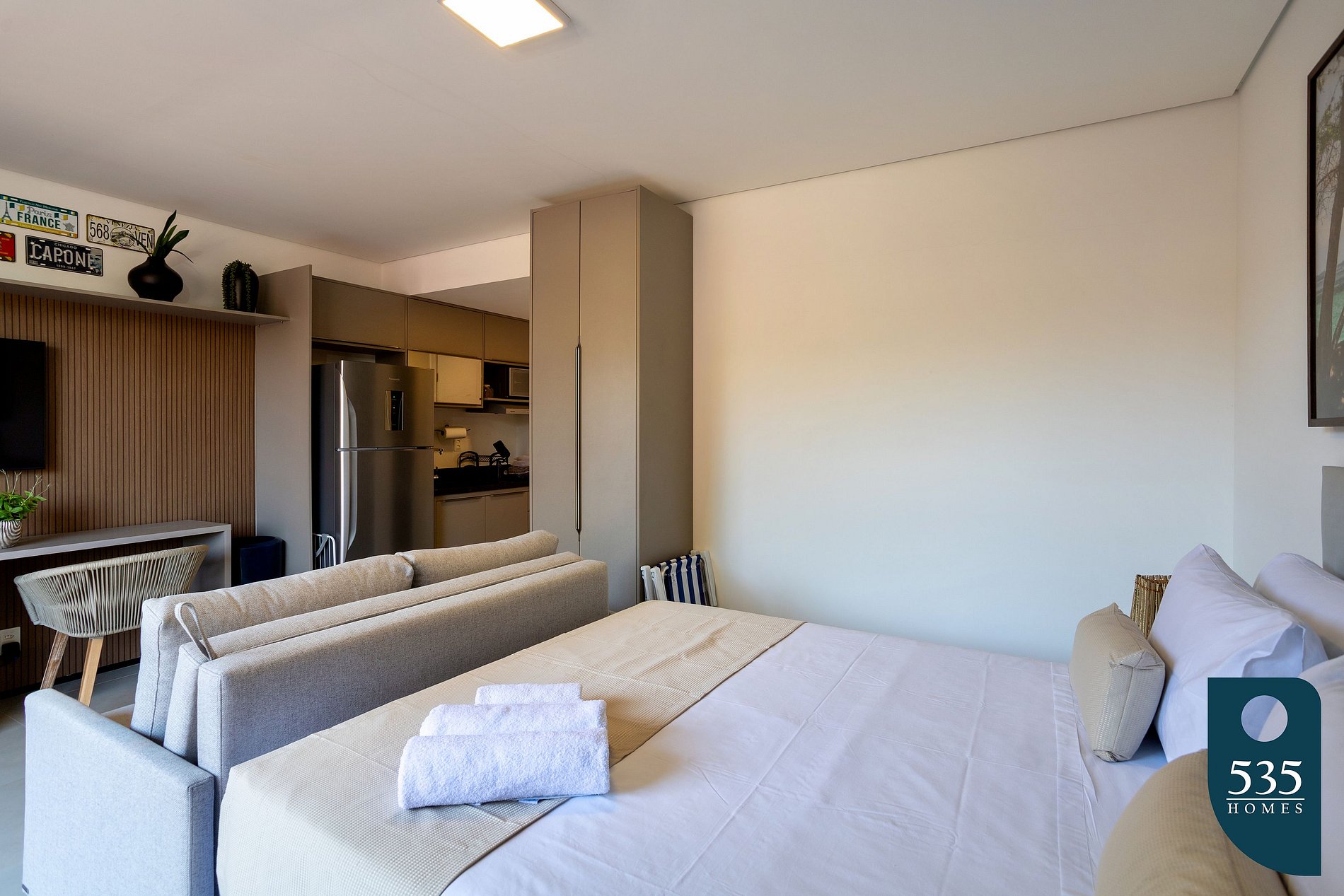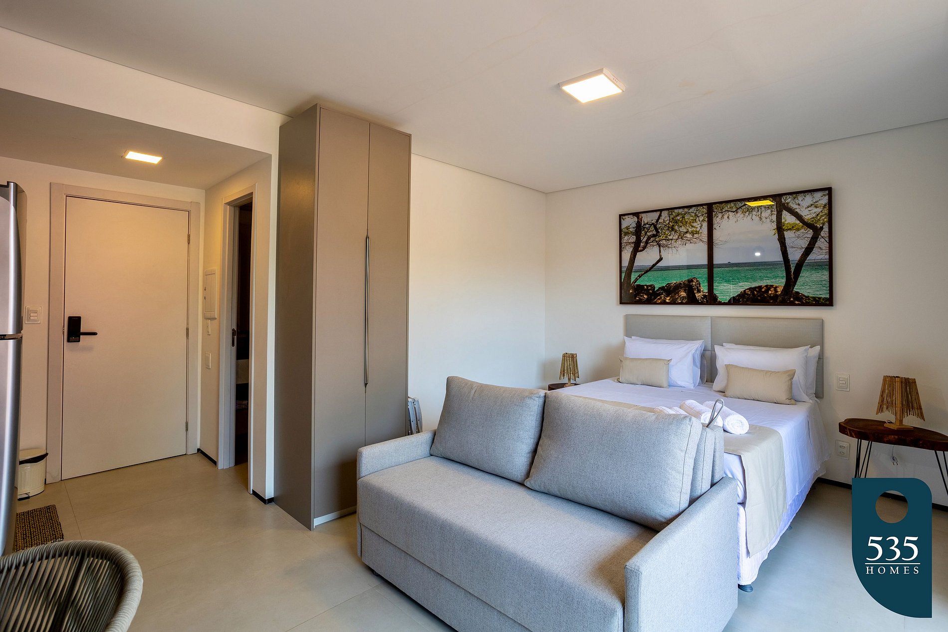 Upon crossing the threshold, you are greeted by a spacious studio, a perfect fusion of modernity and tropical summer. With an inviting double bed and a sofa bed, this is a place where comfort intertwines with style.