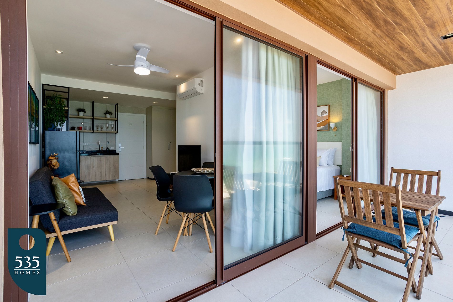 The seasonal apartment is fully furnished and equipped to provide comfort and convenience throughout your stay. The kitchen features a four-burner induction cooktop, refrigerator, minibar, electric water dispenser, microwave, Italian coffee maker, coffee machine, blender, sandwich maker, set of pots with lids, frying pan, cutlery, kitchen utensils, wine and can openers, knife set, placemats, vegetable peeler, lemon and garlic squeezers. The laundry area includes a broom, dustpan, floor squeegee, bucket, floor clothes rack, and clothespins. The living room is equipped with air conditioning, a 44-inch Smart TV, ceiling fan with remote control, side tables, and curtains. The bathroom has an exhaust fan, hair dryer, bidet shower, electric shower, towel rack, and mirror. The bedroom offers air conditioning, hangers, blackout curtains, ironing board and iron, as well as a ceiling fan with remote control. The balcony includes a table and chairs, ideal for relaxing and enjoying the outdoor space.
