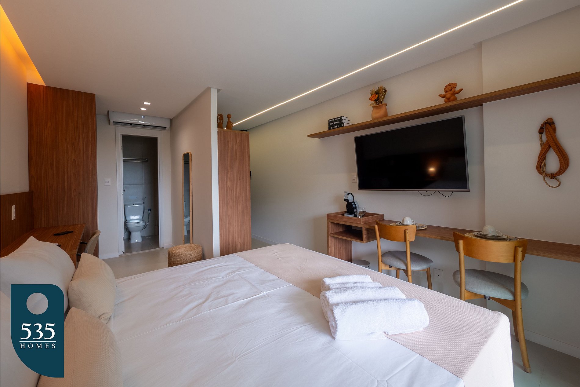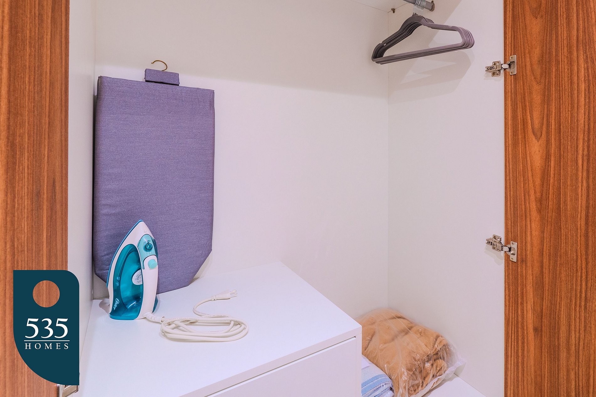 In the bedroom with a walk-in closet, you’ll find a 50-inch Smart TV, air conditioning, a workstation with an adjustable chair, a full-length mirror, a compact ironing board, and an electric iron, providing comfort for both relaxation and daily activities. The bathroom includes an electric shower and a hair dryer, ensuring convenience and comfort. The balcony completes the space, offering a pleasant area to unwind.