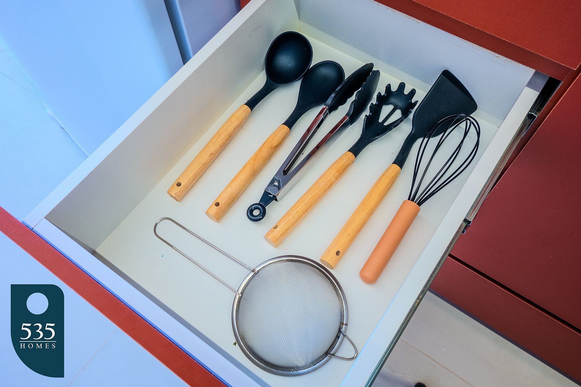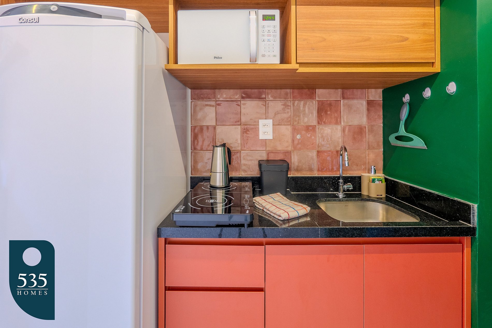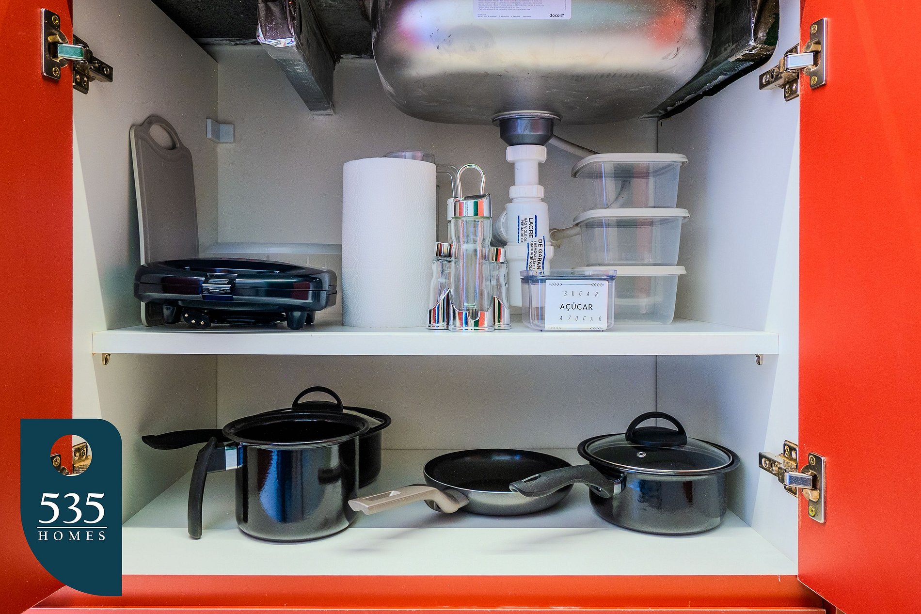 The short-term rental apartment is fully equipped to offer convenience and comfort during your stay. The kitchen features a refrigerator, microwave, sandwich maker, coffee machine, moka pot, two-burner induction cooktop, glassware, and a set of pots with lids, ensuring practicality for meal preparation.