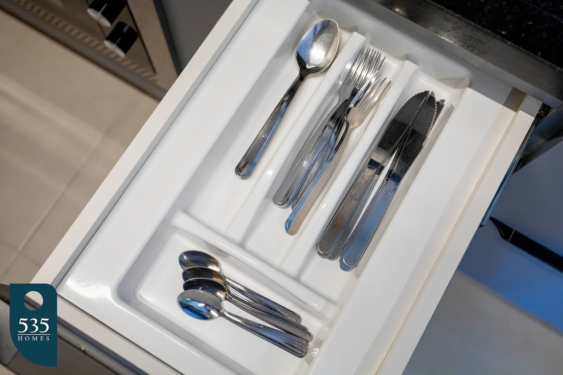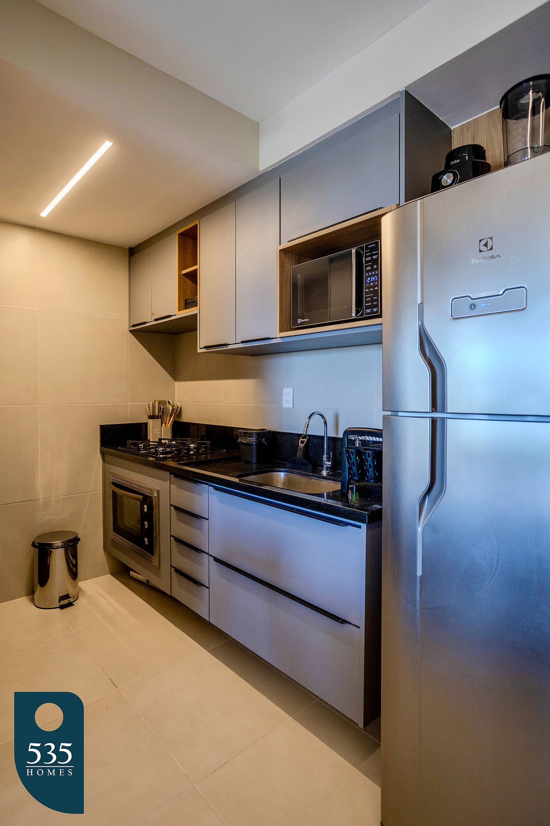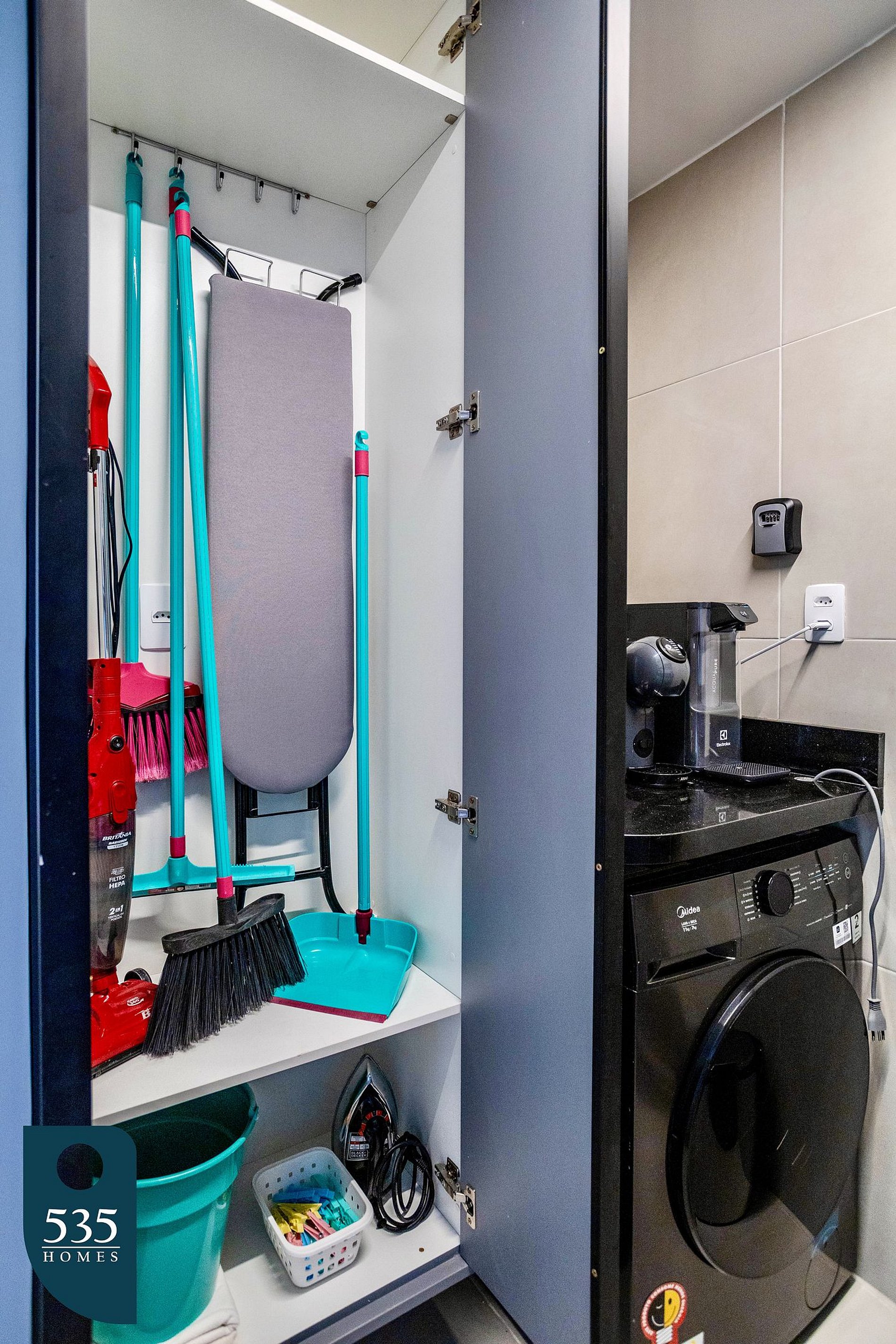 The kitchen is fully equipped with a refrigerator, microwave, oven, 4-burner electric cooktop, blender, air fryer, sandwich maker, coffee machine, electric coffee maker, water dispenser, a set of lidded pots, iron and ironing board, and a washer-dryer, ensuring complete functionality for daily use.