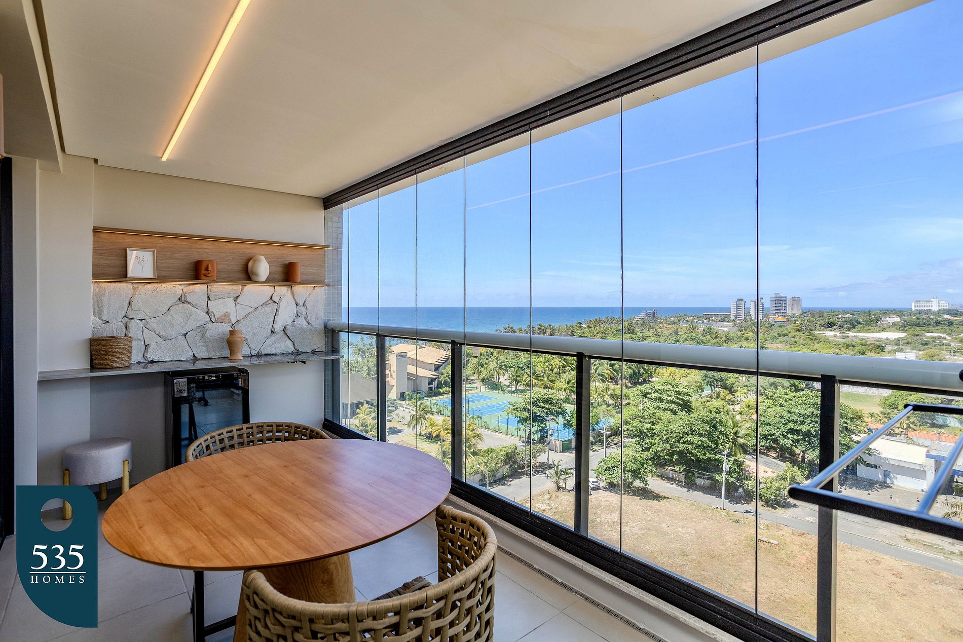The balcony includes a dining table, glass-enclosed panels, and a beverage cooler, ideal for unwinding.