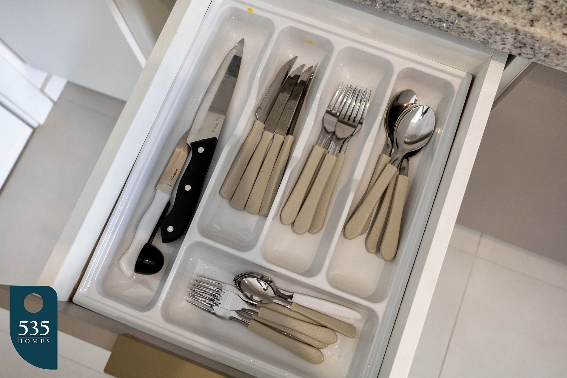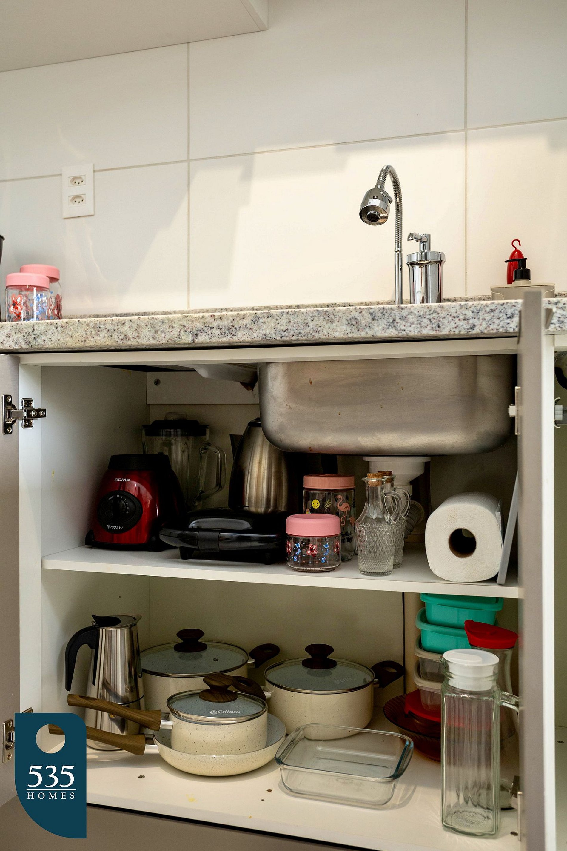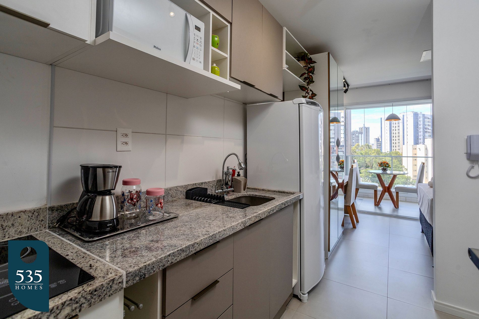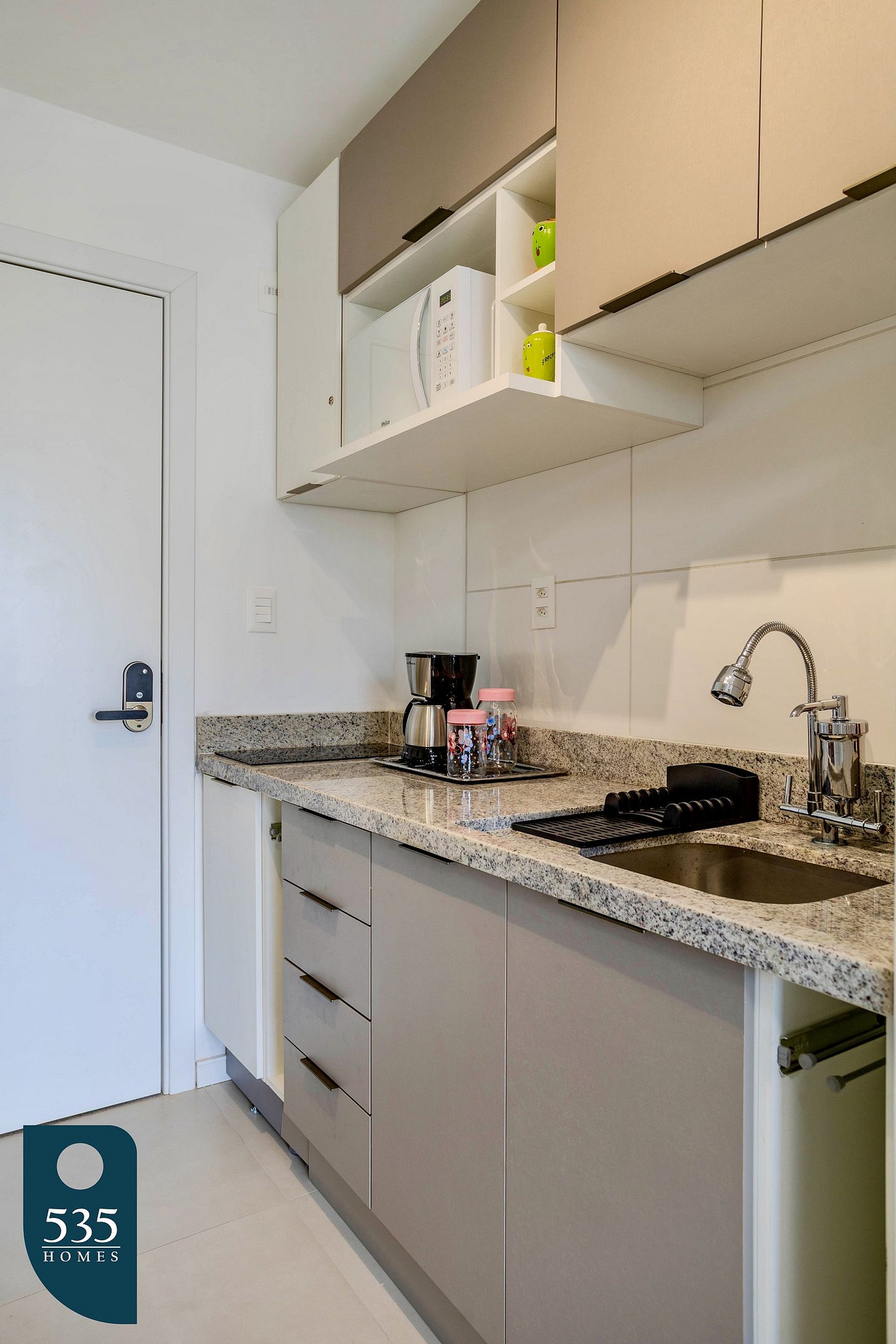 This short-term rental apartment offers practicality and comfort in a functional setting. The kitchen is equipped with an electric coffee maker, Italian coffee maker, microwave, two-burner induction cooktop, refrigerator, sandwich maker, electric kettle, blender, water purifier attached to the tap, and a set of cookware, ensuring convenience for meal preparation.