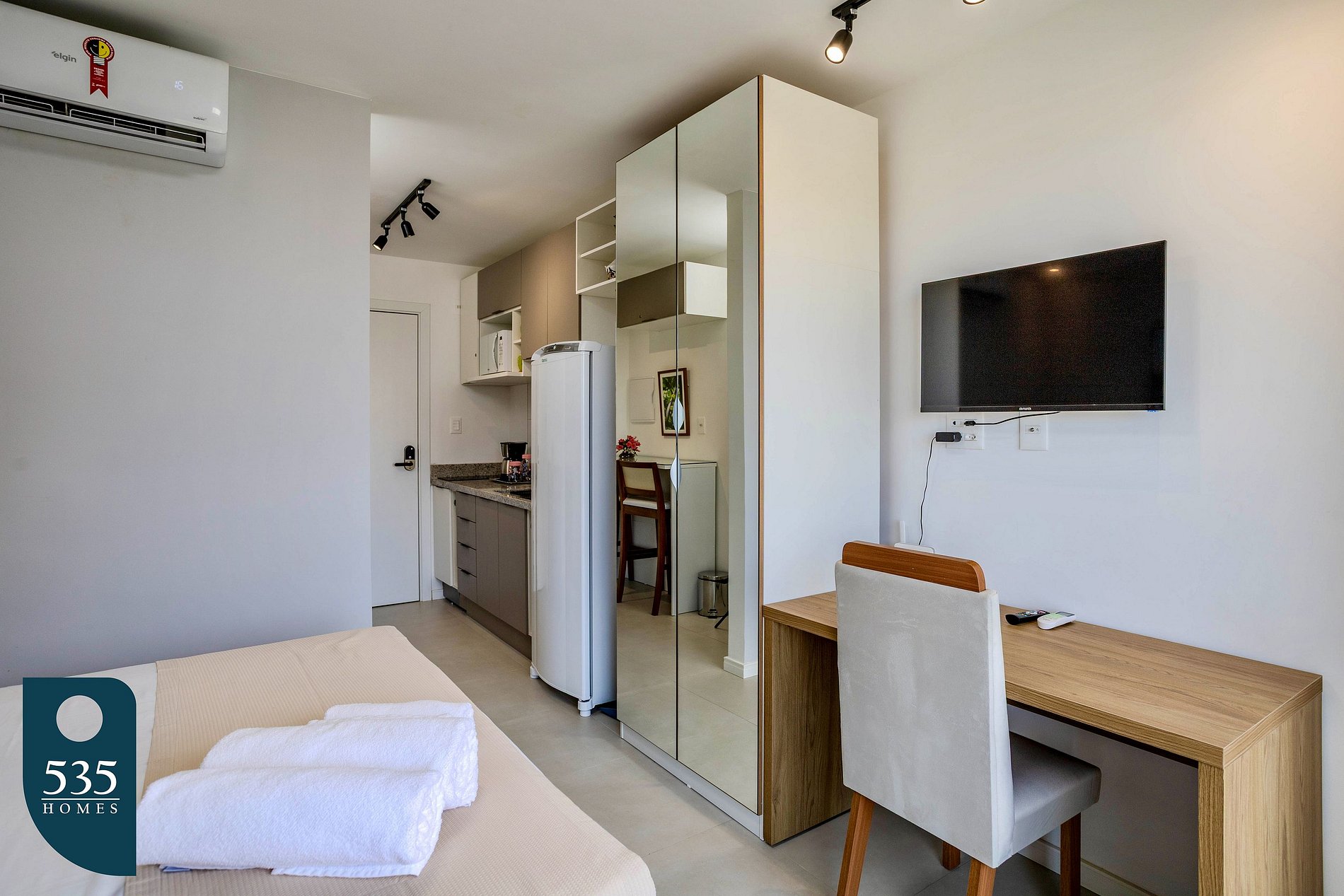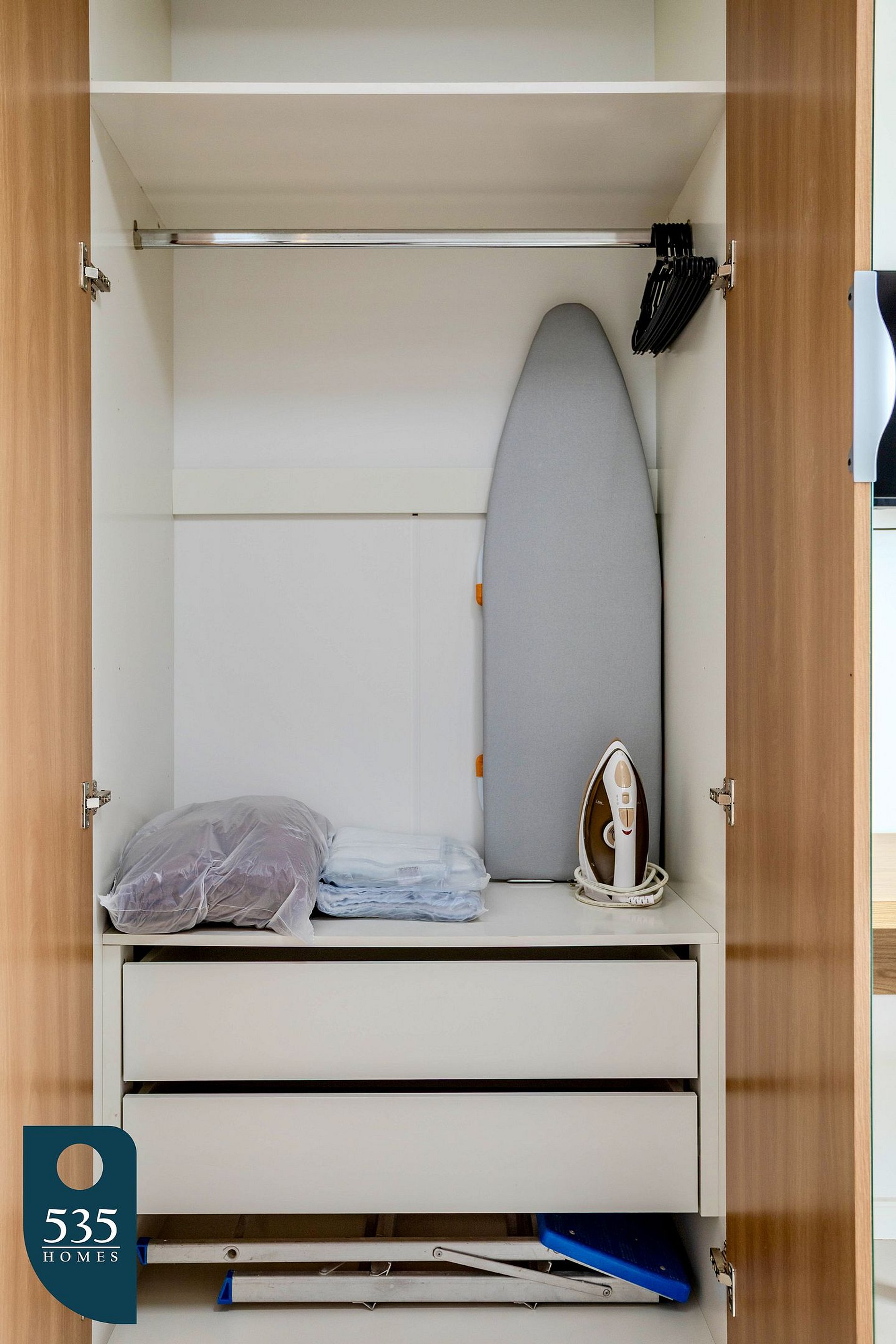 The bathroom features an electric shower, hair dryer, and exhaust fan. The bedroom includes a full-length mirror, air conditioning, a dedicated workspace, 32" Smart TV, blackout curtains, a compact ironing board, electric iron, and hangers, providing comfort and functionality throughout the stay. The balcony completes the space, offering an additional area to relax.
