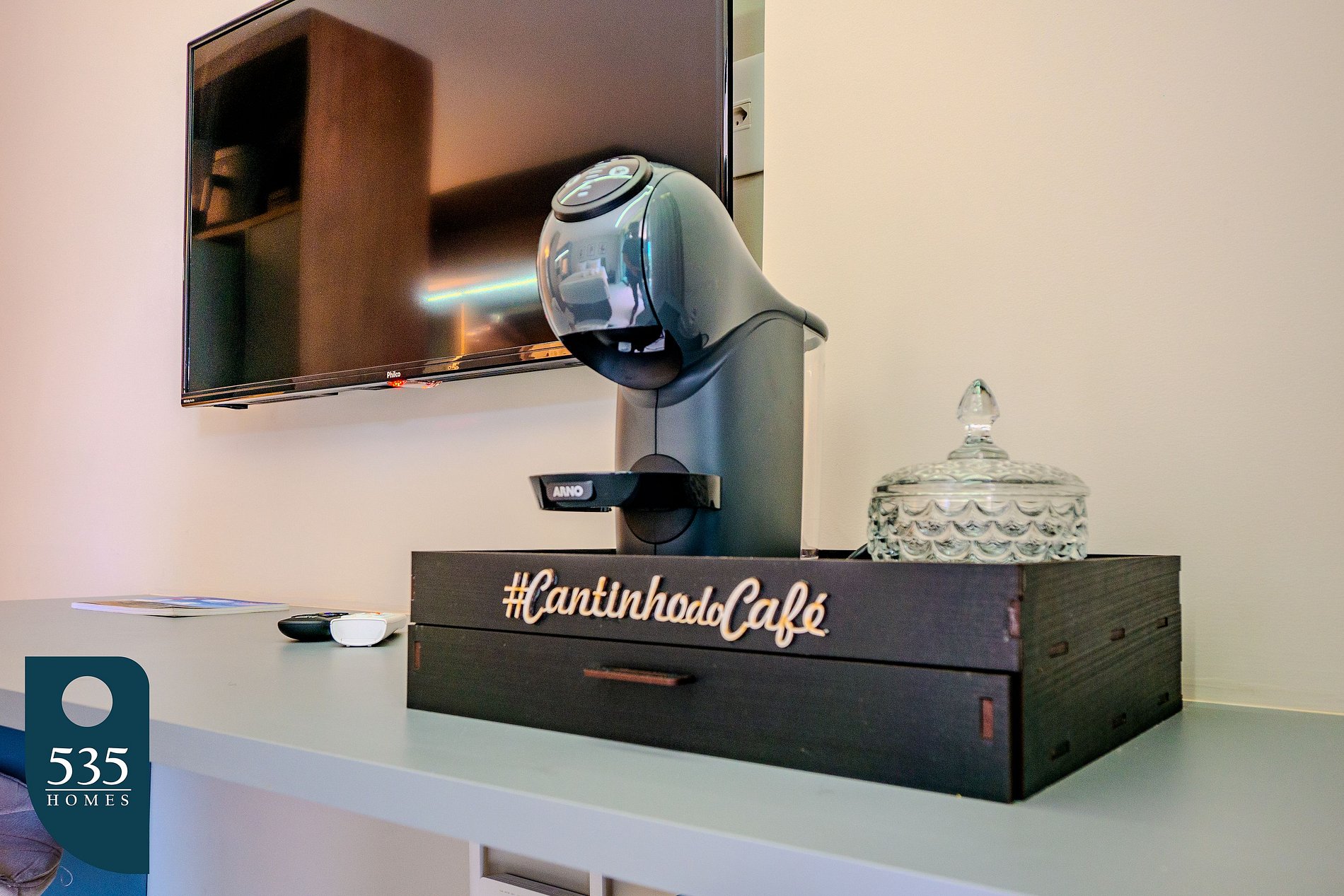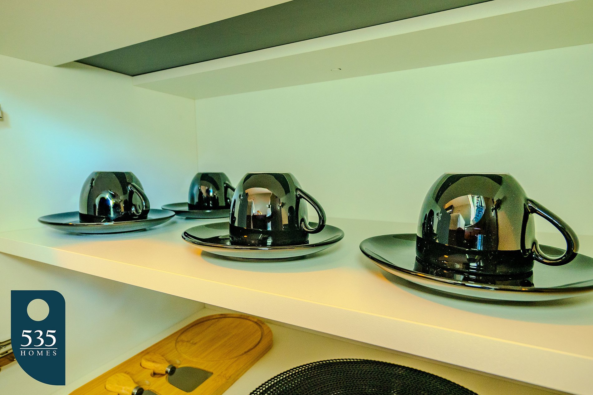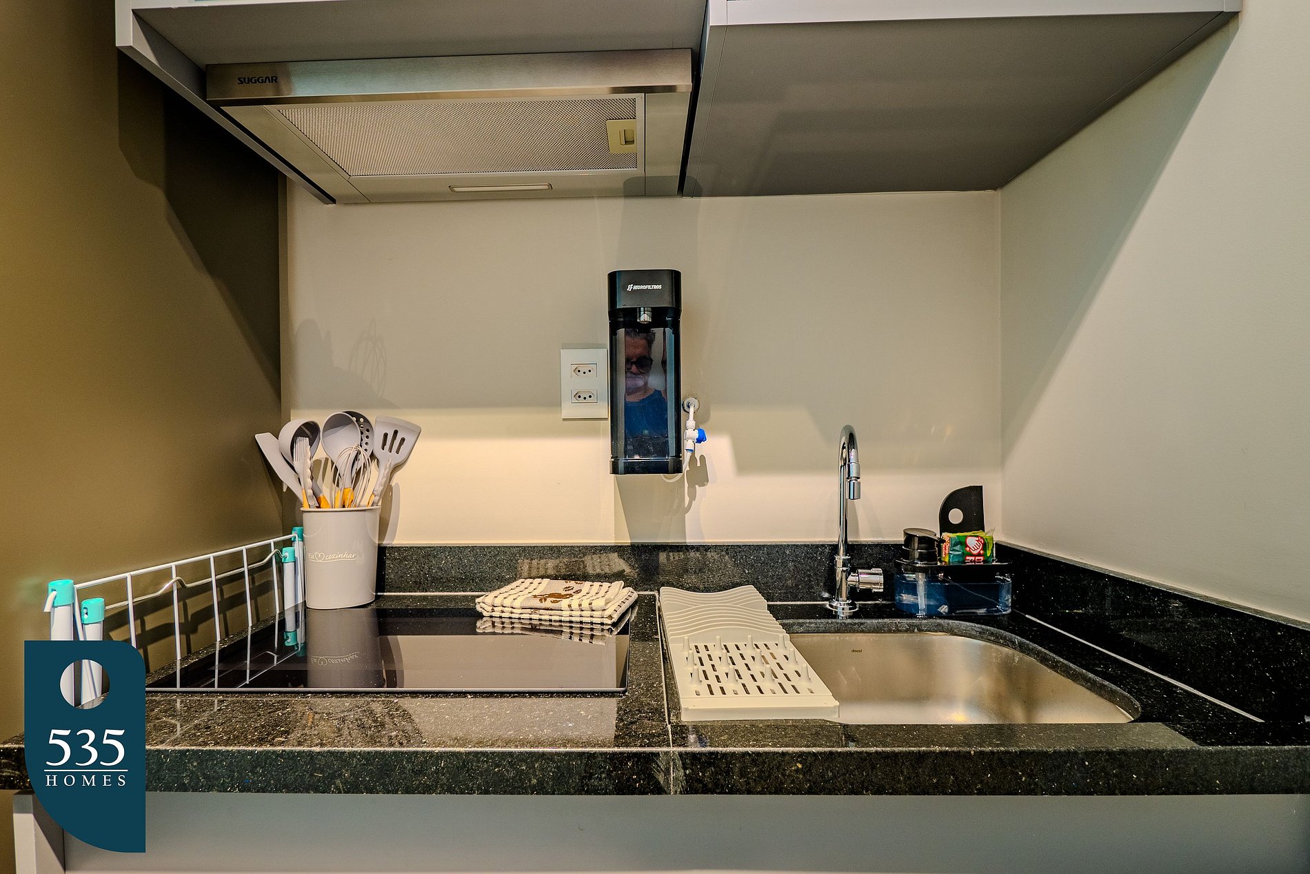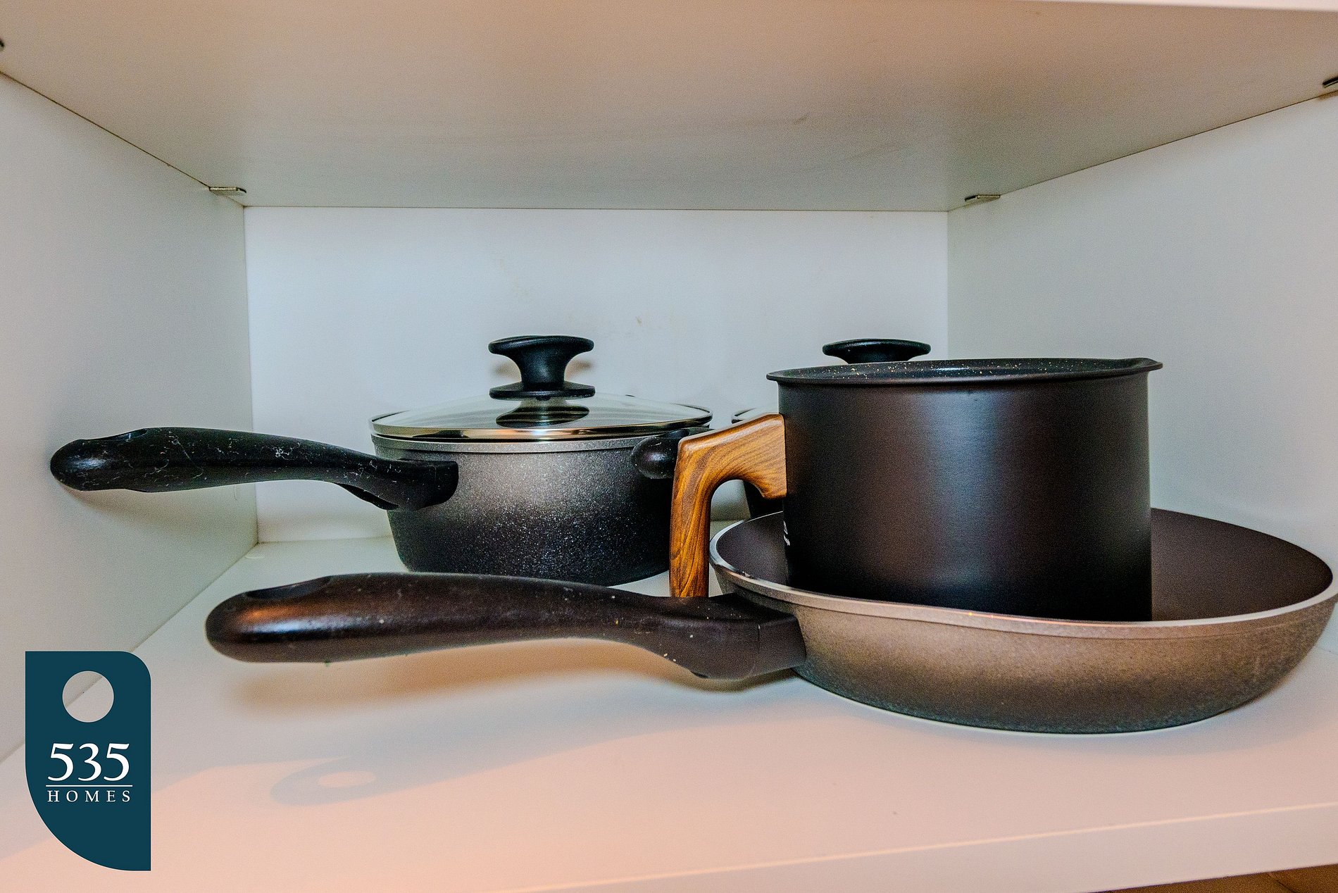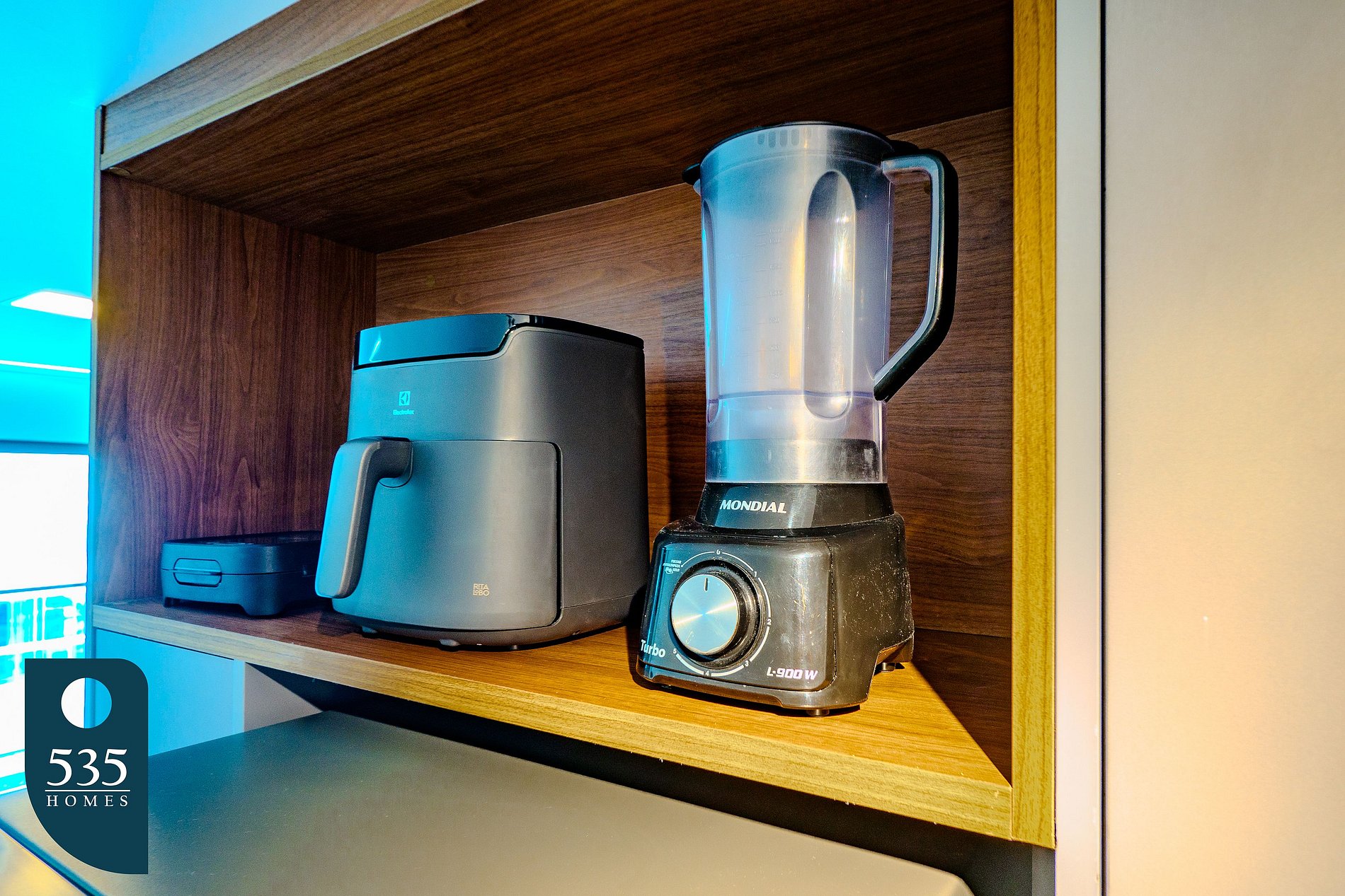 The kitchen is equipped with a two-burner induction cooktop, microwave, air fryer, blender, sandwich maker, Italian coffee maker, coffee machine, range hood, water purifier, and a set of pots with lids, ensuring convenience for meal preparation.