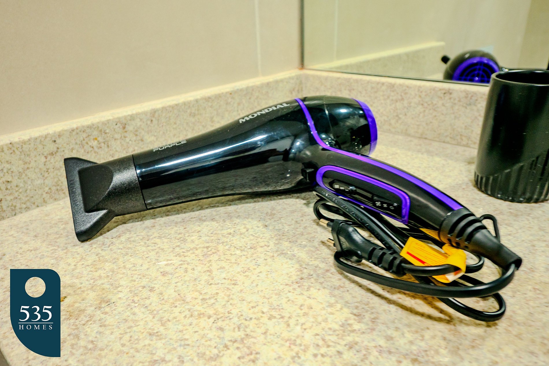 The bathroom is fitted with an electric shower, exhaust fan, and hair dryer, completing the amenities for a comfortable stay.