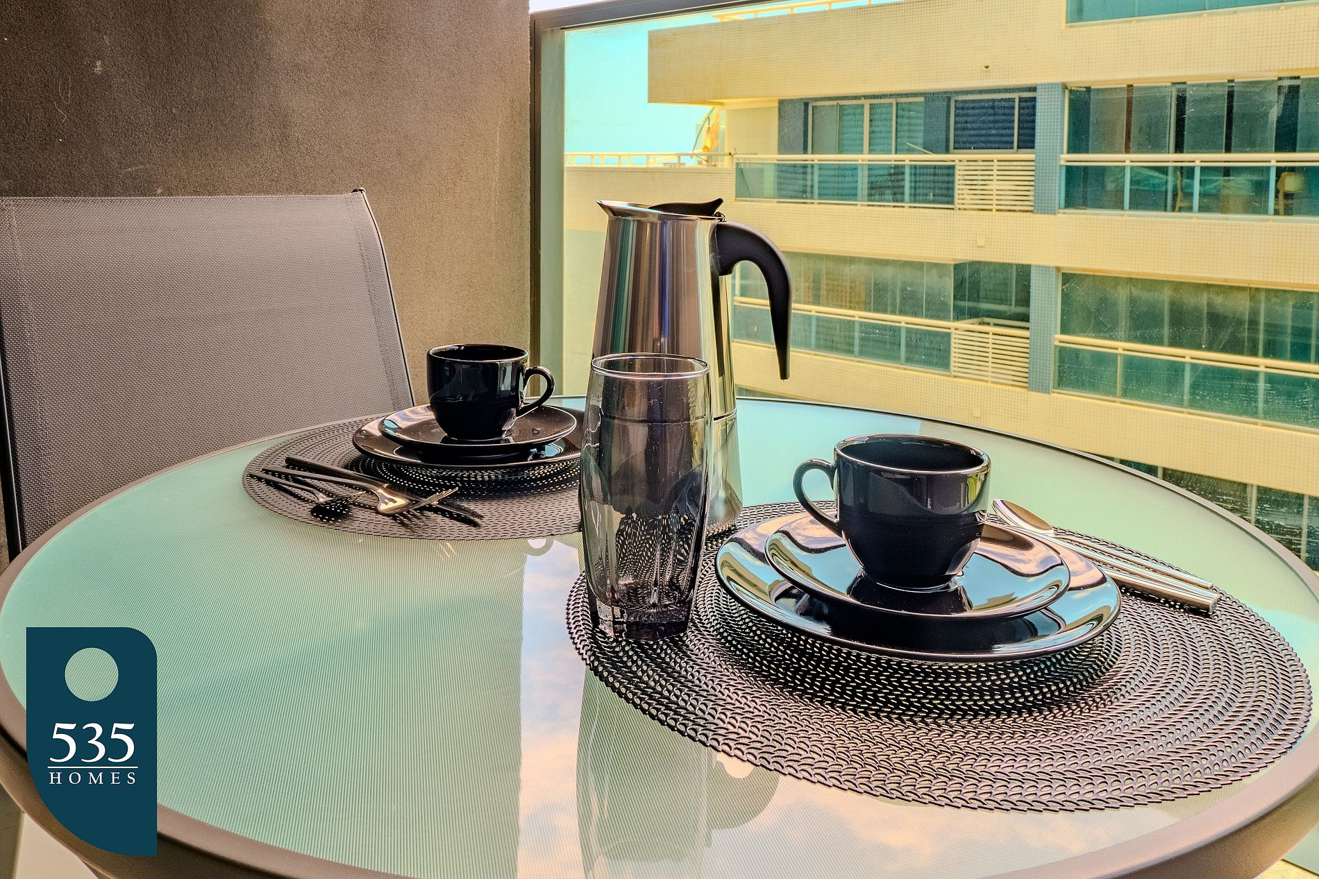 The balcony includes a table and chairs, ideal for meals or relaxing moments.