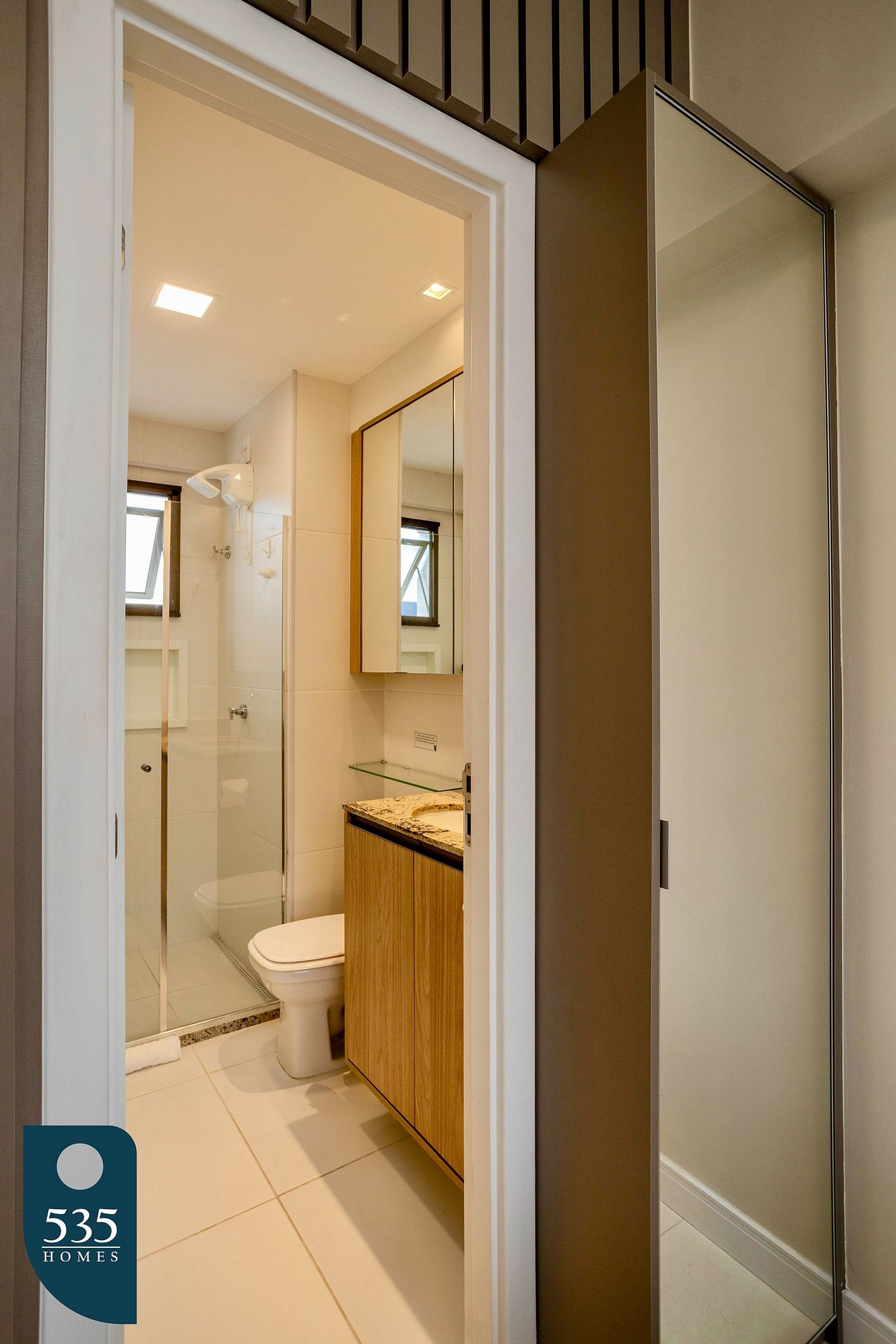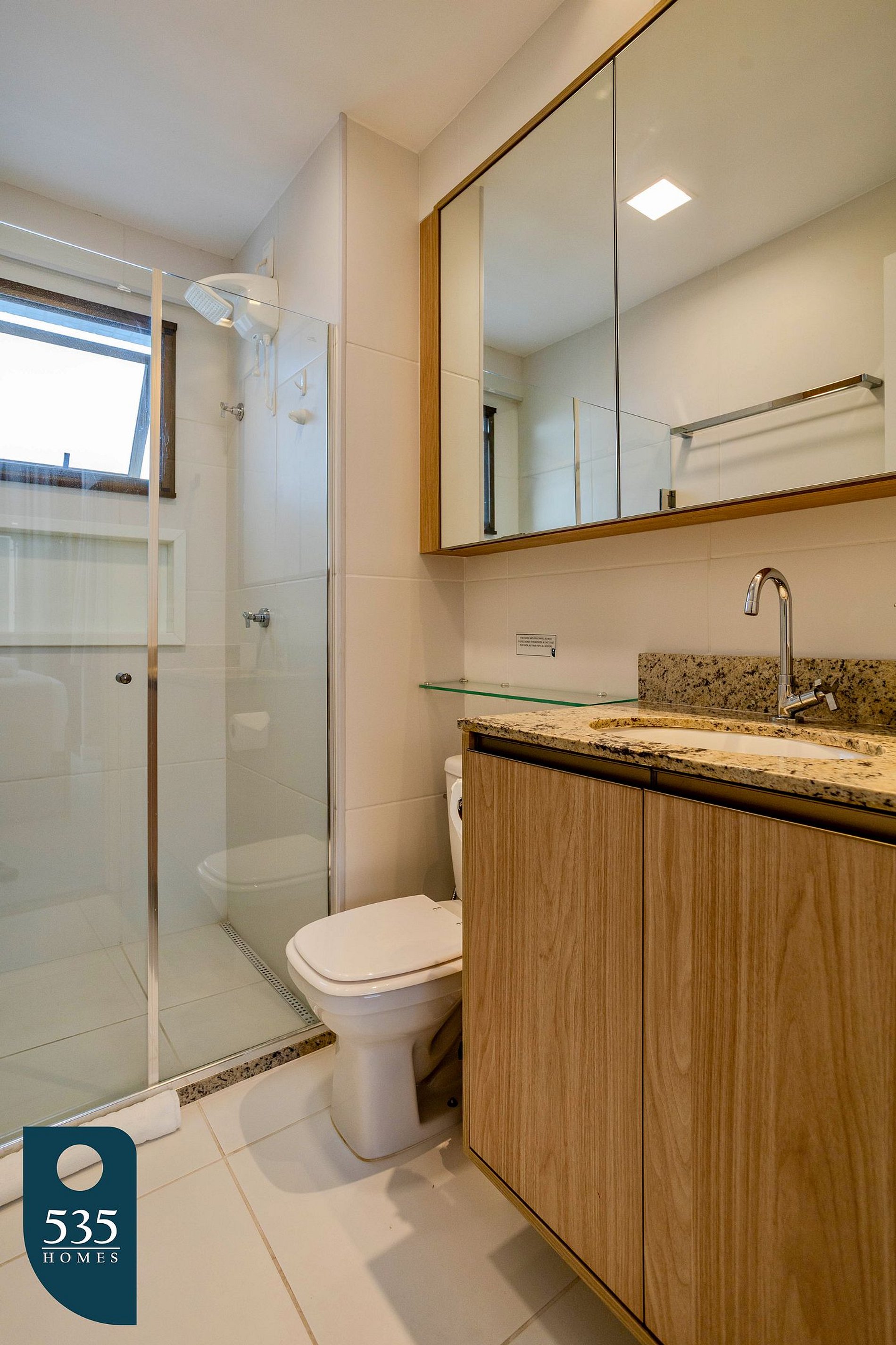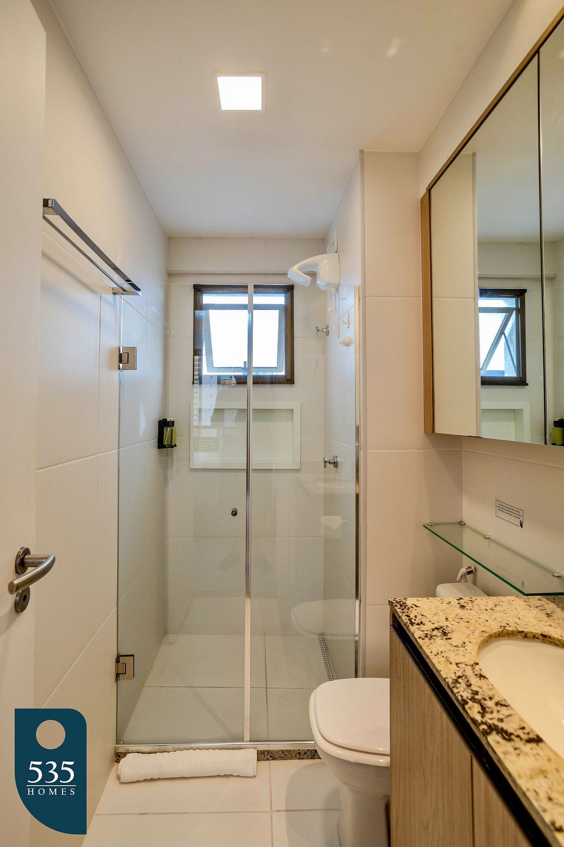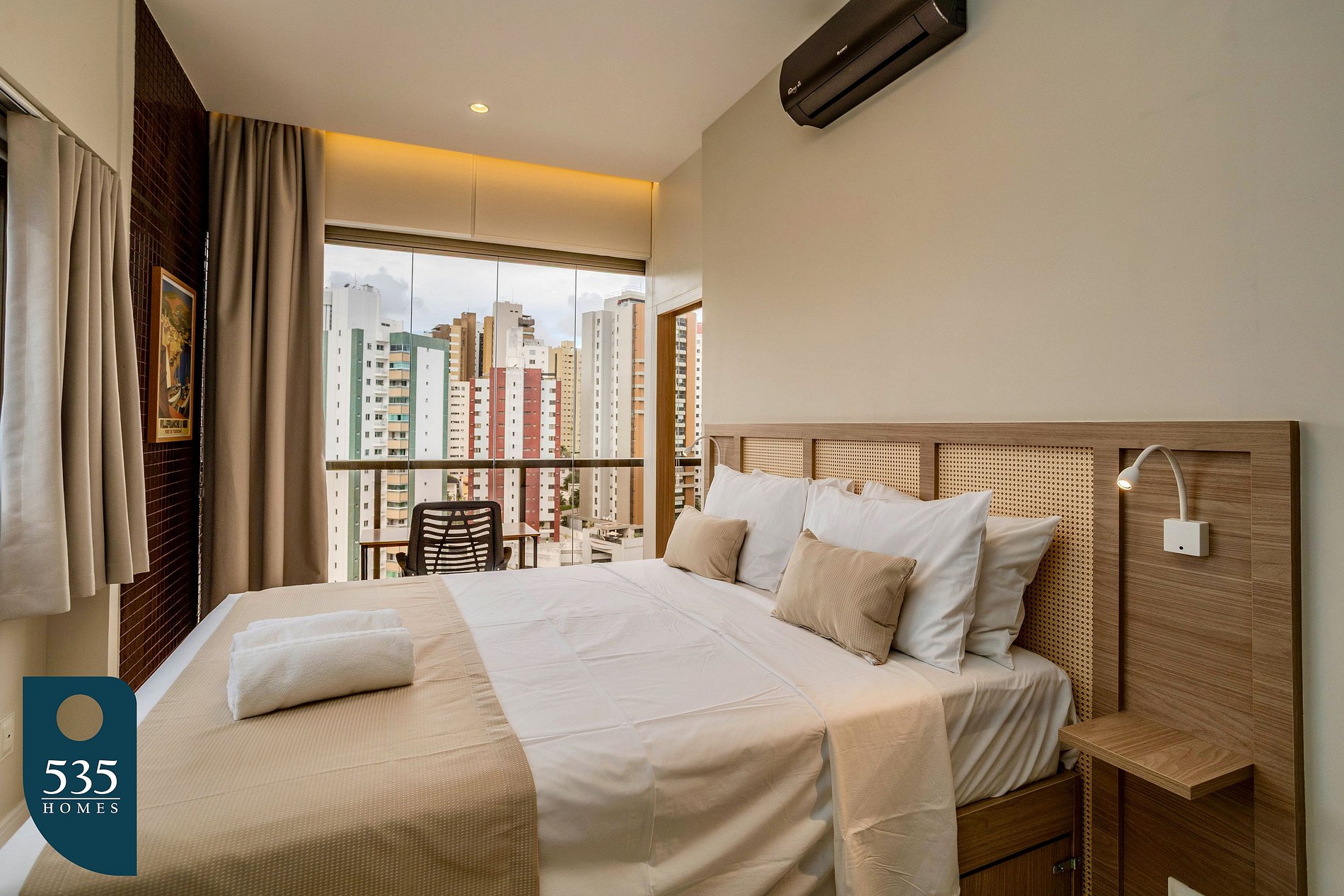 The bedroom offers a window with mosquito screen, glass enclosure (Reiki), blackout curtains, a workspace with chair, wall-mounted bedside lights, and a full-length mirror. The bathroom has a window with mosquito screen, electric shower, and hair dryer, ensuring a practical and comfortable stay.