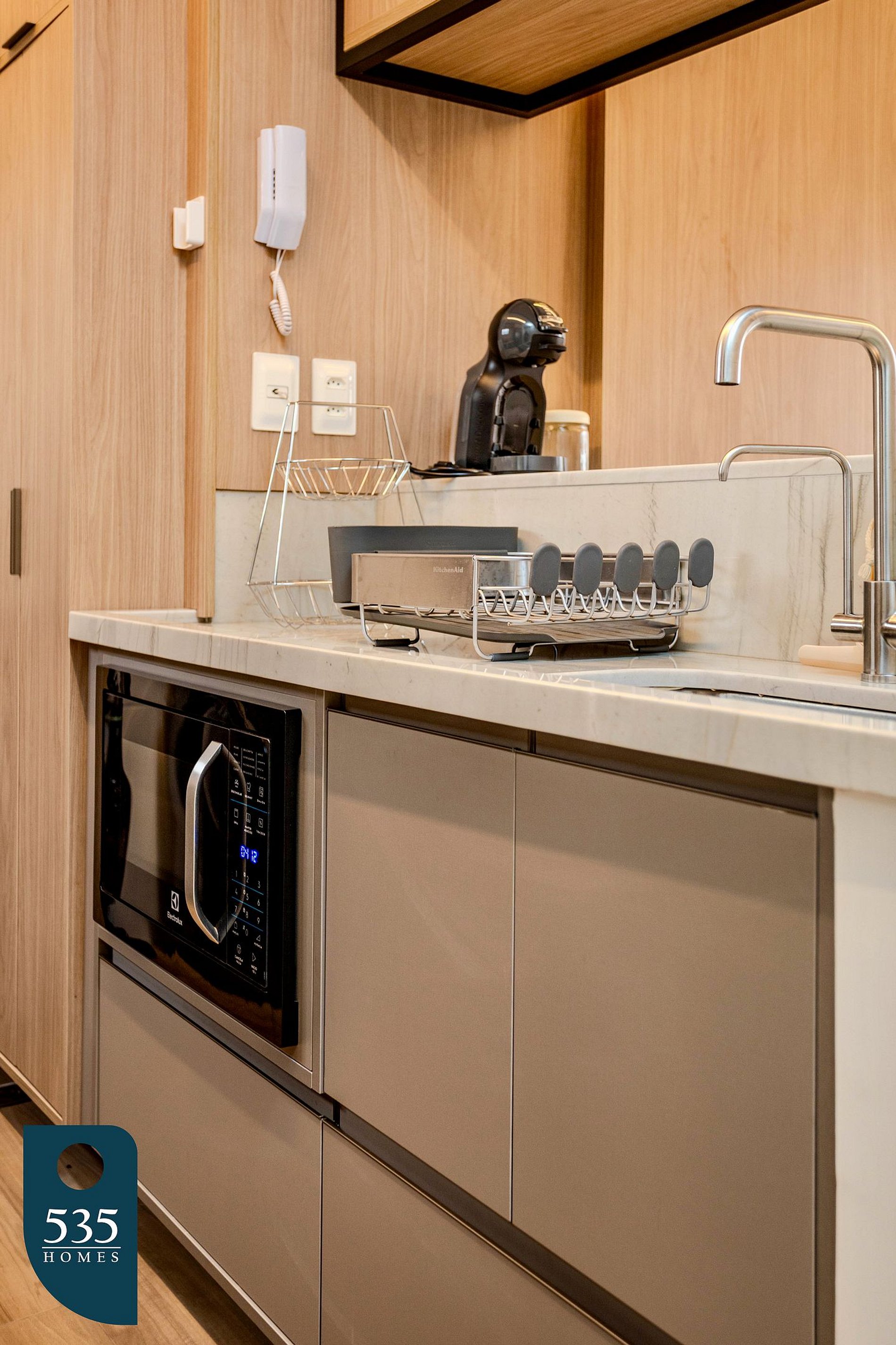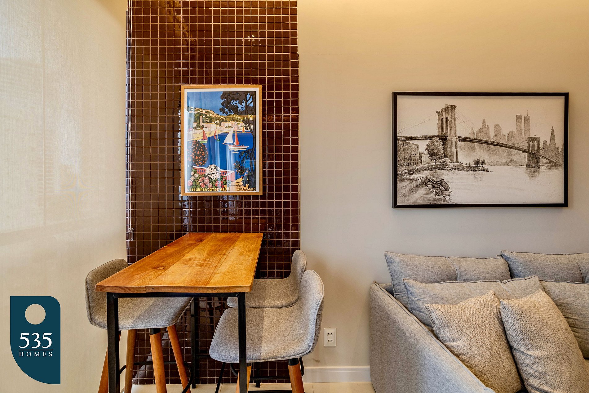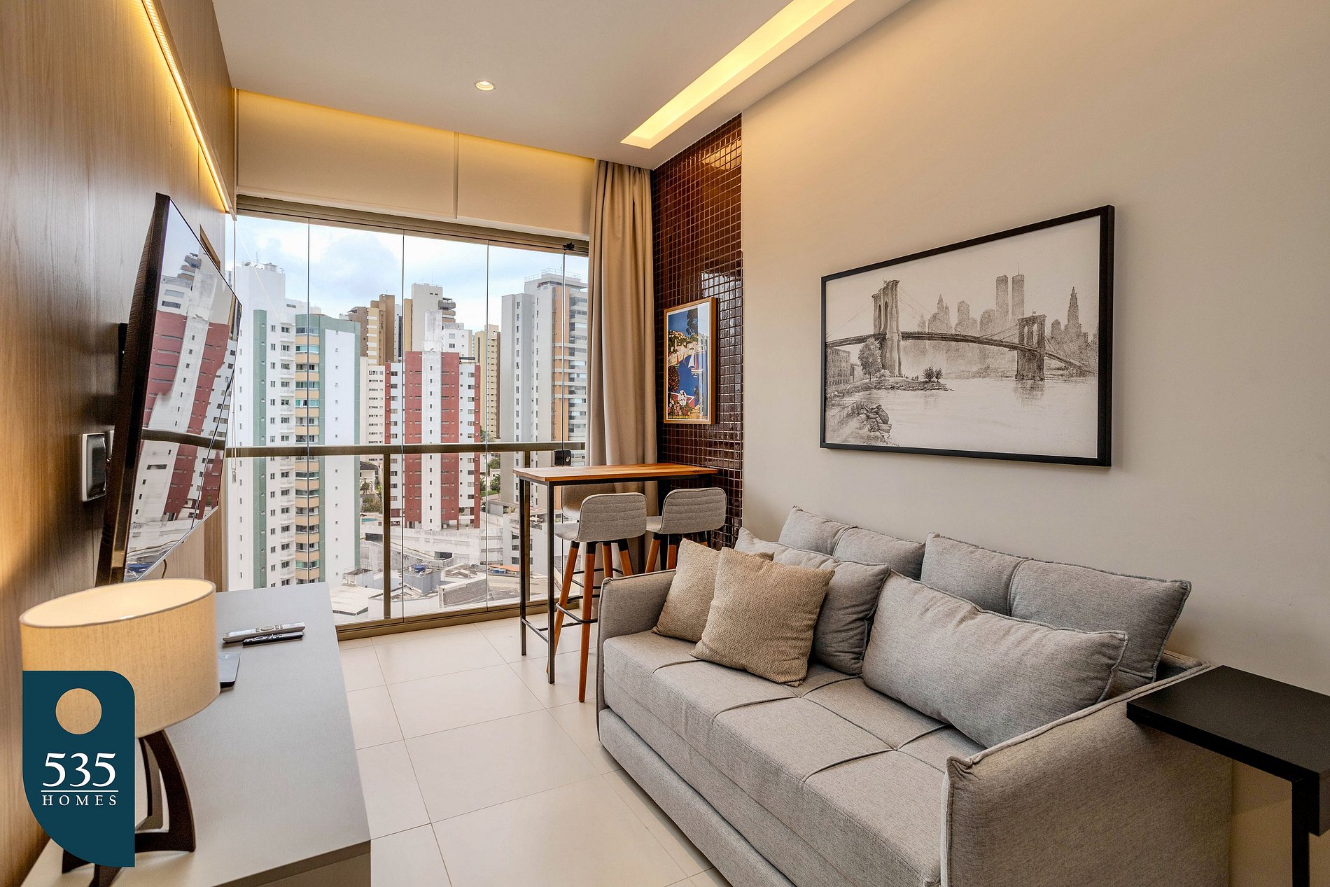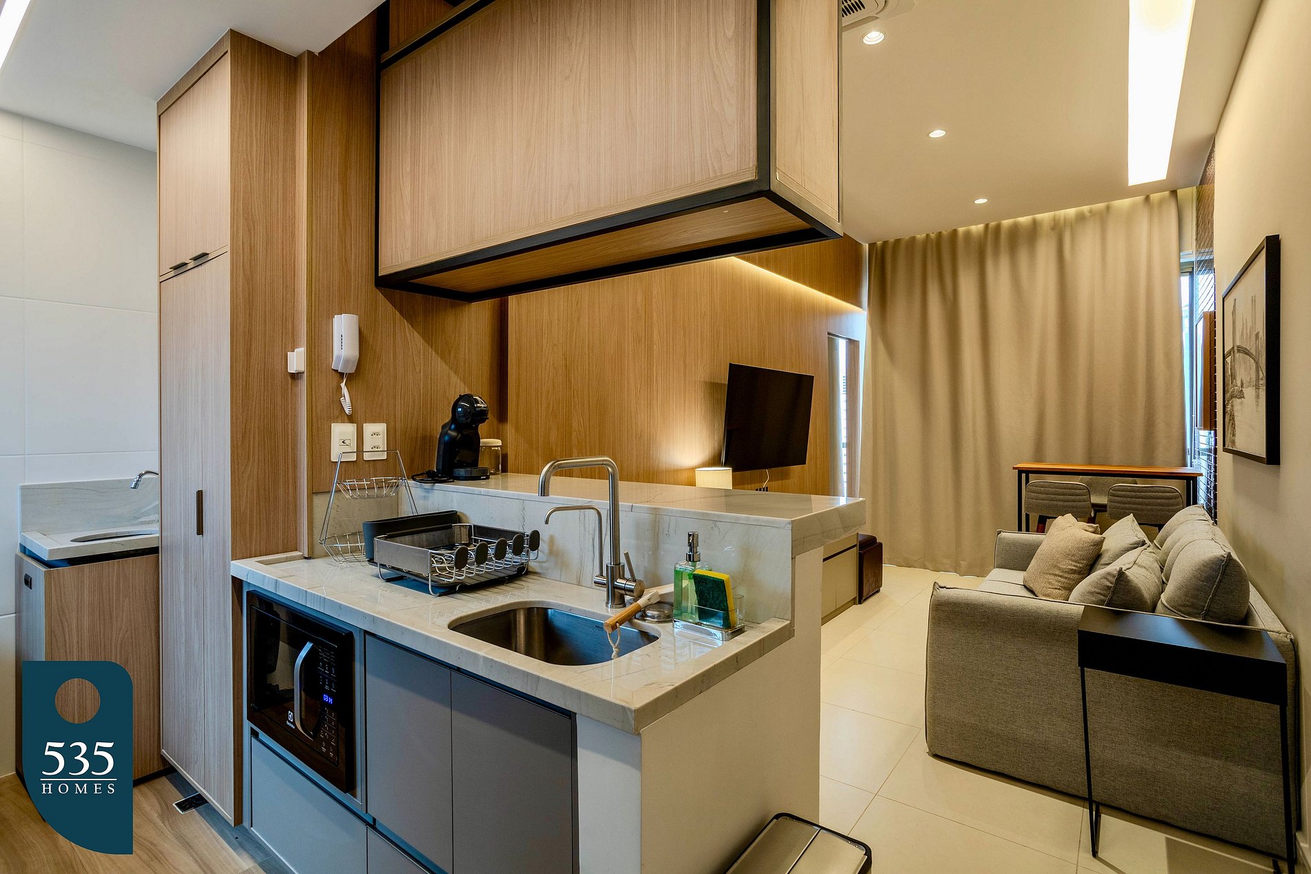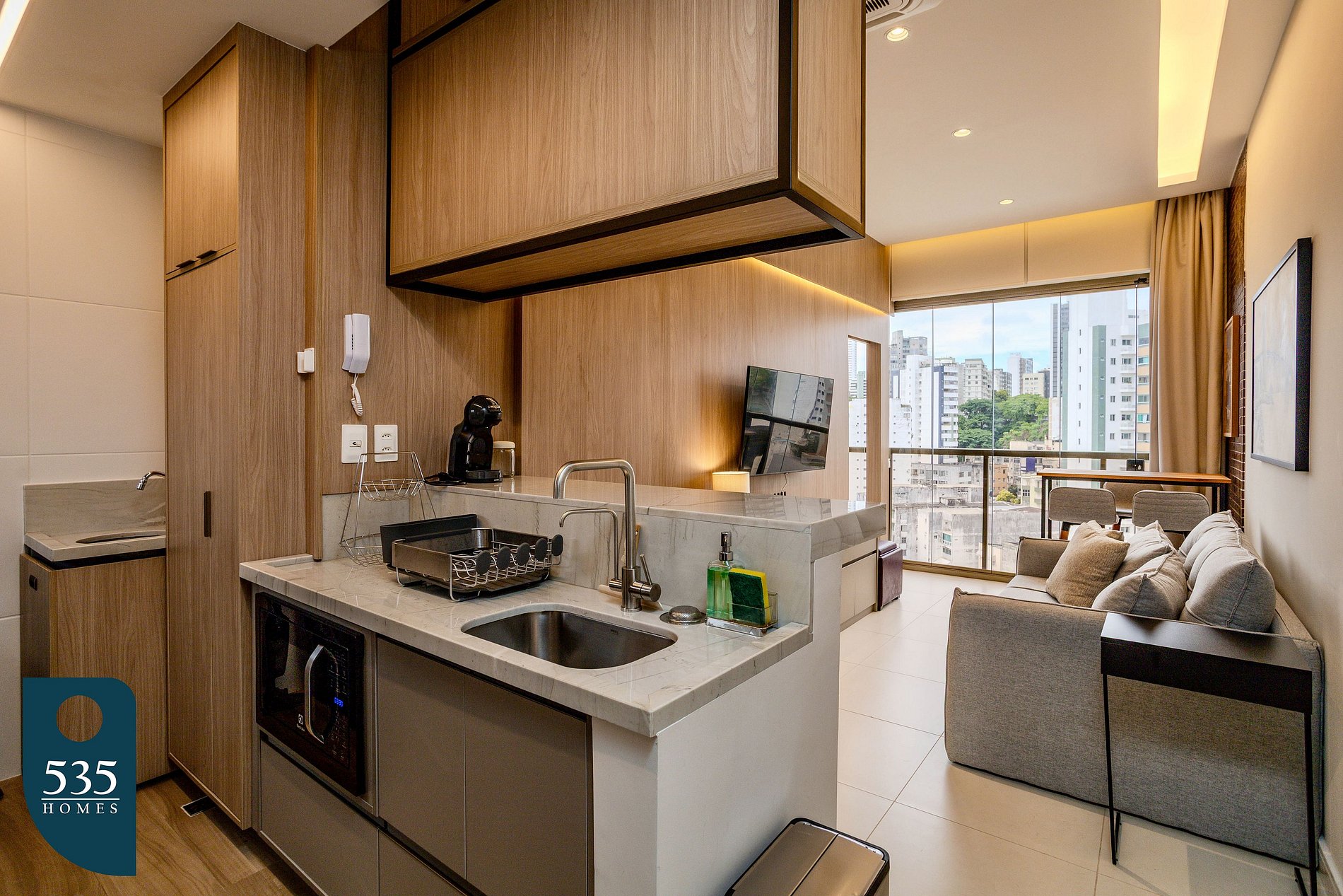 This short-term rental apartment offers comfort and functionality in every space. The kitchen features a window with roller blind and insect screen, refrigerator, four-burner gas cooktop, oven, air fryer, blender, electric coffee maker, coffee machine, Italian coffee maker, electric kettle, sandwich maker, microwave, dessert, dinner and soup plates, pots with lids, a water purifier attached to the faucet, and a sink faucet with water heater.