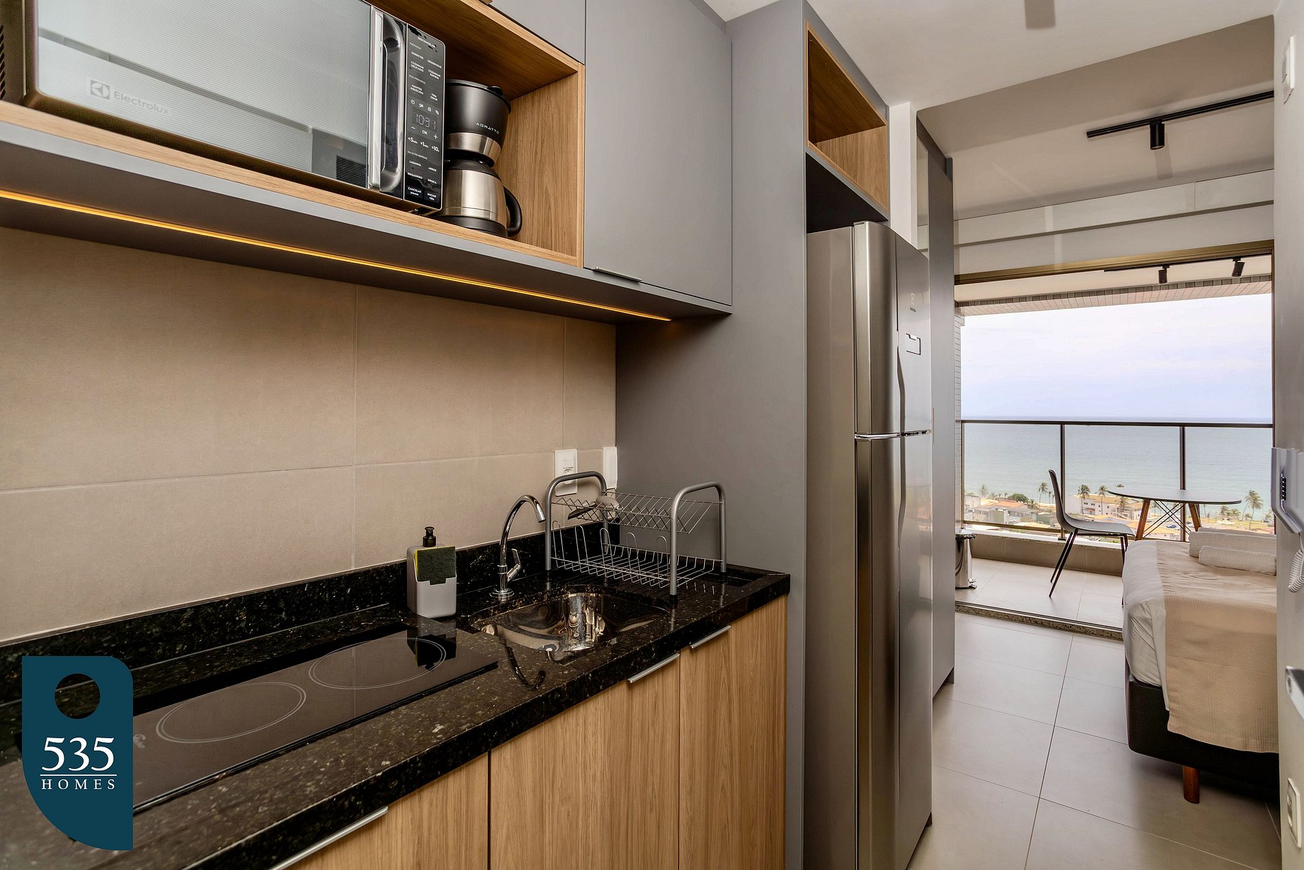 The apartment features a kitchen equipped with a two-burner ceramic cooktop, refrigerator, microwave, electric coffee maker, Italian coffee maker, blender, sandwich maker, and a set of pots with lids, providing convenience for meal preparation. The bathroom includes an electric shower, exhaust fan, and hair dryer. In the bedroom, guests will find air conditioning, a 43" smart TV, blackout curtains, as well as an ironing board and electric iron for added comfort during the stay. The balcony is furnished with a table and chairs, offering a pleasant space to relax.