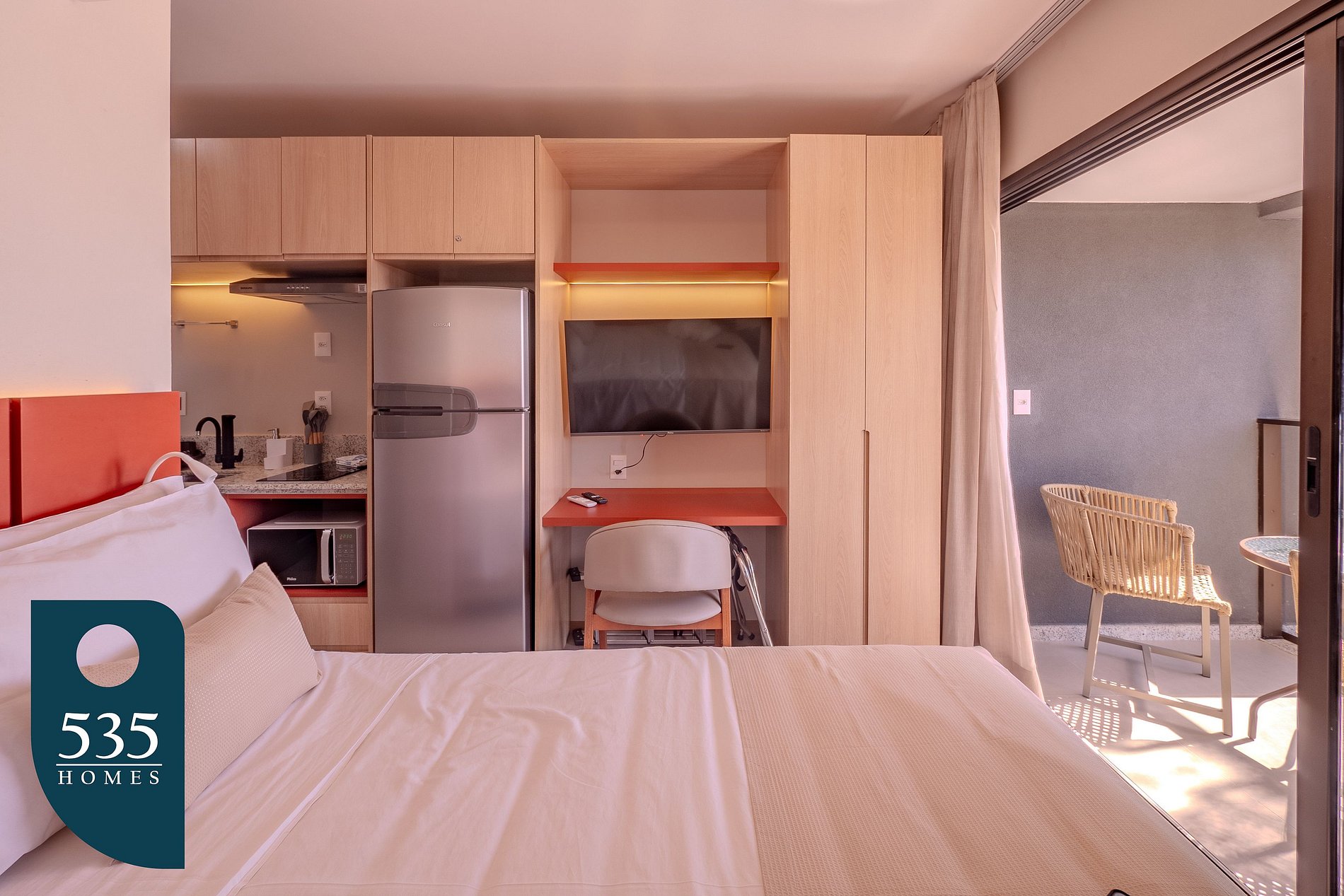 The apartment combines the entry area and kitchen into a functional space equipped with a full-length mirror, refrigerator, microwave, air extractor, a two-burner induction cooktop, blender, sandwich maker, coffee machine, and a faucet with a built-in water purifier, providing everyday convenience. The bathroom features an electric shower, window, and hair dryer. In the bedroom, guests will find air conditioning, a 50" smart TV, a dedicated workspace, an ironing board, an electric iron, and blackout curtains, ensuring comfort for both rest and remote work. The balcony is furnished with a table and chairs, offering a pleasant space to relax.