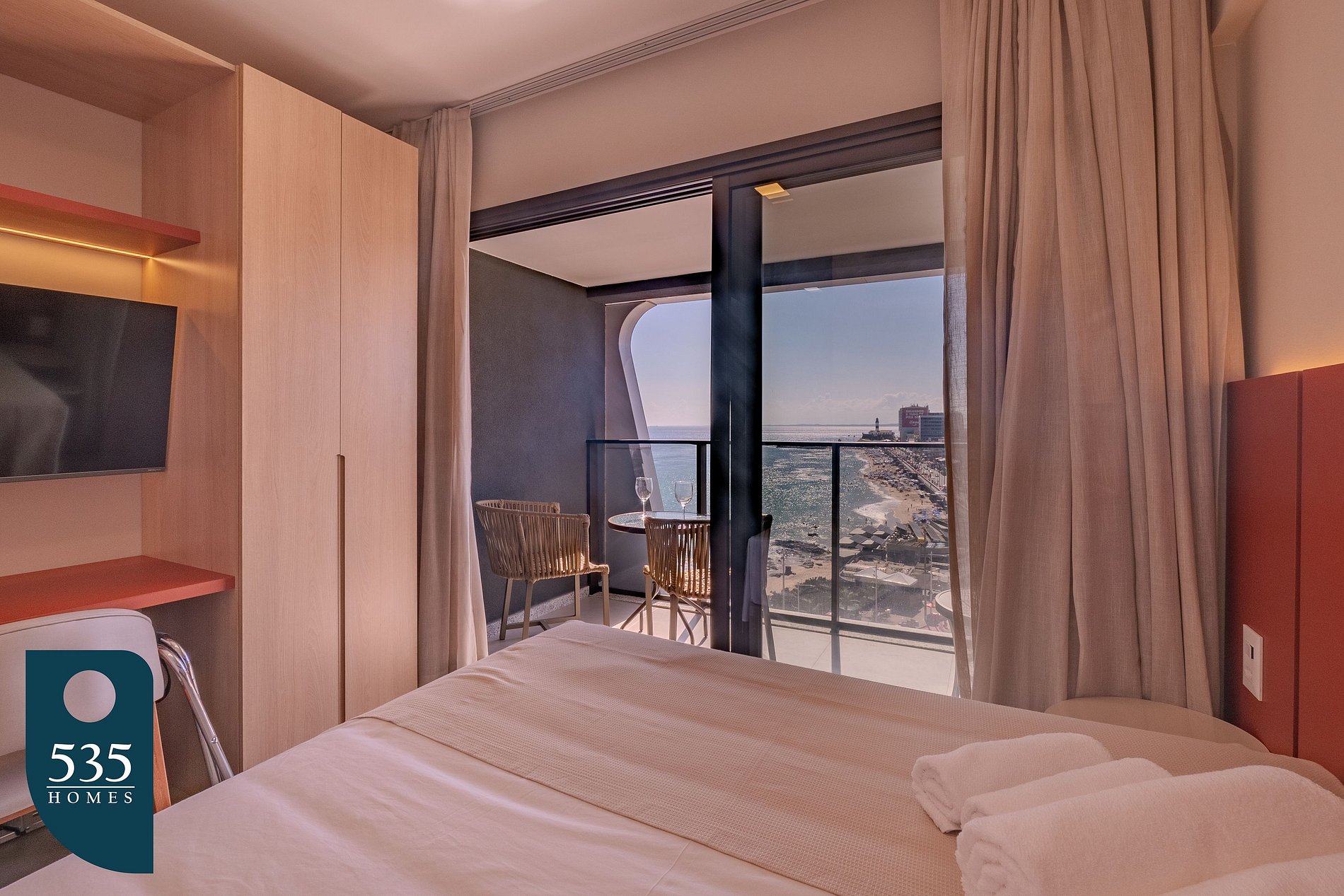 This vacation apartment is located on Barra’s main waterfront, in Salvador, on the 7th floor, with a wide view of the ocean and the Carnival circuit. Its elevated position allows guests to follow the festivities from above while being just steps from the beach and the promenade.