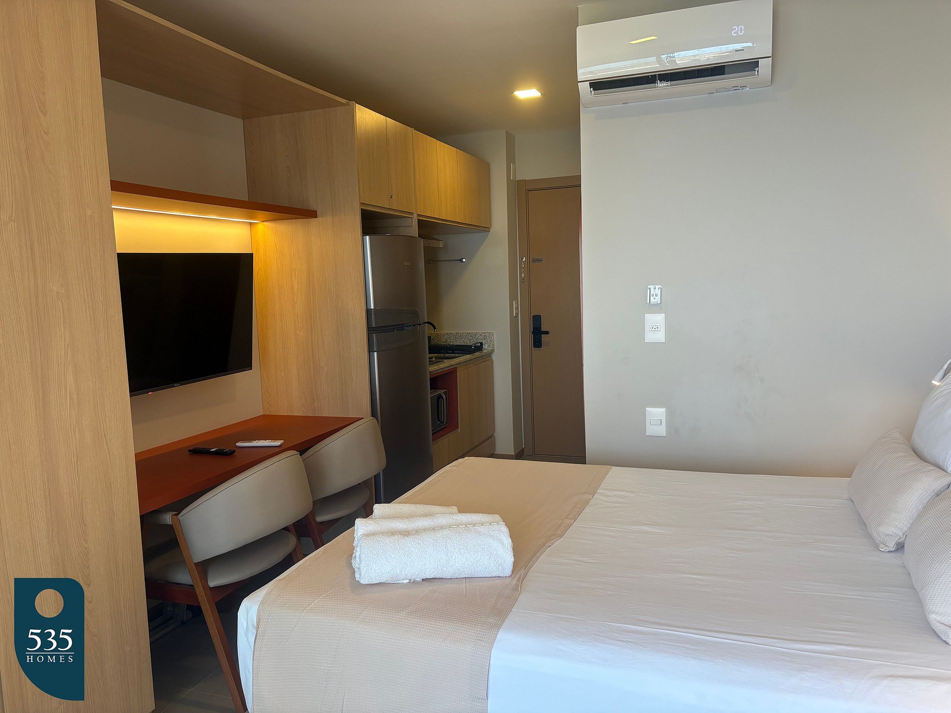 The apartment combines the entry area and kitchen into a functional space equipped with a full-length mirror, refrigerator, microwave, air extractor, a two-burner induction cooktop, blender, sandwich maker, italian coffee maker, coffee machine, and a faucet with a built-in water purifier, providing everyday convenience. The bathroom includes an electric shower, exhaust fan, and hair dryer. In the bedroom, guests will find air conditioning, a 50" smart TV, a dedicated workspace, an ironing board, an electric iron, and blackout curtains, ensuring comfort for both rest and remote work. The balcony is furnished with a table and chairs, offering a pleasant space to relax.