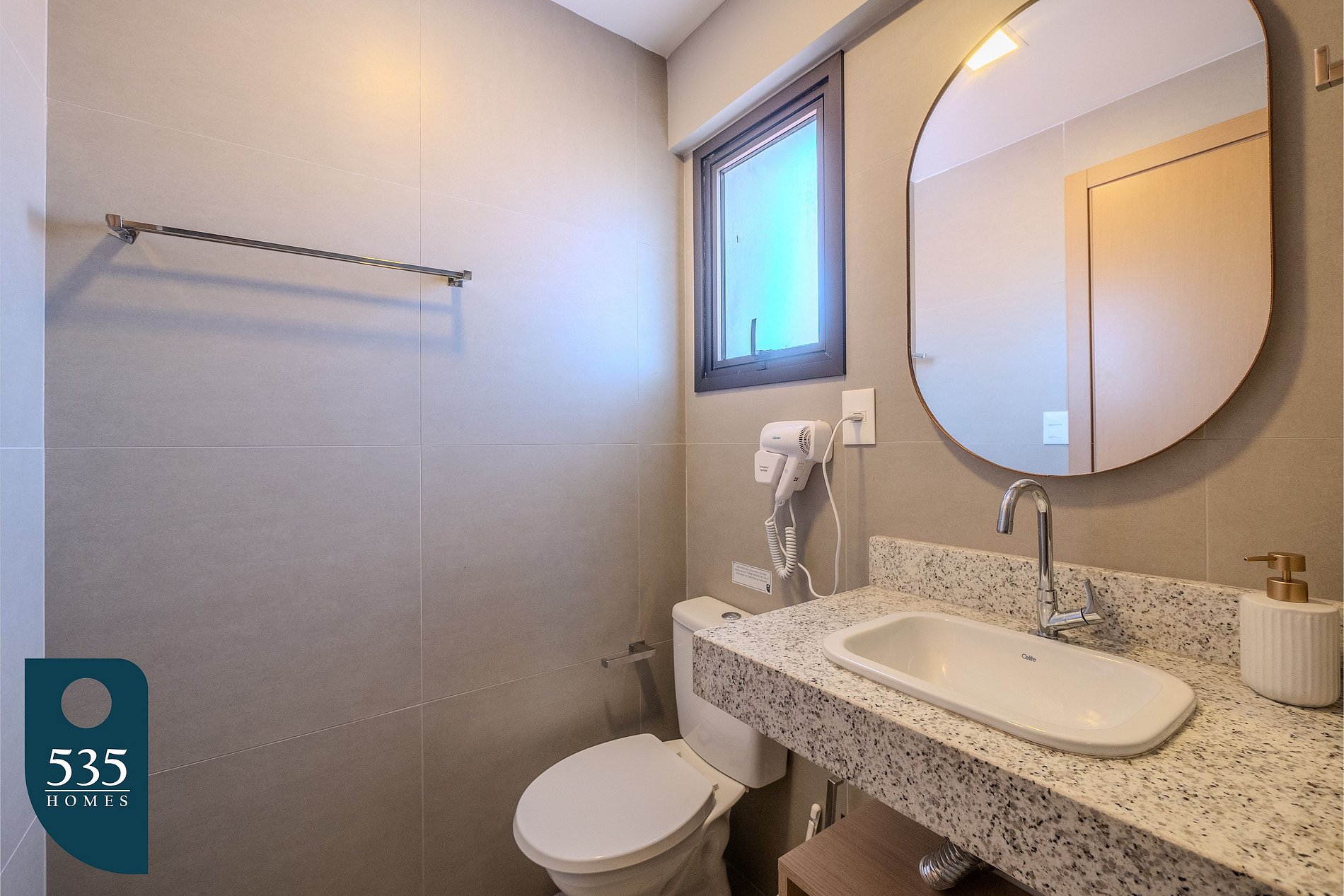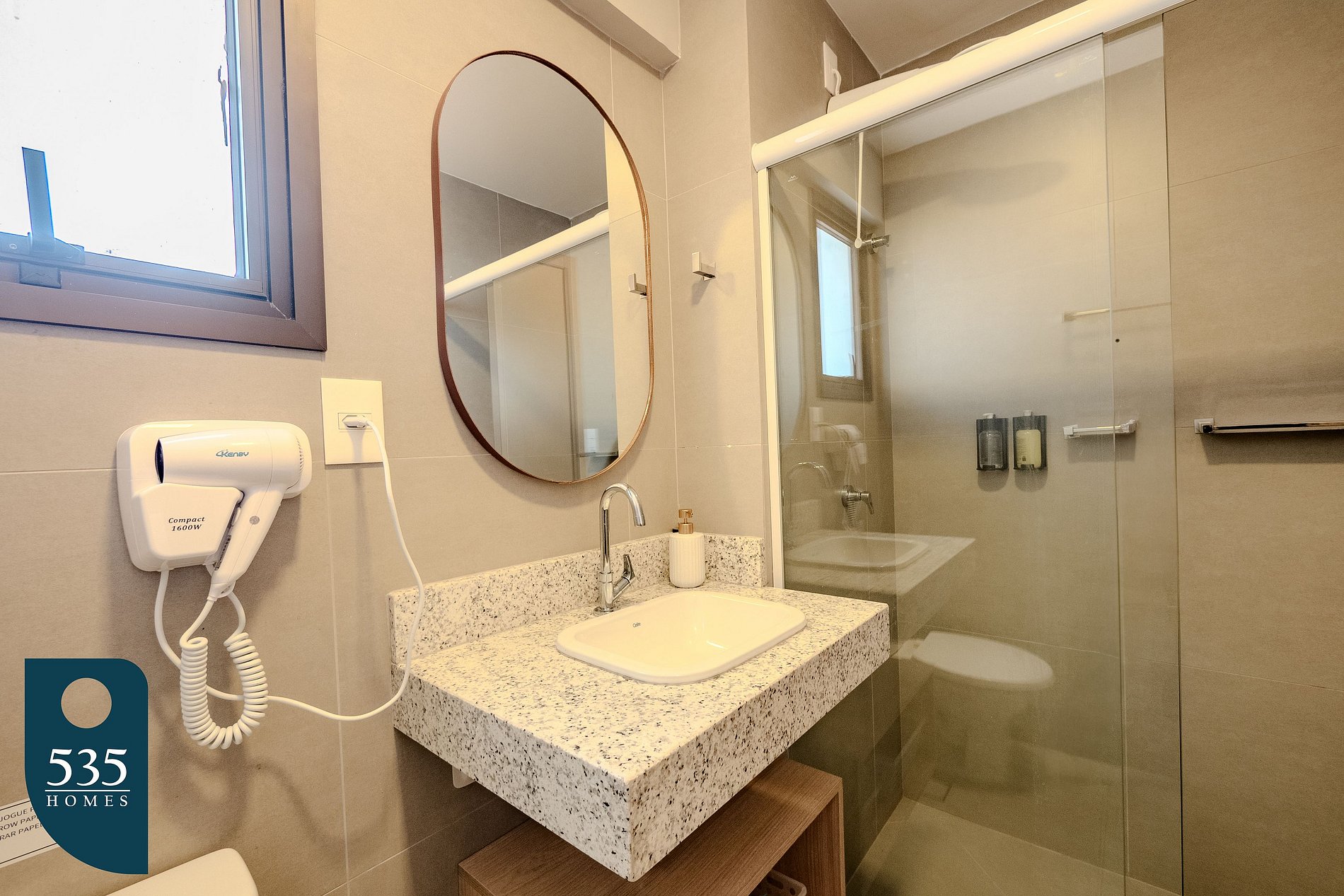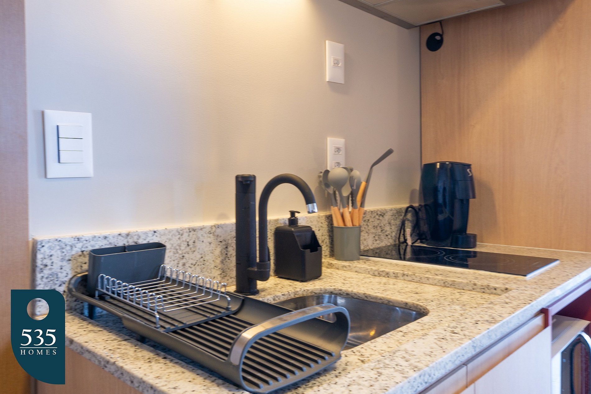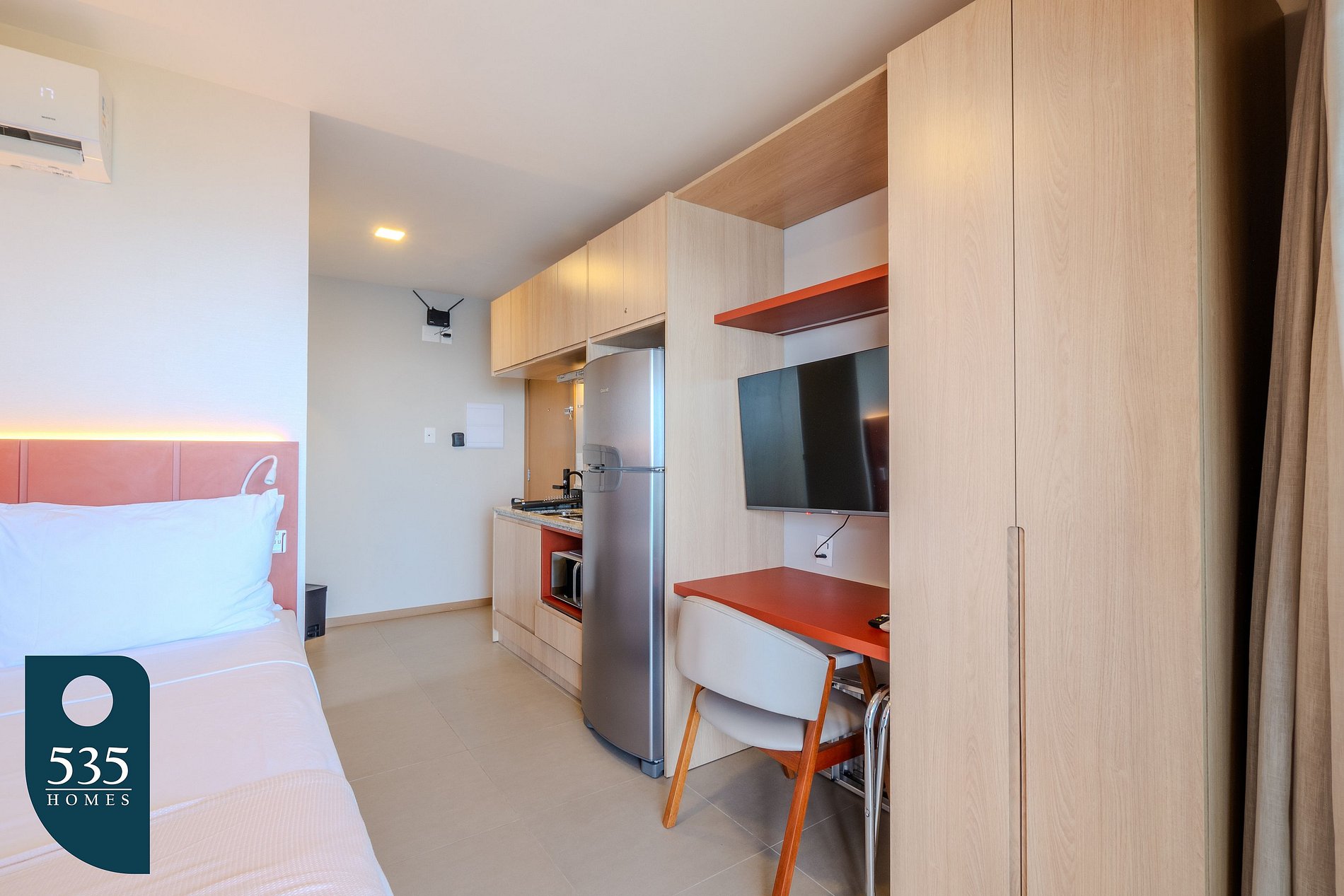 The apartment combines the entry area and kitchen into a functional space equipped with a full-length mirror, refrigerator, microwave, air extractor, a two-burner induction cooktop, blender, sandwich maker, italian coffee maker, coffee machine, and a faucet with a built-in water purifier, providing everyday convenience. The bathroom features an electric shower, window, vanity mirror, and hair dryer. In the bedroom, guests will find air conditioning, a 50" smart TV, a dedicated workspace, an ironing board, an electric iron, and blackout curtains, ensuring comfort for both rest and remote work. The balcony is furnished with a table and chairs, offering a pleasant space to relax.