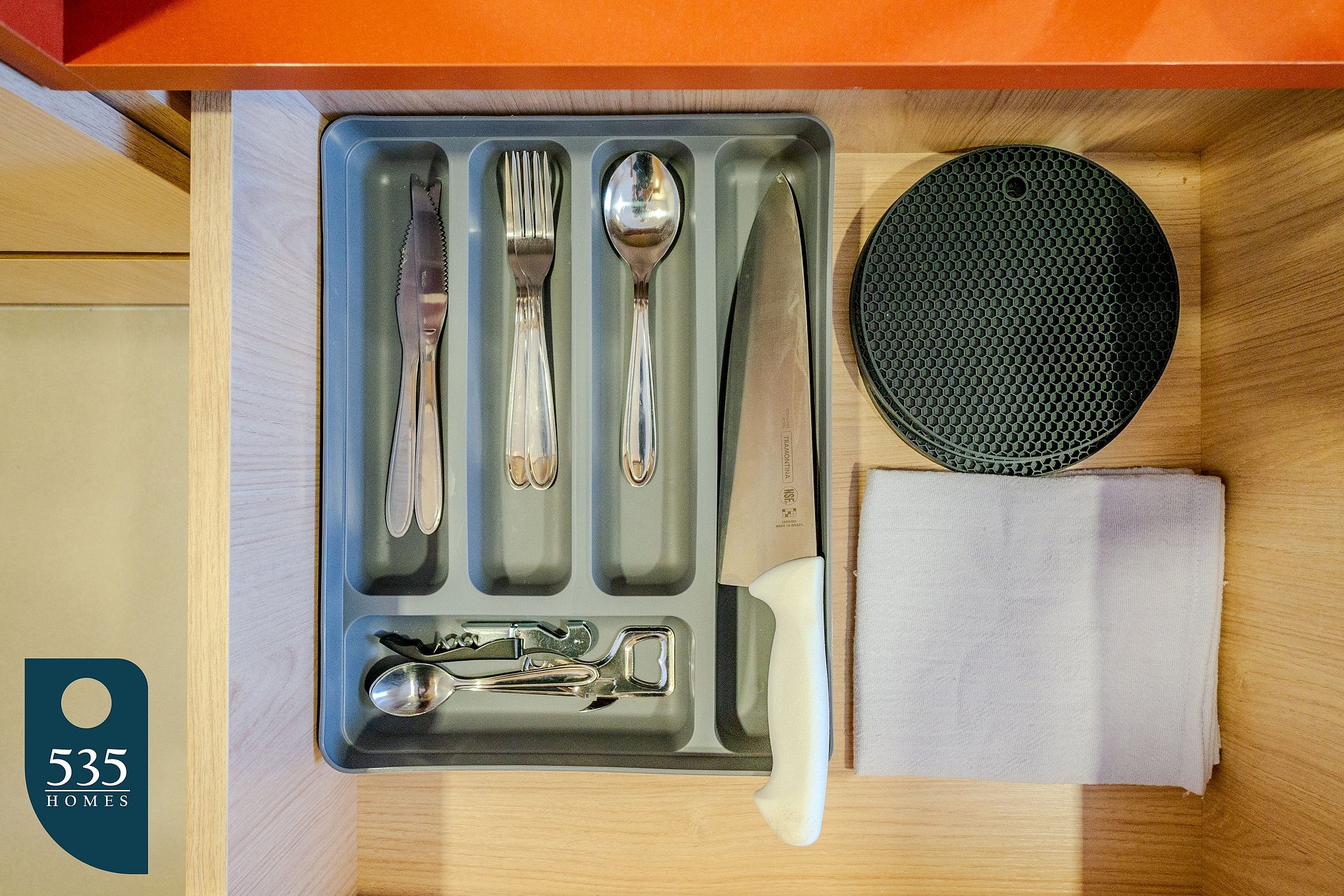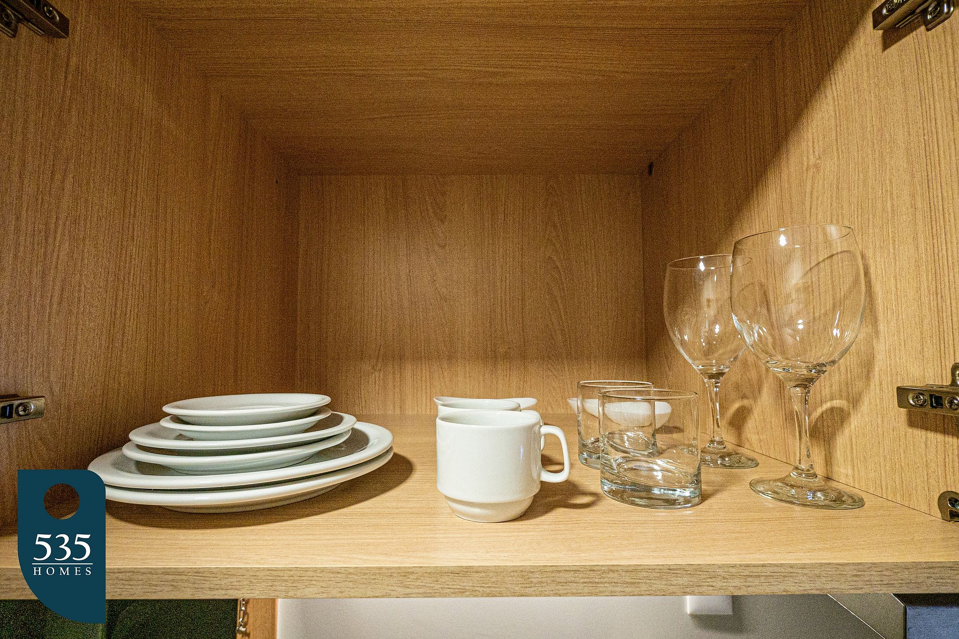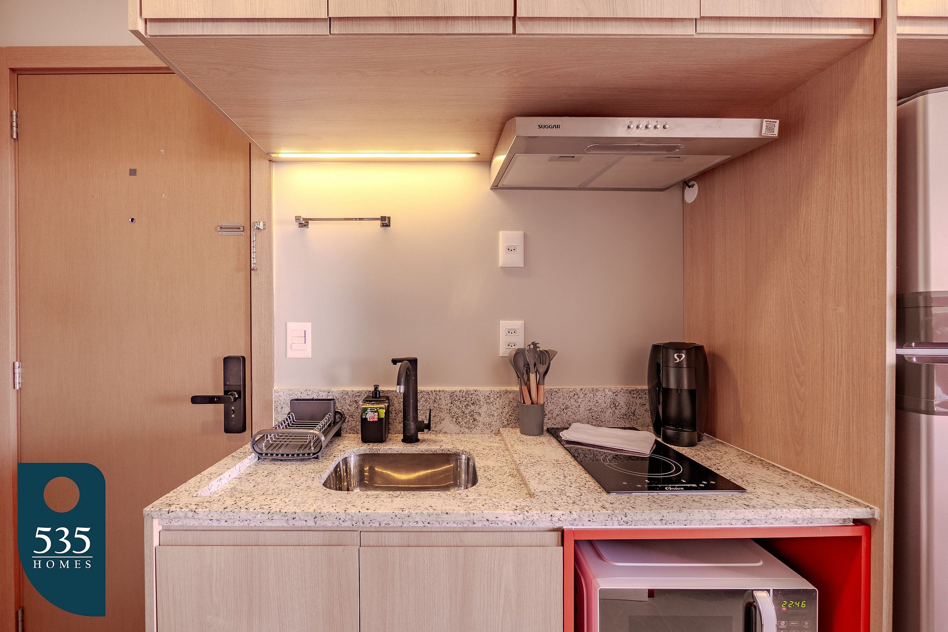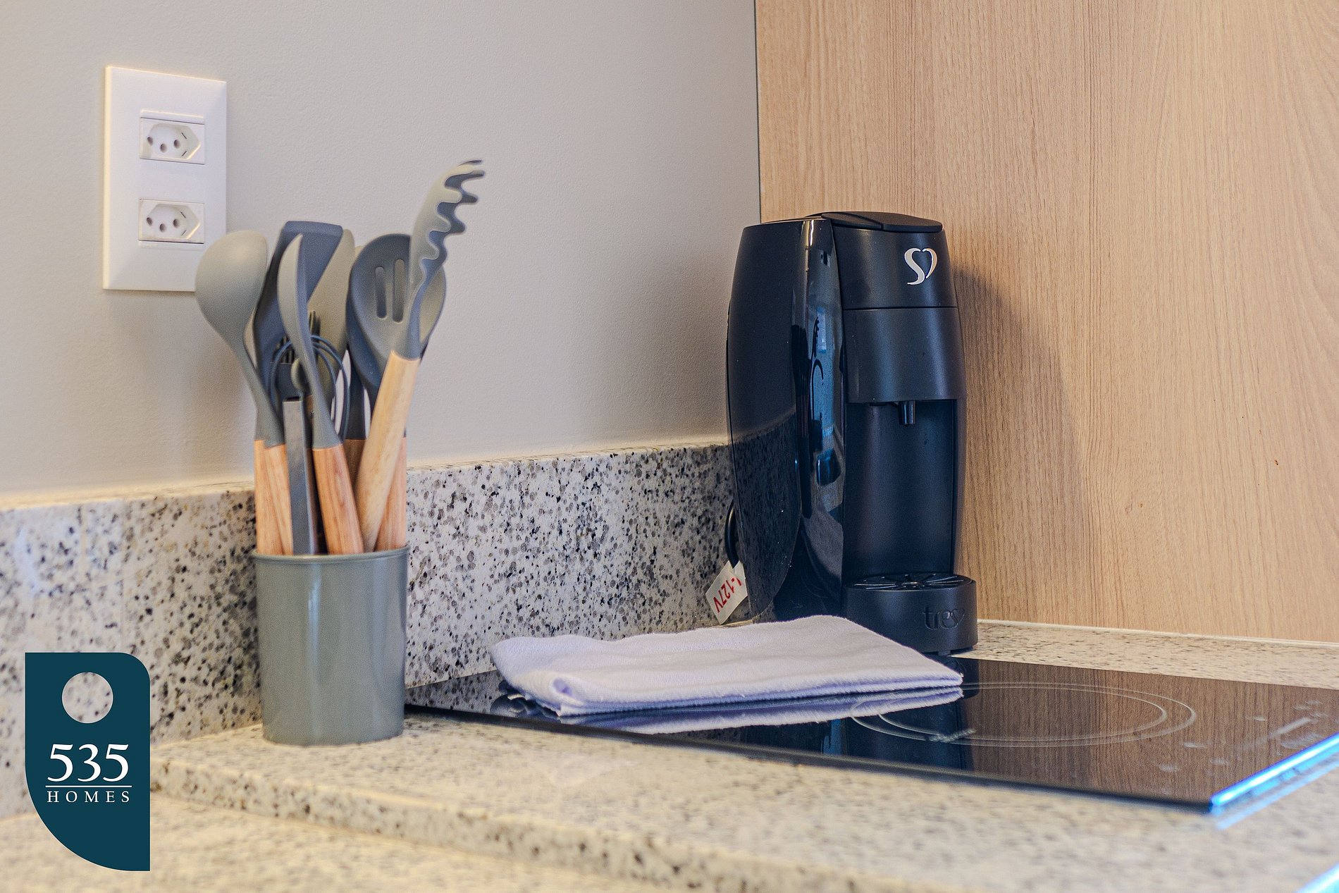 The apartment combines the entry area and kitchen into a functional space equipped with a full-length mirror, refrigerator, microwave, air extractor, a two-burner induction cooktop, blender, sandwich maker, italian coffee maker, coffee machine, and a faucet with a built-in water purifier, providing everyday convenience. The bathroom features an electric shower, window, and hair dryer. In the bedroom, guests will find air conditioning, a 50" smart TV, a dedicated workspace, an ironing board, an electric iron, and blackout curtains, ensuring comfort for both rest and remote work. The balcony is furnished with a table and chairs, offering a pleasant space to relax.