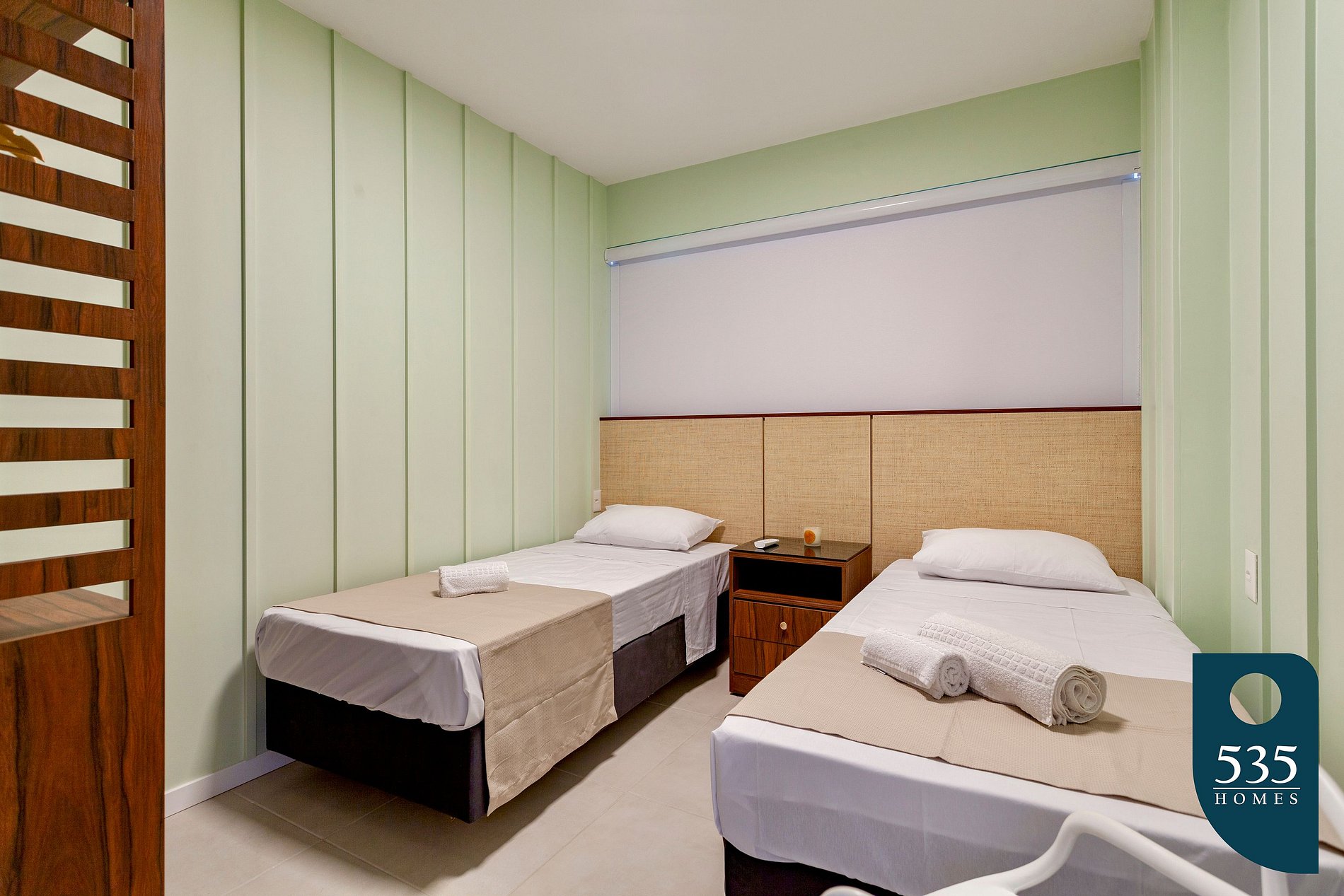 Room with 2 single beds, wardrobe, and split air conditioning.