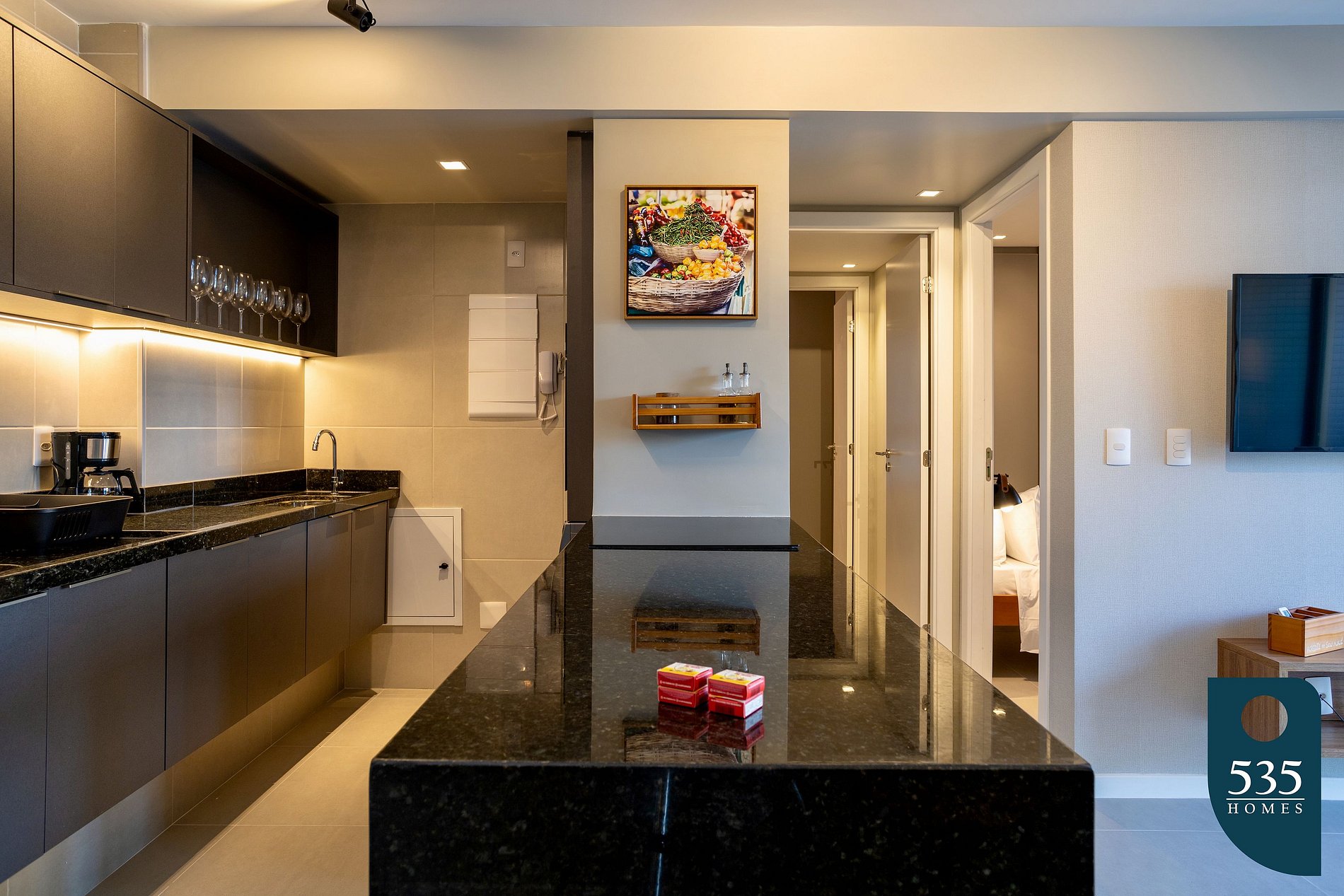 O apartamento é uma graça, muito confortável, tudo organizado.