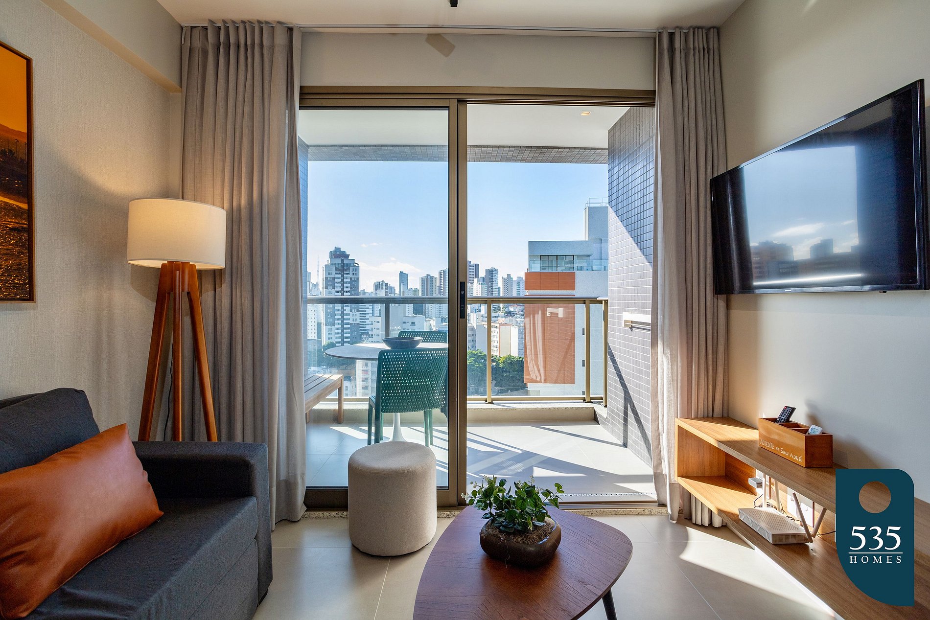 Na sala Sofá-cama, Smart TV e acesso a varanda com mesa para desfrutar de refeições apreciando a vista. No quarto, Suíte com cama de casal e Ar condicionado.