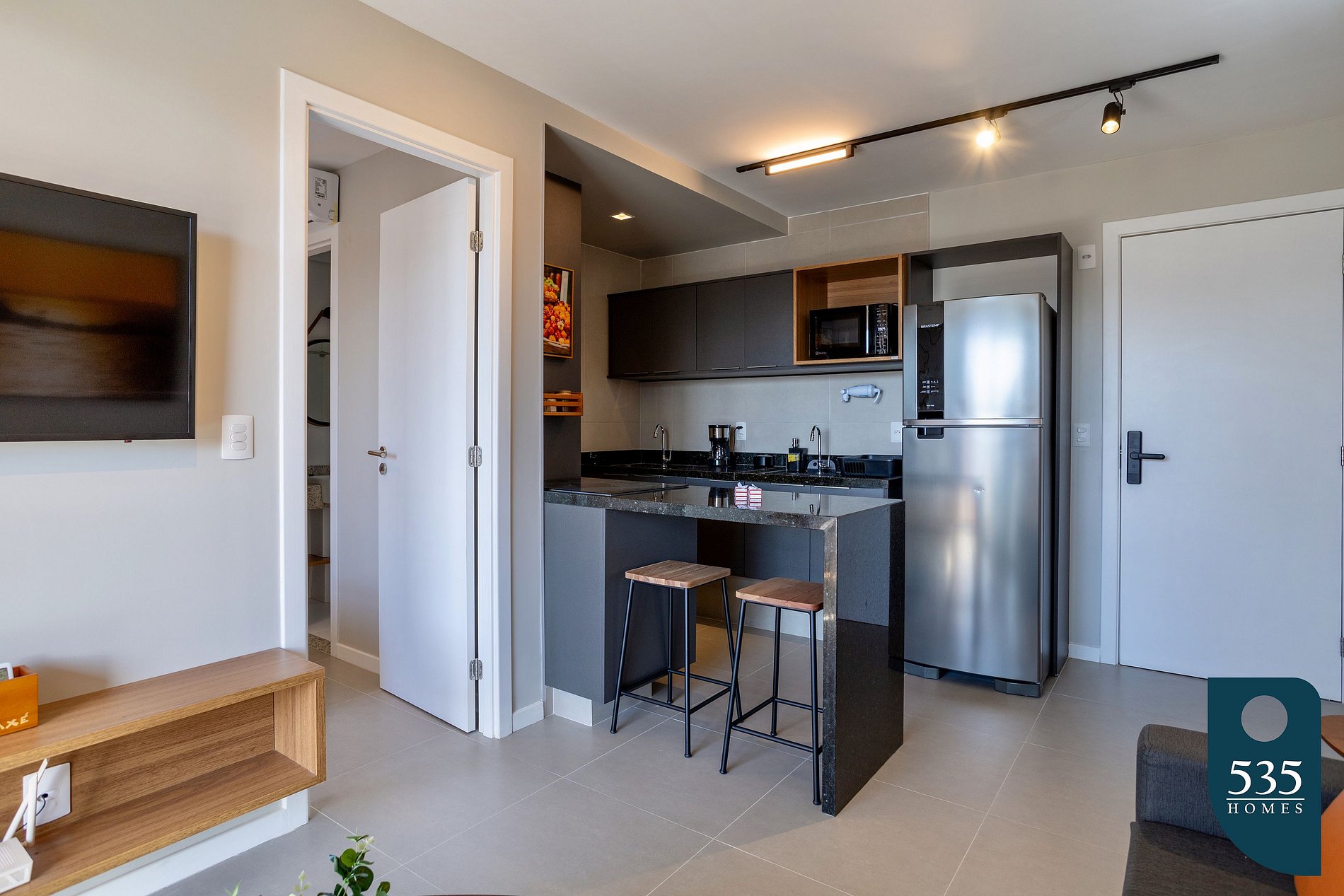Ótima acomodação. Exatamente como nas fotos. Possui todos os utensílios necessários para fazer comida; Fomos recebidas com mimos na geladeira; O prédio é novo, possui um rooftop com uma vista linda, e os funcionários são super solícitos.