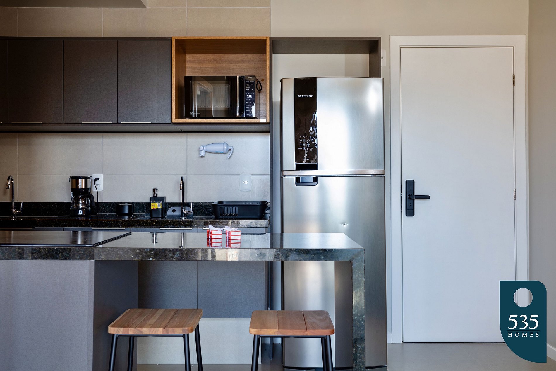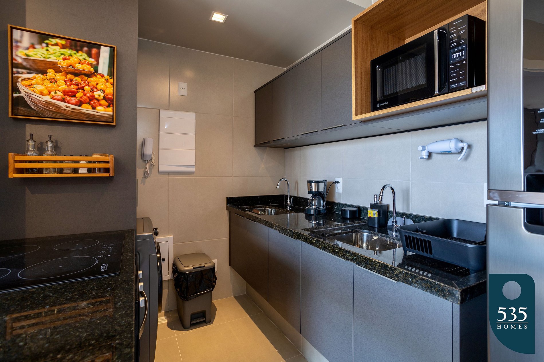 Cozinha completa com Geladeira, Cooktop, Micro-ondas, Forno e utensílios de cozinha.