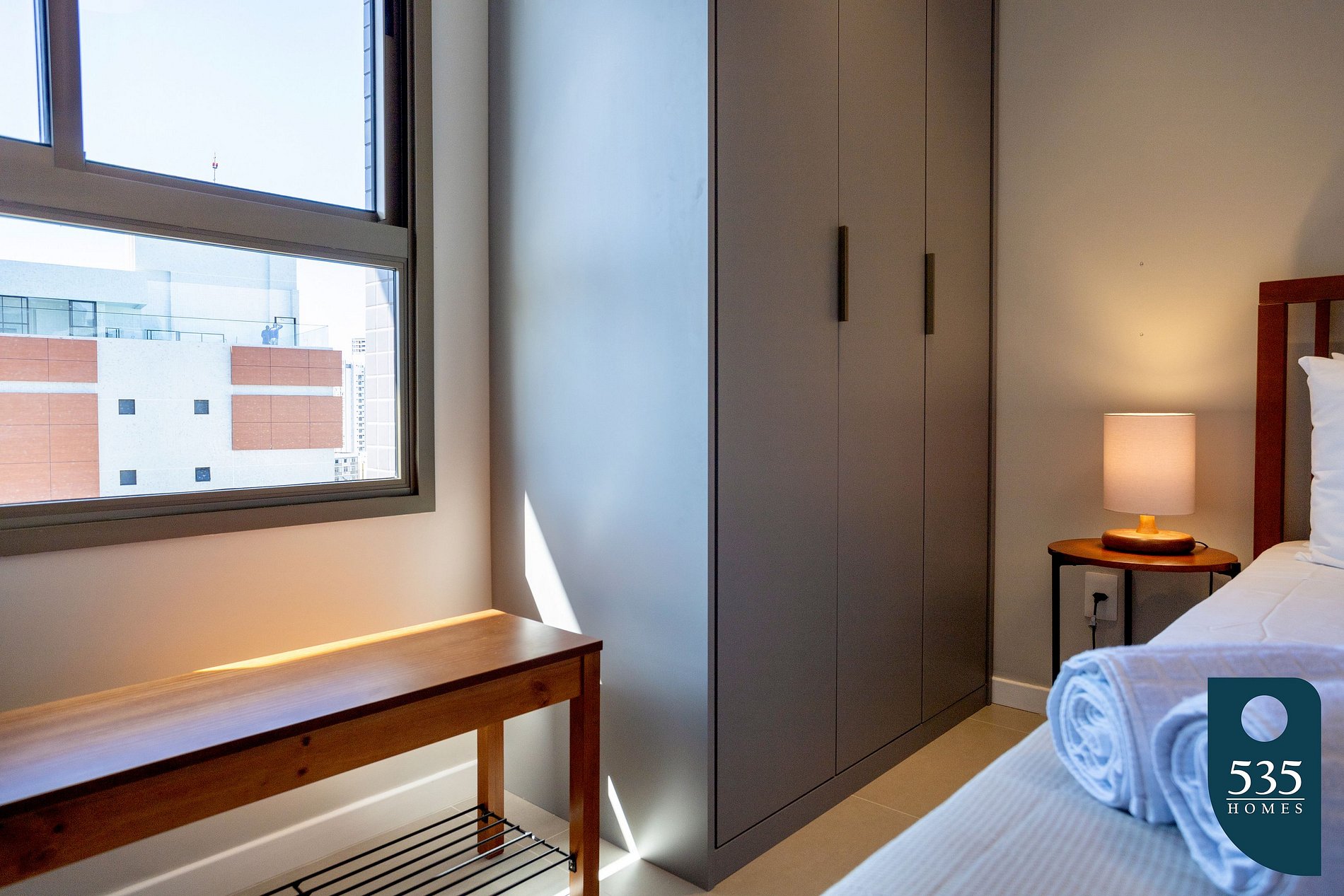 Ótima acomodação. Exatamente como nas fotos. Possui todos os utensílios necessários para fazer comida; Fomos recebidas com mimos na geladeira; O prédio é novo, possui um rooftop com uma vista linda, e os funcionários são super solícitos.