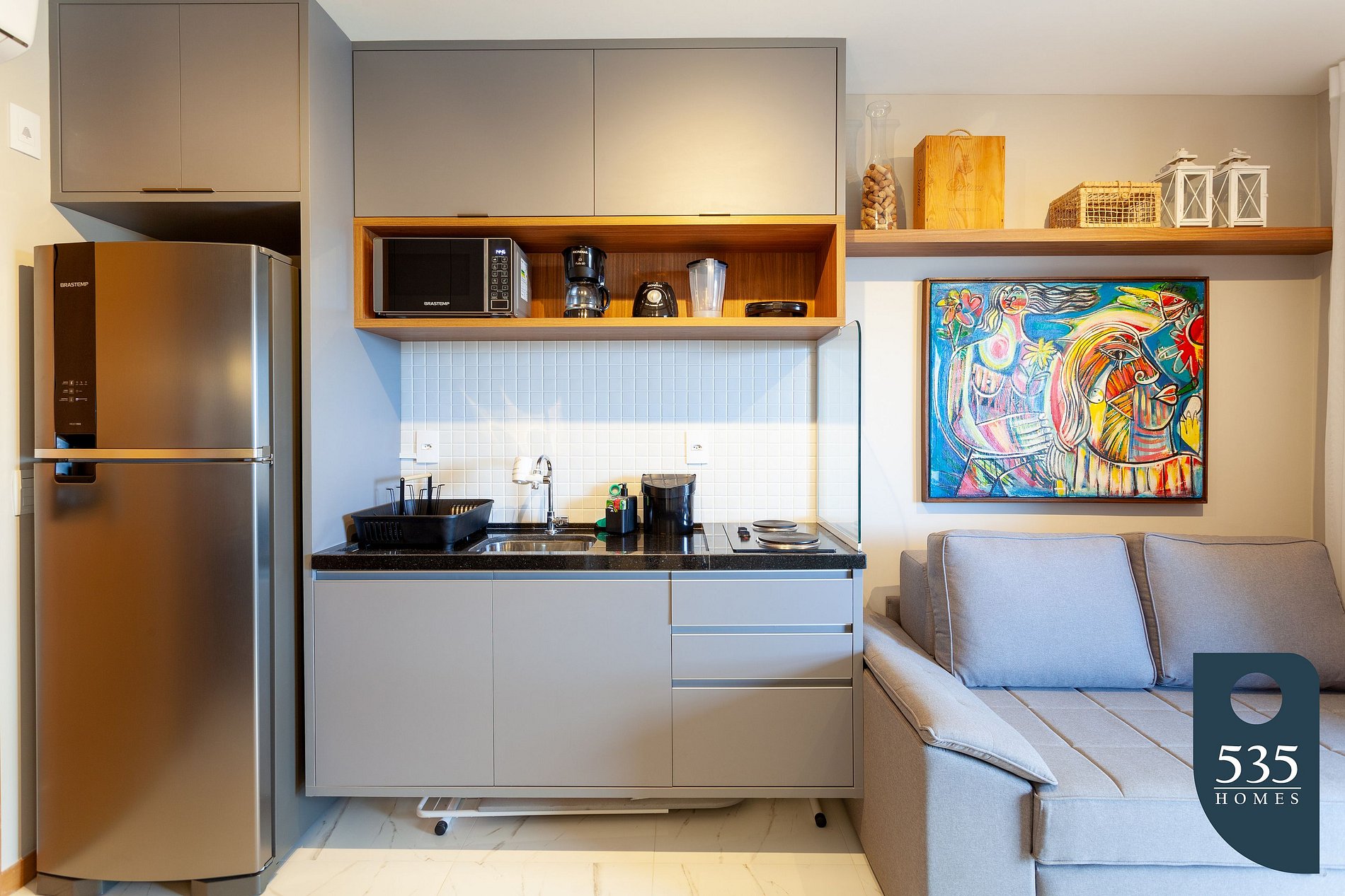 The space is very well-equipped with a 43" Smart LED TV, Split air conditioning in the bedroom and living room, 300Mbps Wi-Fi Internet, Refrigerator, Blender, Microwave, Electric drip coffee maker, Dulce Gusto capsule coffee maker, Sandwich grill, Water filter, Hairdryer, and Iron with an ironing board.