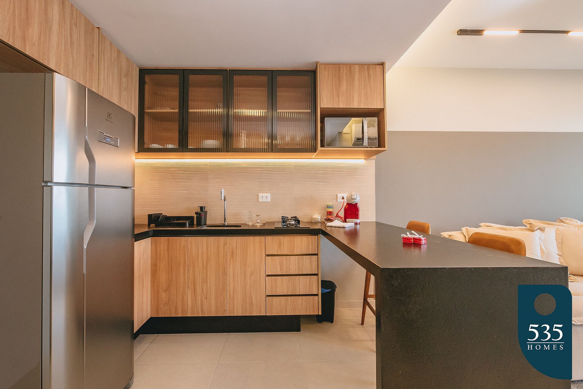 Fully furnished and well-equipped apartment with a queen bed and a double sofa bed, ideal for a comfortable and practical stay. The kitchen features a microwave, refrigerator, two-burner gas stove, water filter, and a counter with two chairs for quick meals. For your convenience, there is also a washing machine, capsule coffee maker, blender, and toaster.