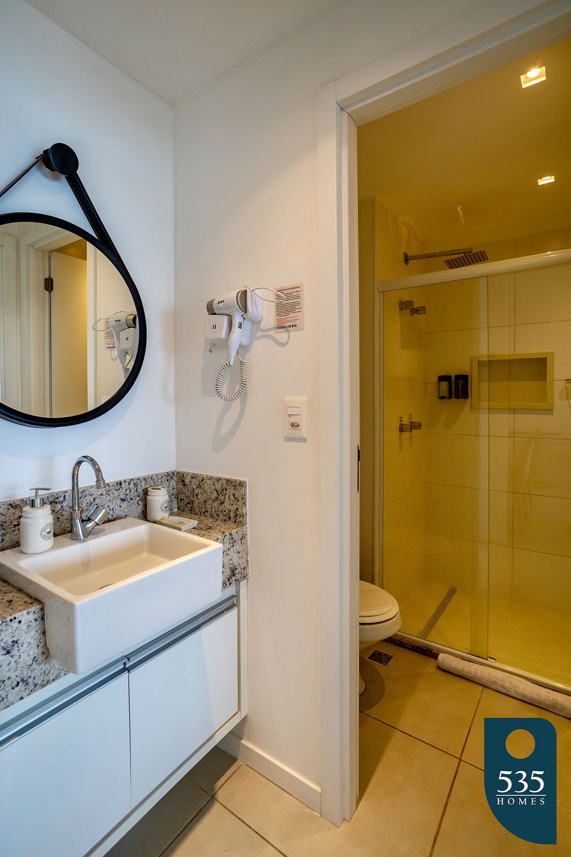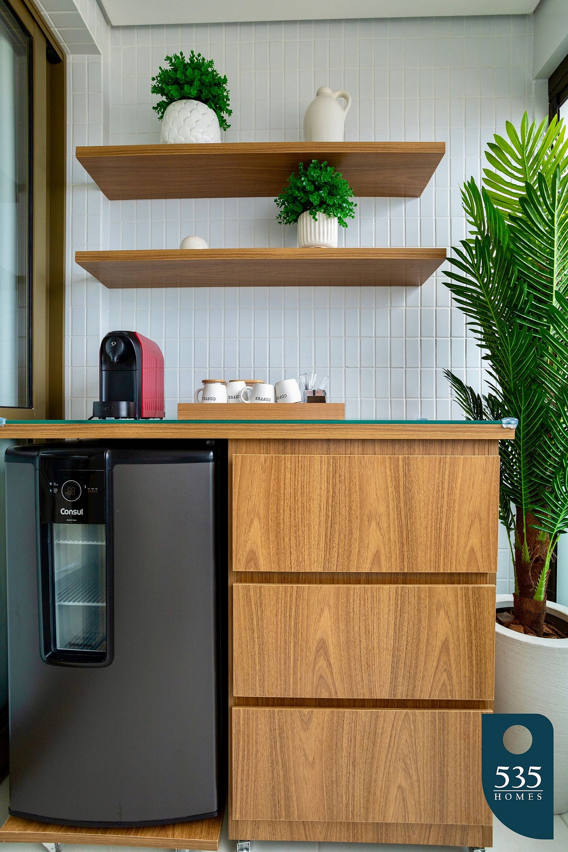 The glass-enclosed balcony is an additional living space that can be fully opened or closed, offering a breathtaking view of the sea. Enjoy the gourmet area, which includes a Três Corações capsule coffee maker and a beer fridge, perfect for keeping your drinks at the ideal temperature while you take in the view or unwind with a drink.
