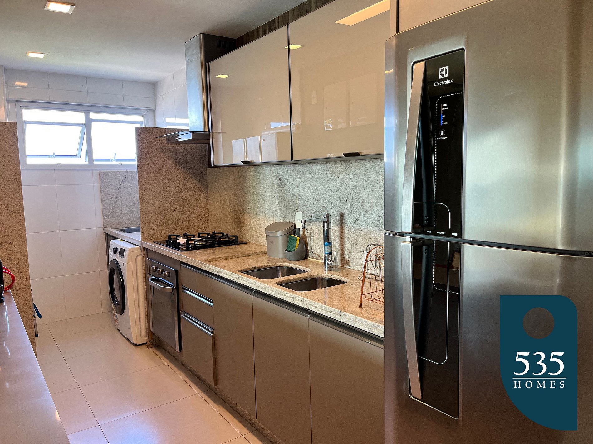 Fully equipped kitchen with refrigerator, oven, 4-burner cooktop, water filter, washer and dryer machine, microwave.