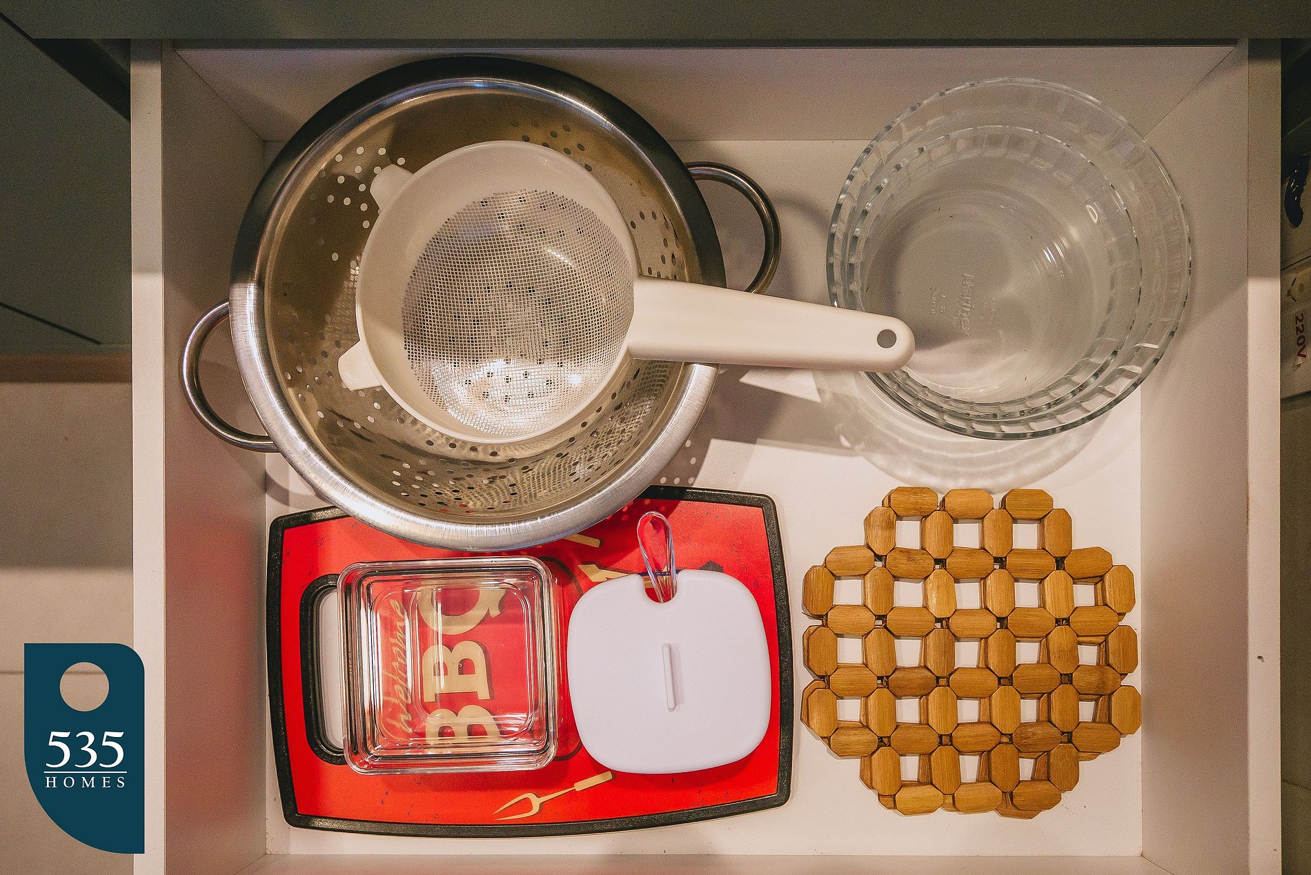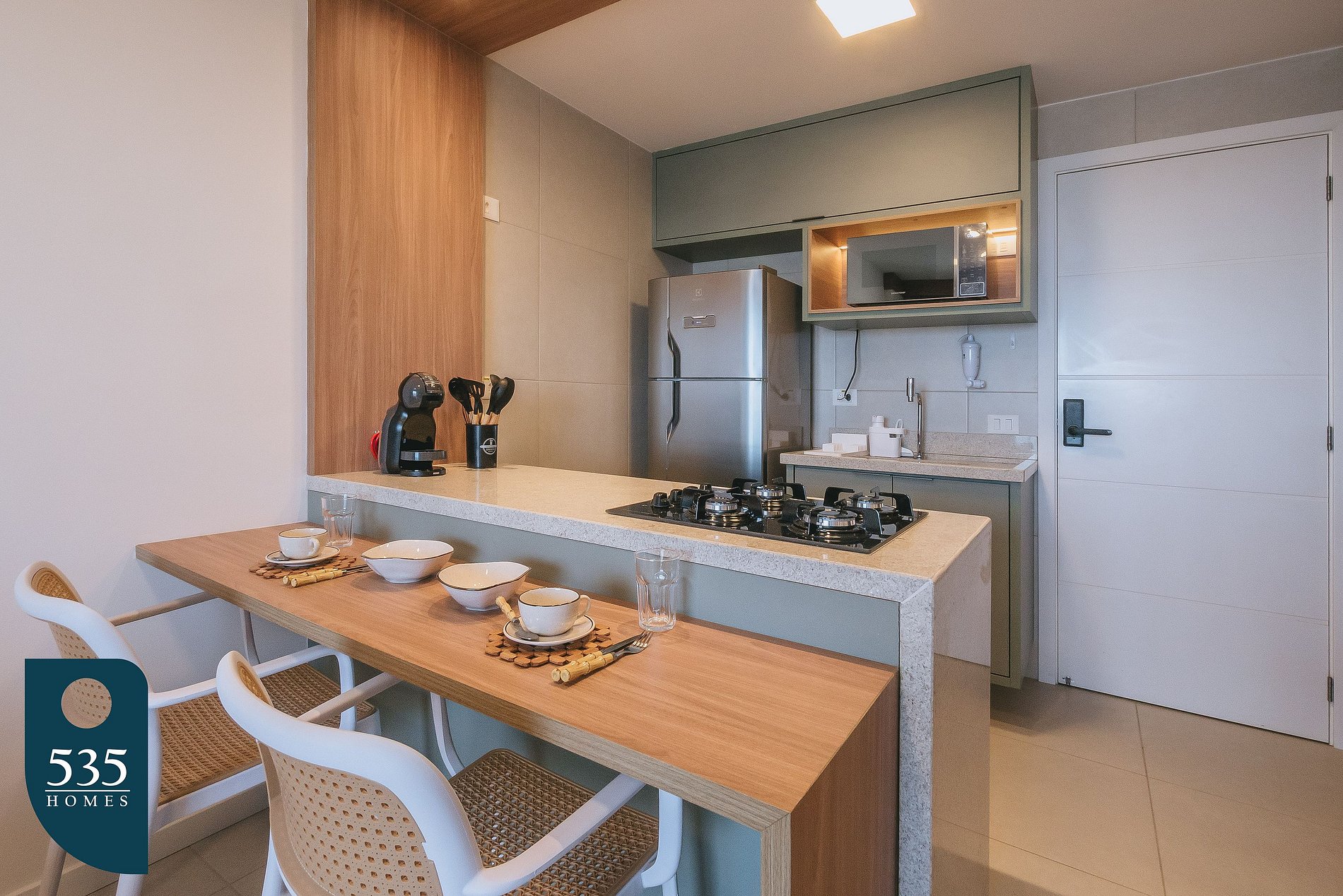 The apartment's kitchen is equipped with everything you need to prepare delicious and quick meals, including a 4-burner gas cooktop. For drinks and snacks, you have a blender, microwave, air fryer, and sandwich maker at your disposal. Furthermore, the refrigerator and water purifier ensure the preservation of food and the quality of water throughout your stay.
