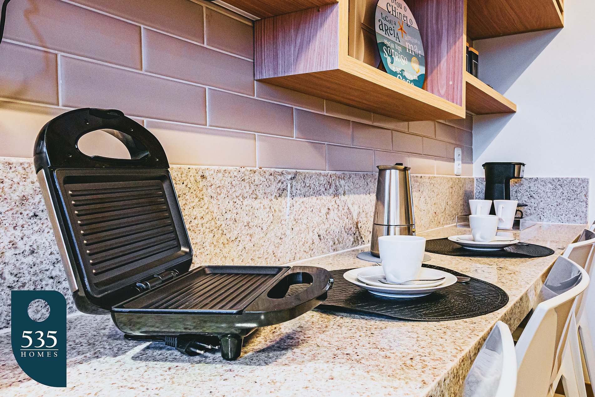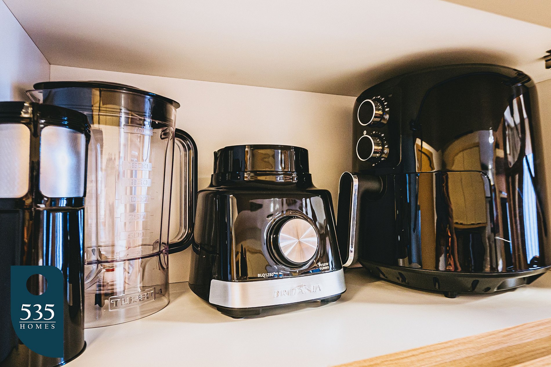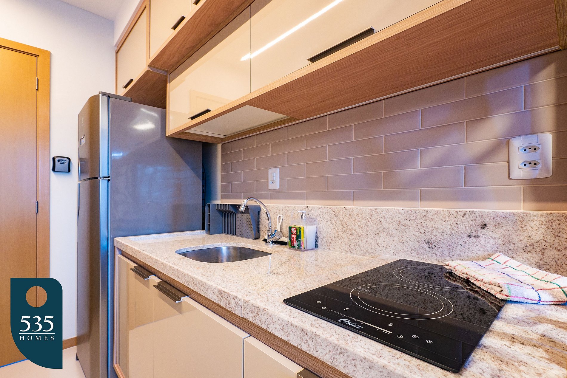 The kitchen is fitted with modern and versatile appliances, including a refrigerator, microwave, two-burner induction cooktop, blender, sandwich maker, and air fryer, providing everything you need to prepare your meals in a practical and tasty way.