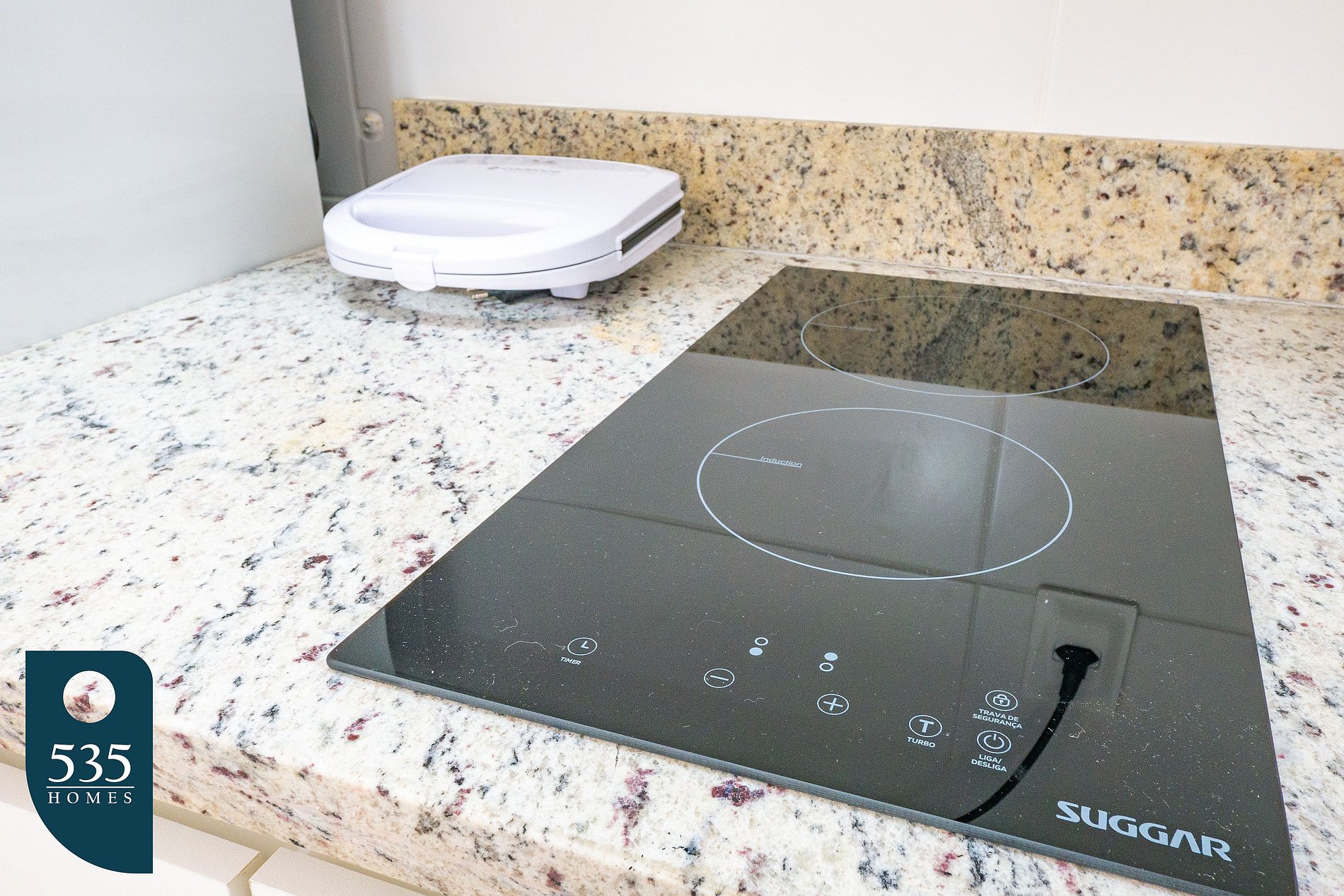 In the living room area, enjoy a 43" Smart TV for moments of leisure and entertainment. The kitchen is fully equipped with everything you need for a comfortable stay, including a blender, refrigerator, sandwich maker, two-burner induction cooktop, water purifier, and much more.