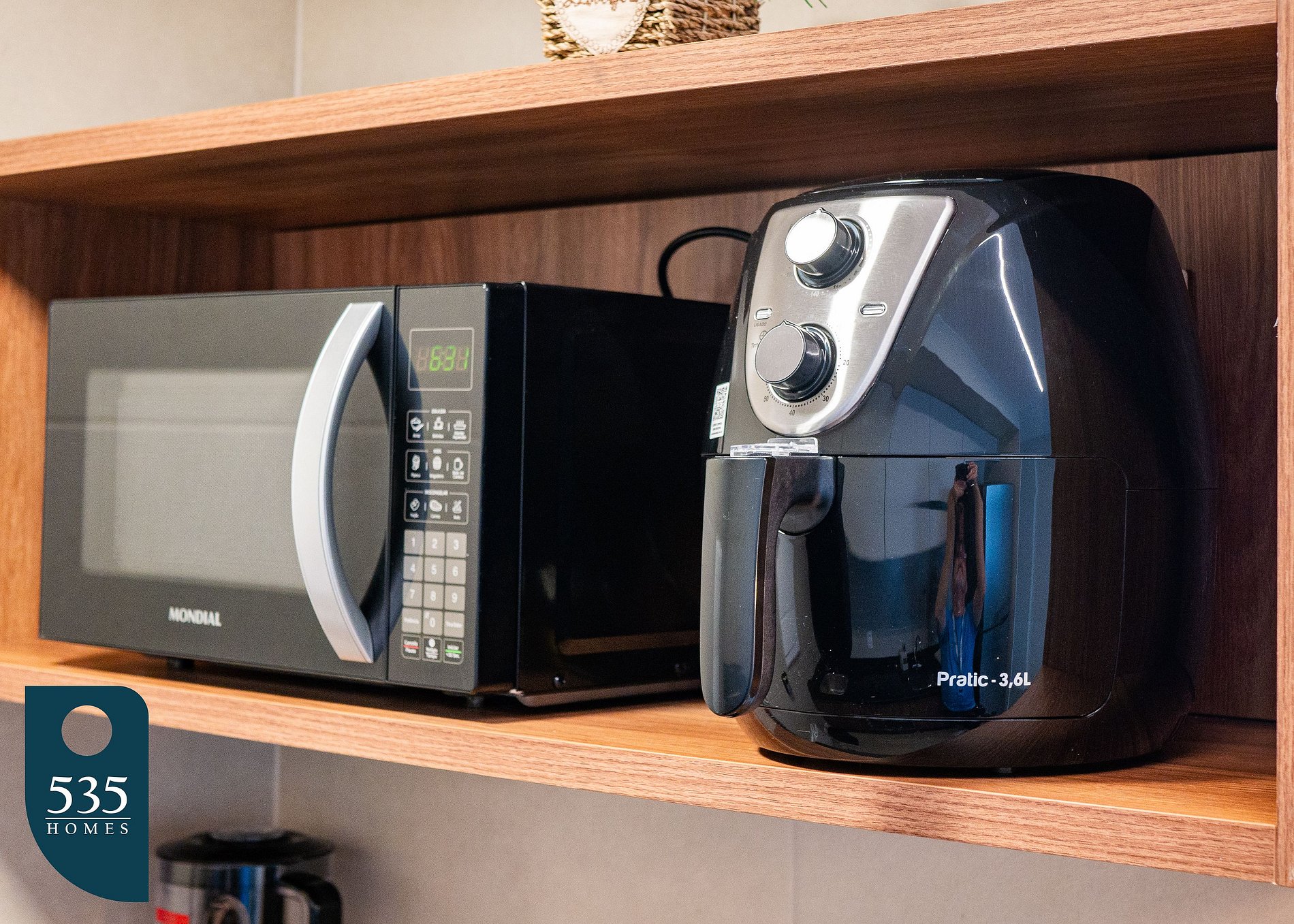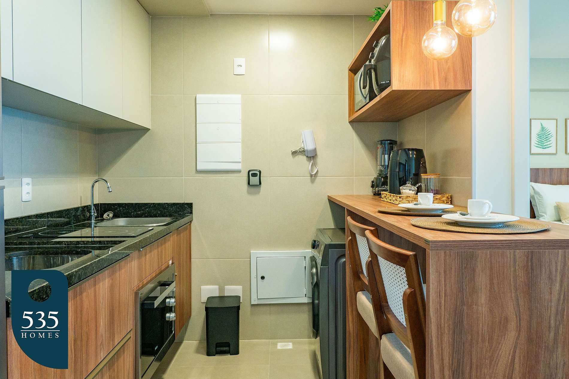 The kitchen is fully equipped with a 2-burner cooktop, electric oven, microwave, air fryer, sandwich maker, capsule coffee machine, Italian coffee maker, and a blender. It also features a refrigerator, washing machine, and a water purifier—everything you need for a practical and comfortable stay.