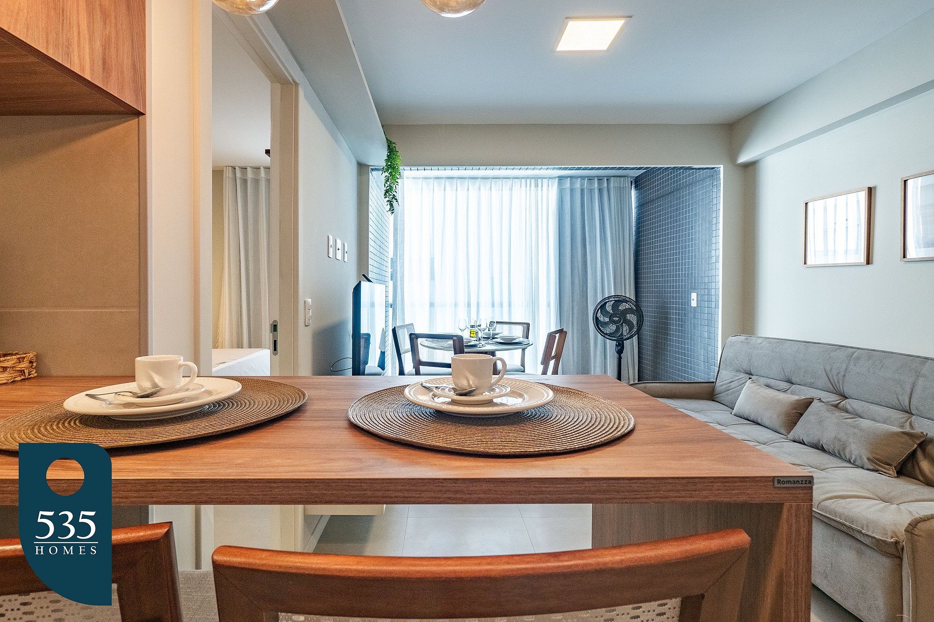 In the living room, you'll find a cozy space with a standing fan, a 50” Smart TV, and a dining table with chairs—perfect for relaxing or enjoying a meal.