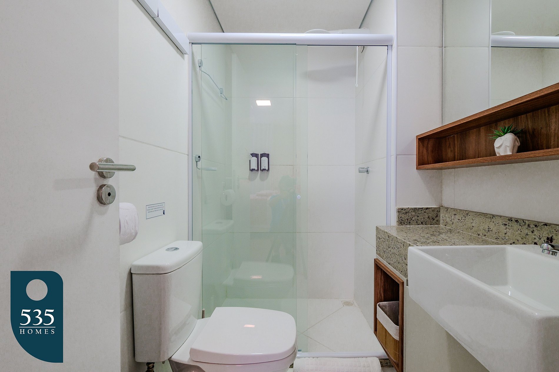 The bathroom is complete and functional, with an exhaust fan, bidet shower, hair dryer, collapsible bucket, and a compact retractable drying rack that saves space without compromising utility.