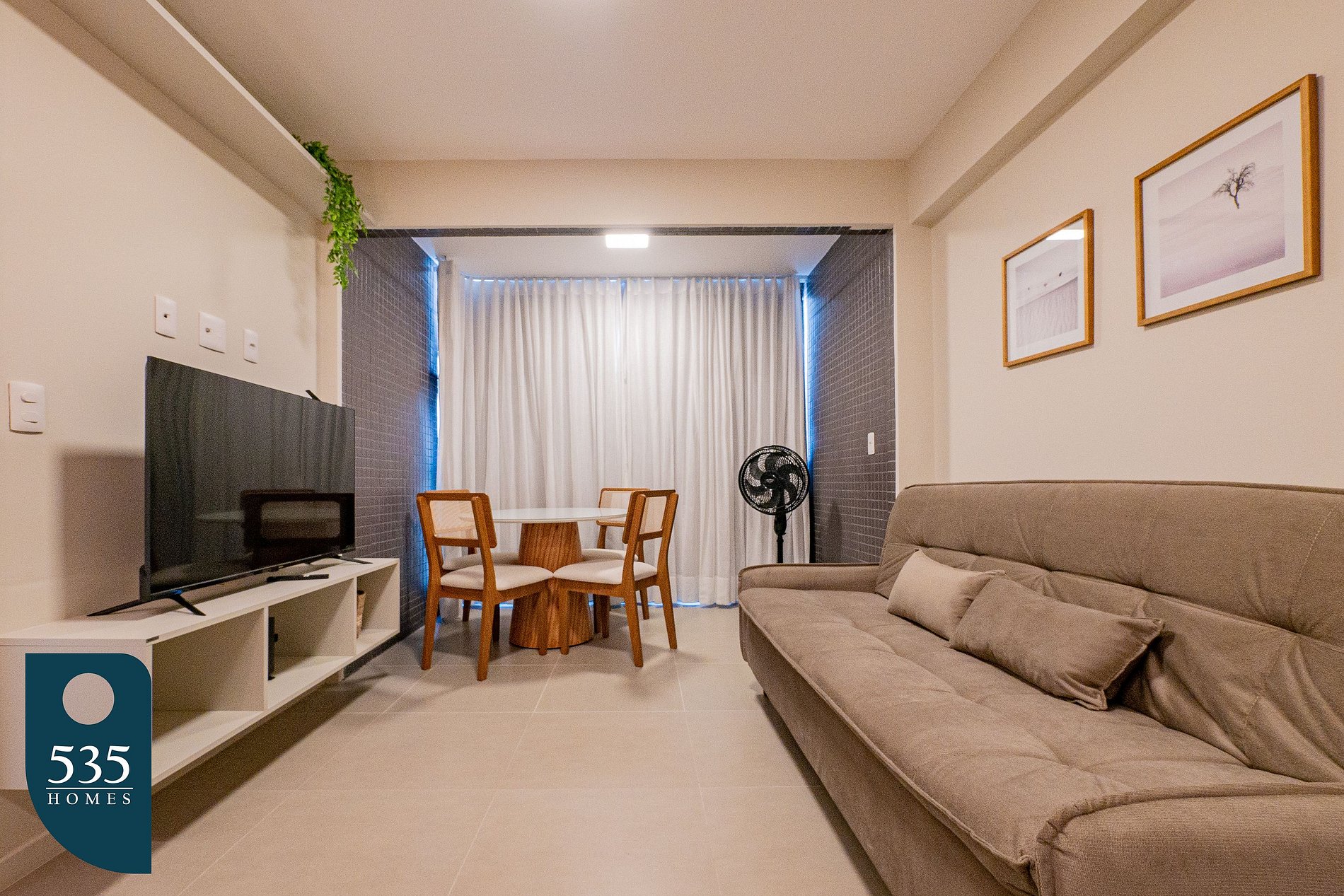 In the living room, you'll find a cozy space with a standing fan, a 50” Smart TV, and a dining table with chairs—perfect for relaxing or enjoying a meal.
