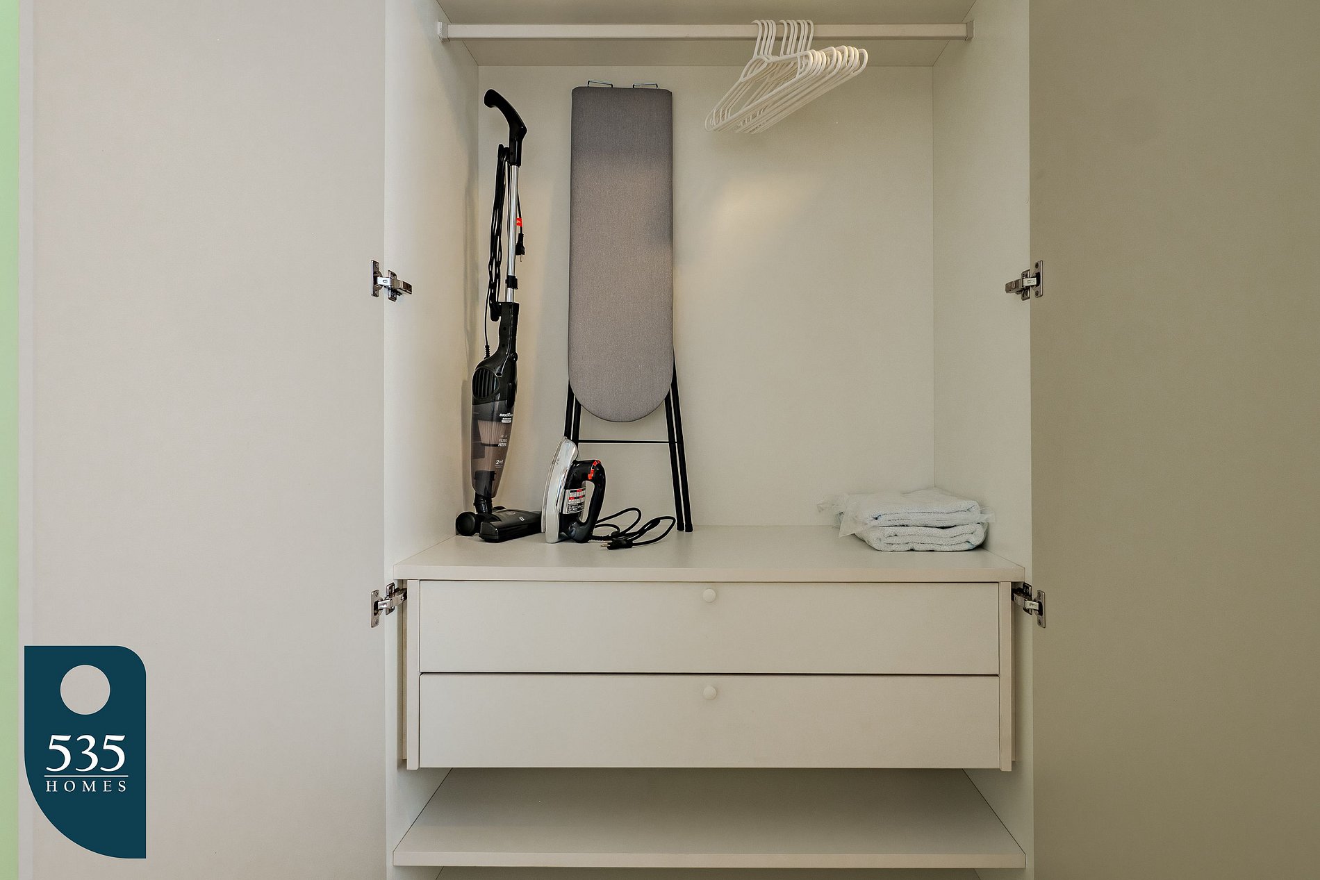 In the bedroom, comfort continues with a 32” Smart TV, air conditioning, iron, and a compact ironing board—ideal for those who like to keep everything neat and tidy.