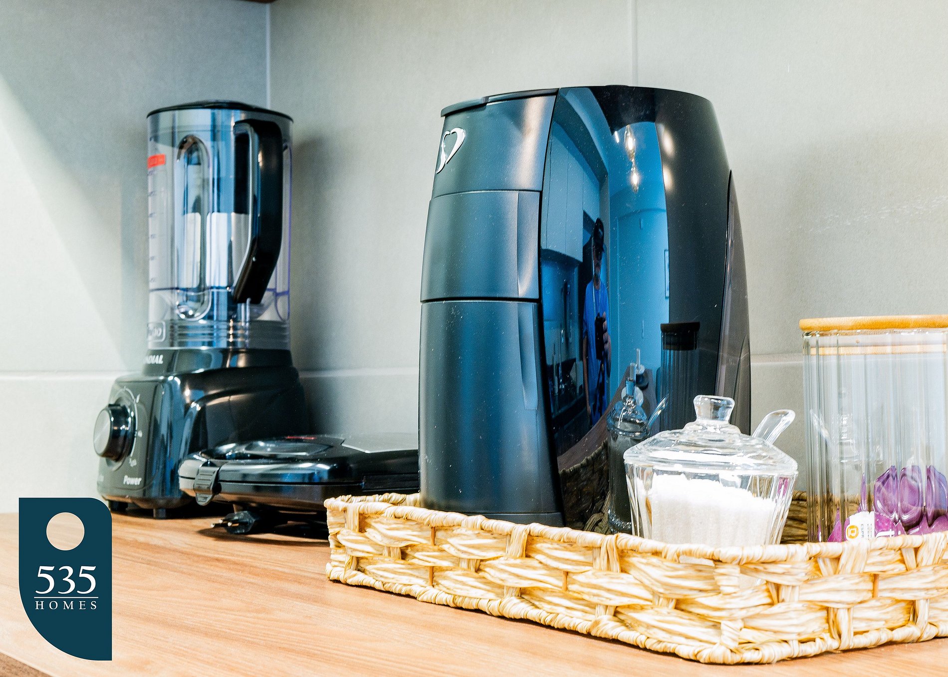 The kitchen is fully equipped with a 2-burner cooktop, electric oven, microwave, air fryer, sandwich maker, capsule coffee machine, Italian coffee maker, and a blender. It also features a refrigerator, washing machine, and a water purifier—everything you need for a practical and comfortable stay.