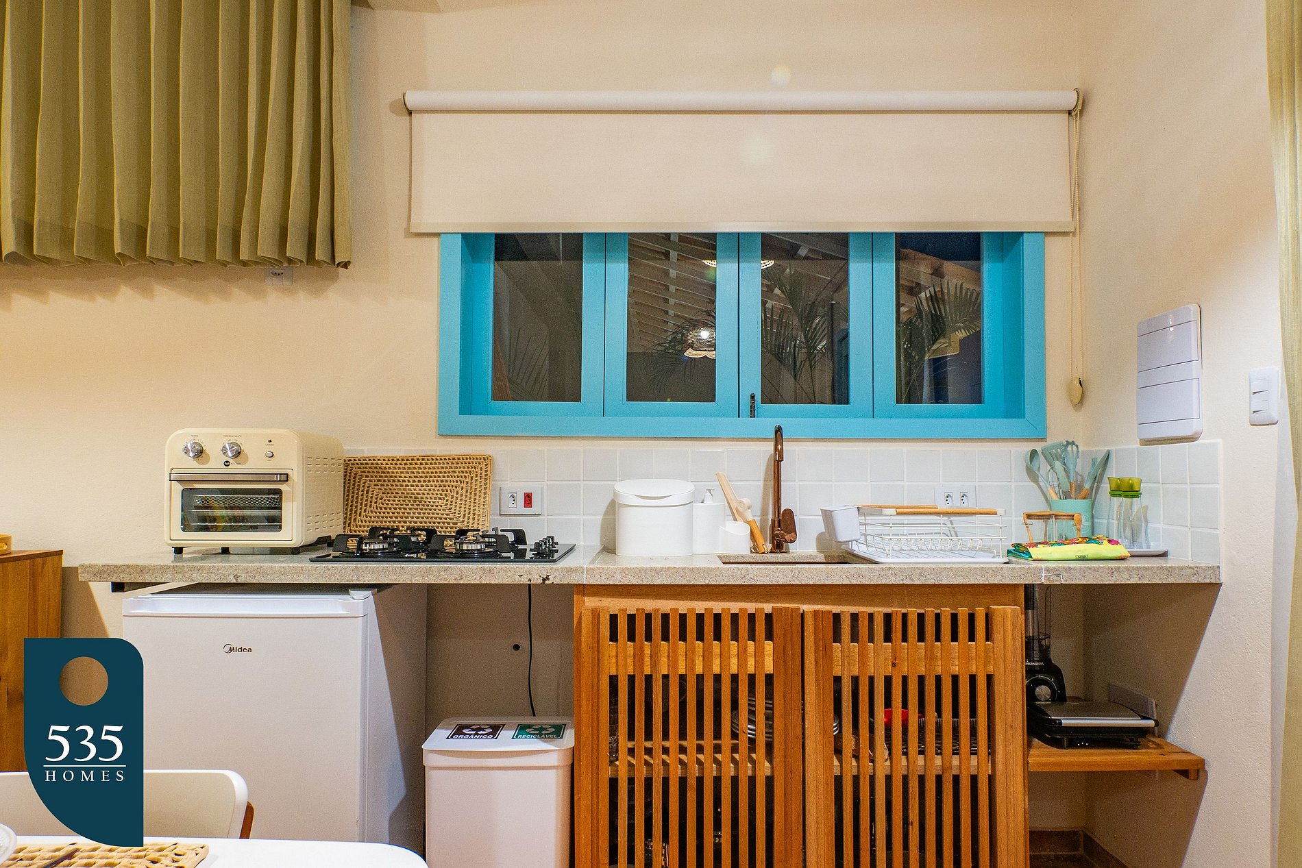 Enjoy all the comfort and convenience of this fully equipped apartment for an unforgettable stay. The private balcony is an invitation to relax, featuring lounge chairs, a side table, and a hammock for peaceful moments.