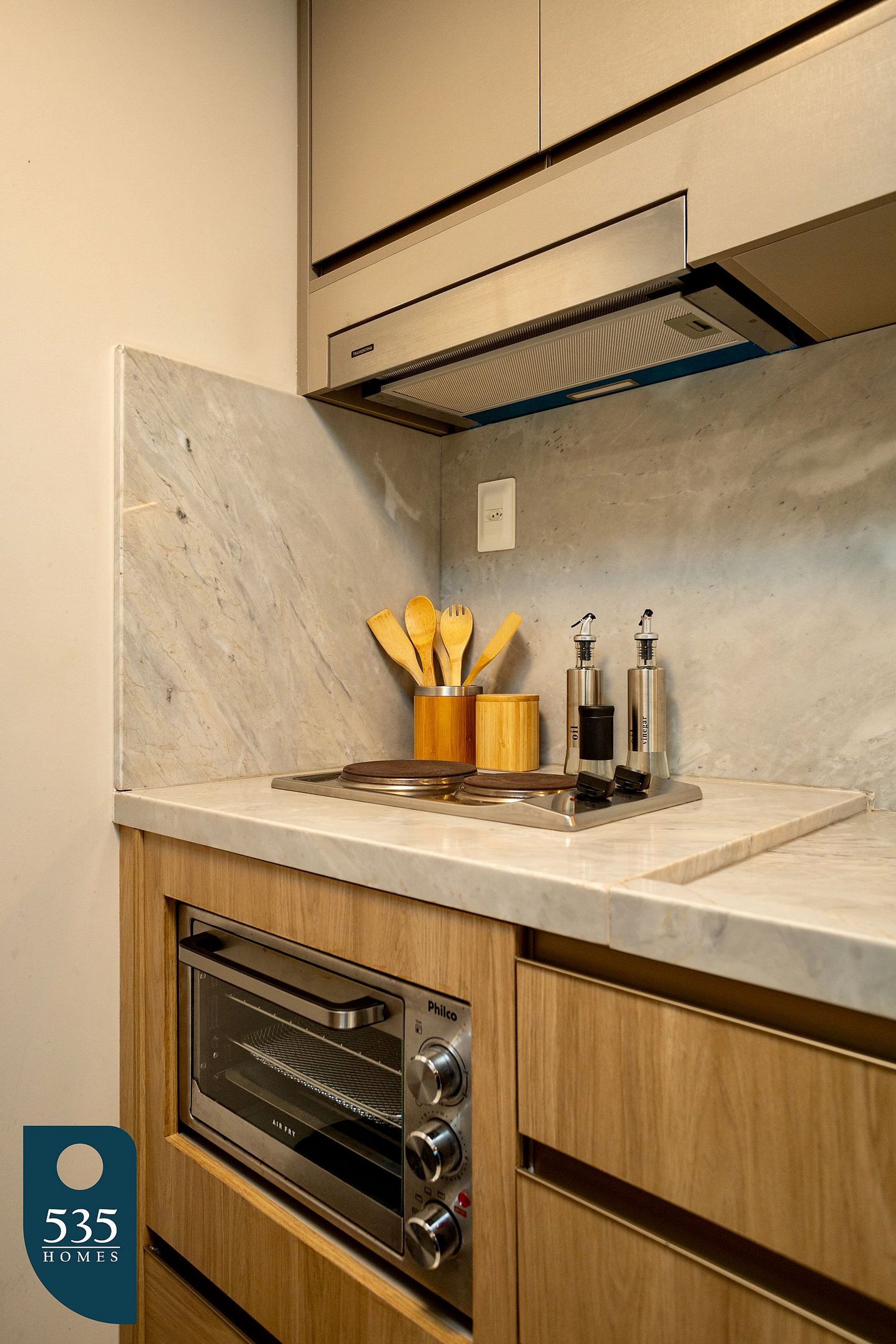 The kitchen is well-equipped and perfect for those who enjoy cooking their own meals. It features a portable oven, 2-burner electric cooktop, microwave, refrigerator, range hood, sandwich maker, blender, water purifier, Italian coffee maker, and a dining table.