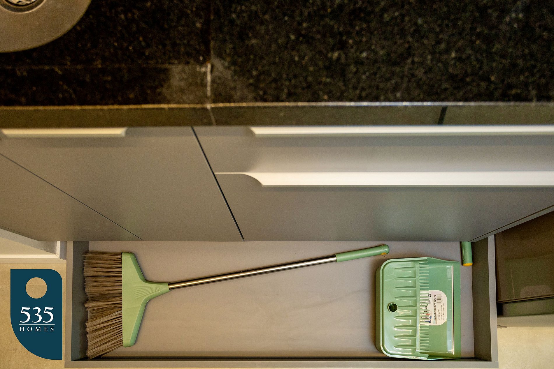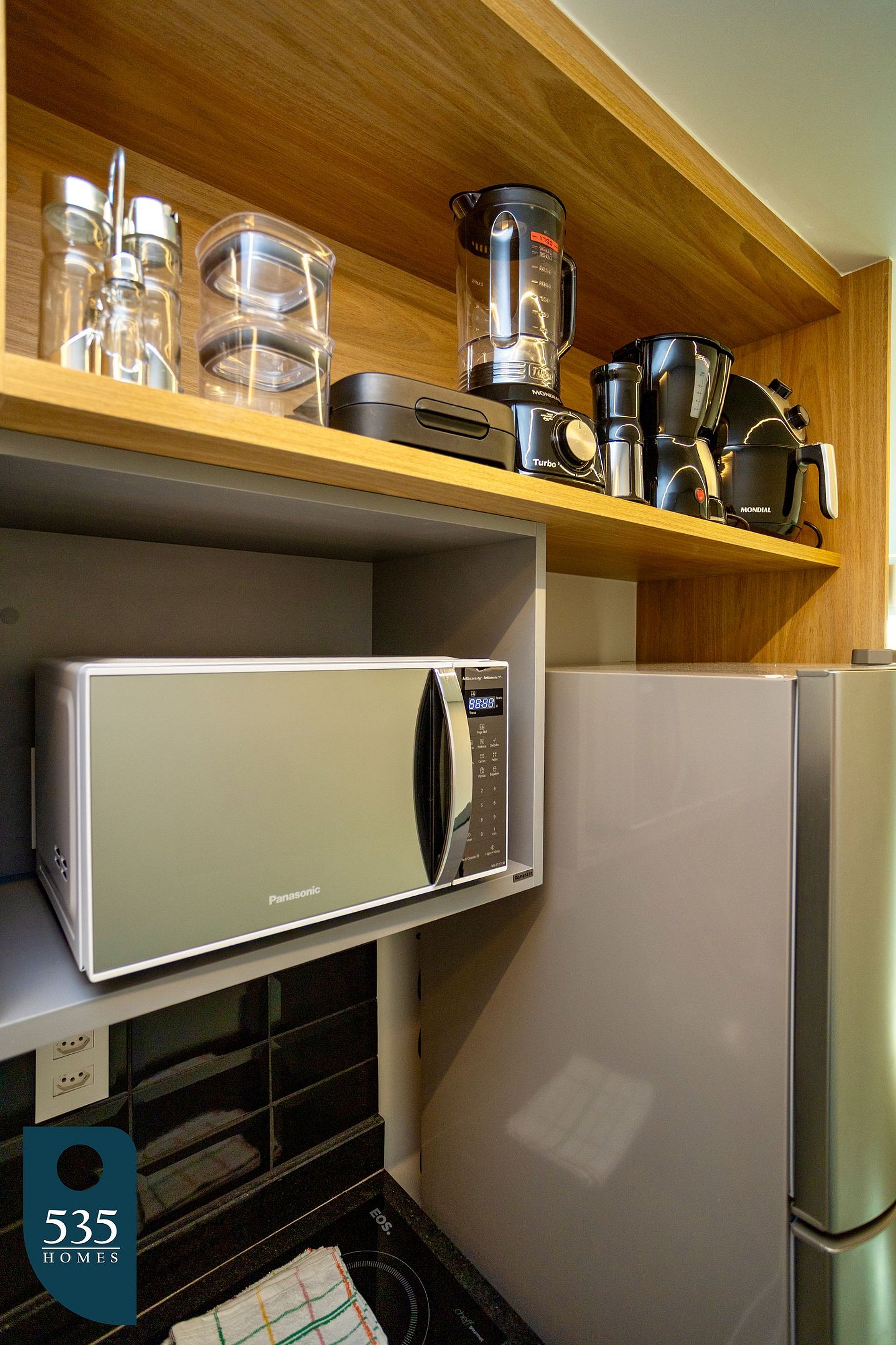 The kitchen is practical and modern, equipped with a 2-burner induction cooktop, refrigerator, microwave, air fryer, blender, electric coffee maker, sandwich maker, and a water purifier—providing everything you need to easily prepare your meals.