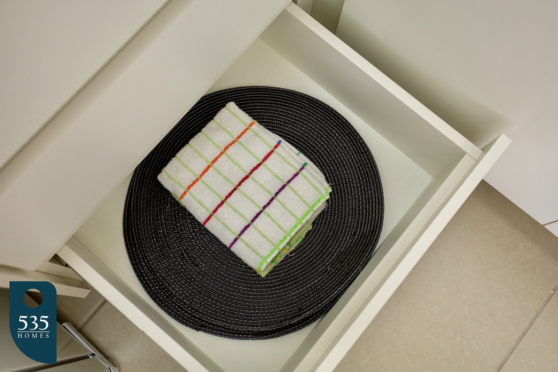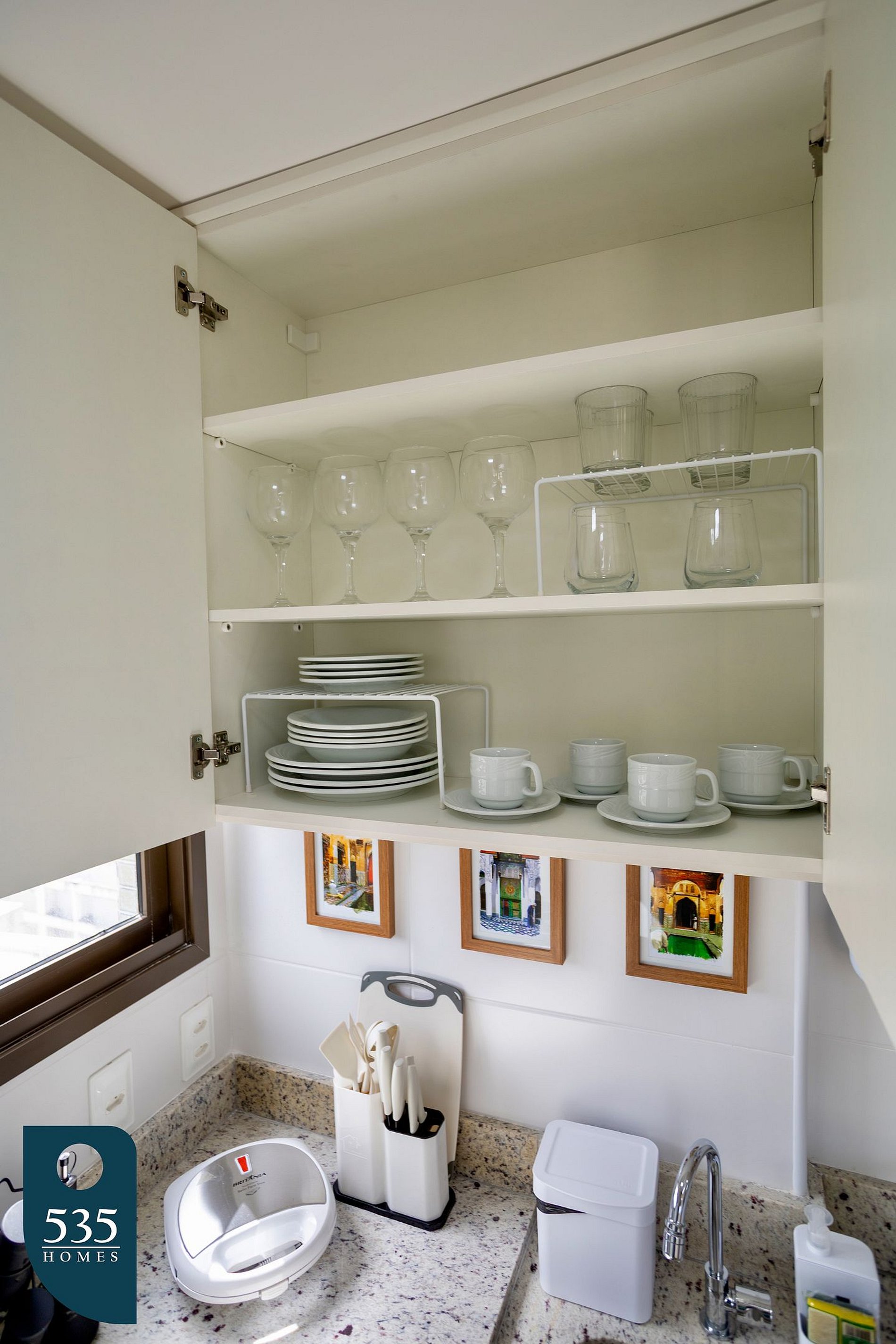 To make meal prep easy, the studio is also stocked with various utensils such as multi-purpose scissors, cutlery, knife set, cutting board, can opener, wine opener, pot rest, strainers, oven mitt, and other essential kitchen tools.