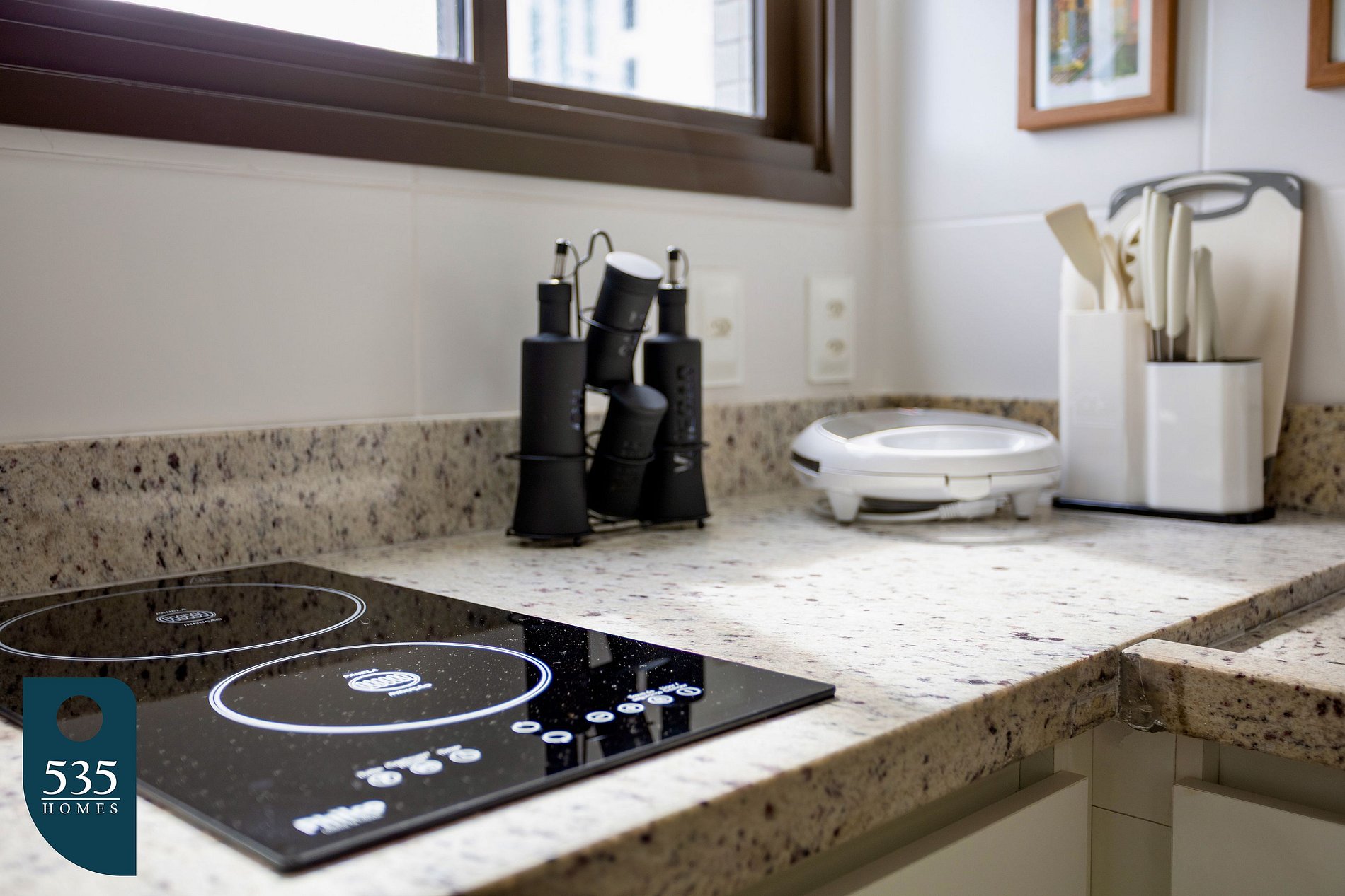 This vacation studio offers a fully equipped setup, ideal for guests seeking convenience, comfort, and independence during their stay. The kitchen includes a two-burner induction cooktop, microwave with cover, capsule coffee machine, Italian coffee maker, blender, sandwich maker, refrigerator, water purifier, dish rack, sink squeegee, trash bin, detergent dispenser, as well as a set of three pots with glass lids, frying pans, milk pot, spice rack, rice/pasta strainer, stainless steel bowls, food storage containers, microwave-safe glass baking dish, glass pitchers, drinking glasses, wine glasses, coffee cups, ice bucket, dinnerware set, and placemats.