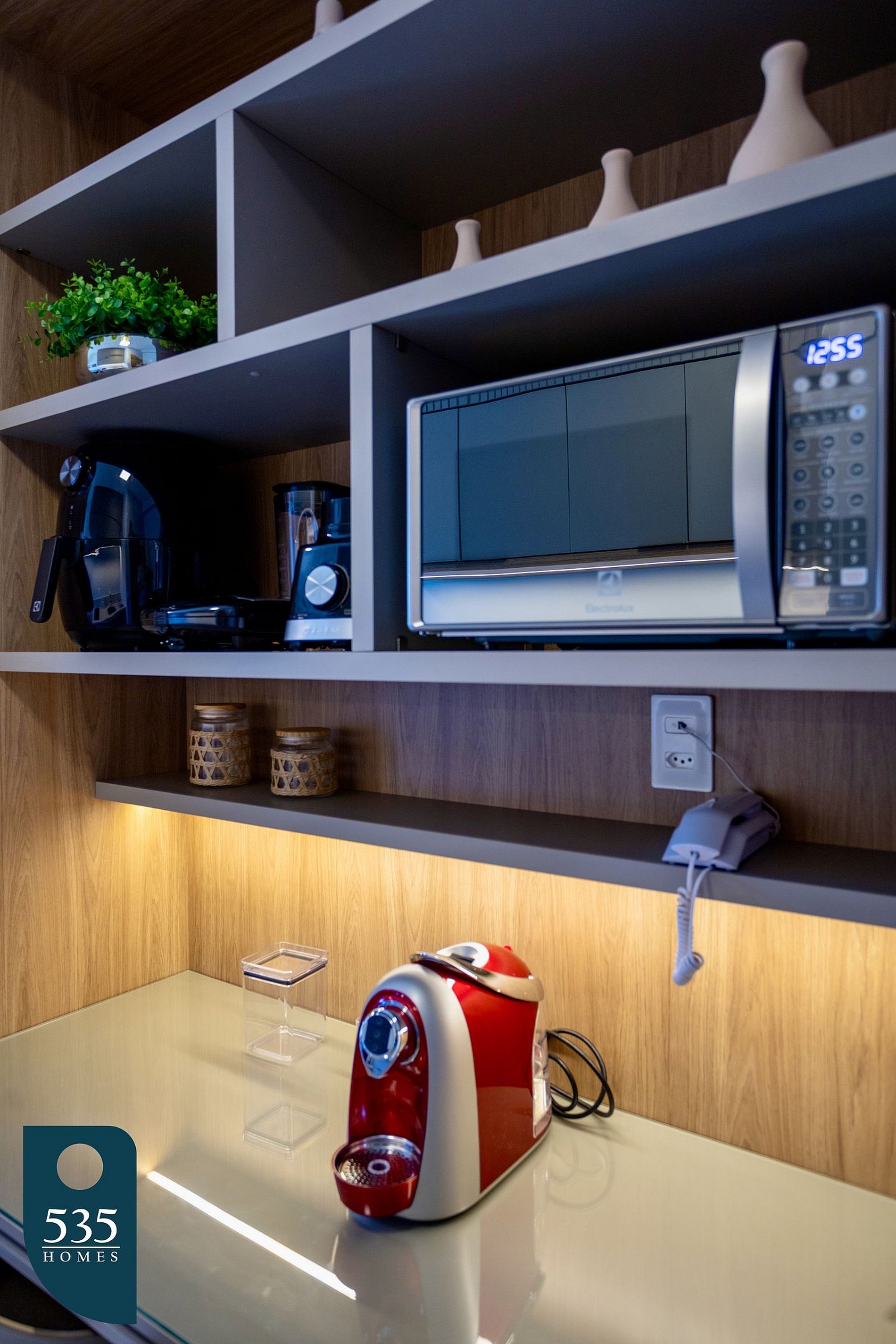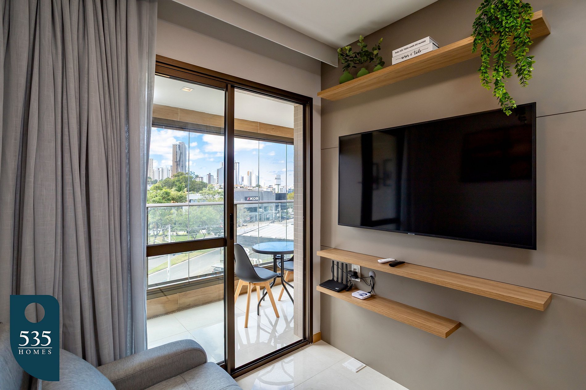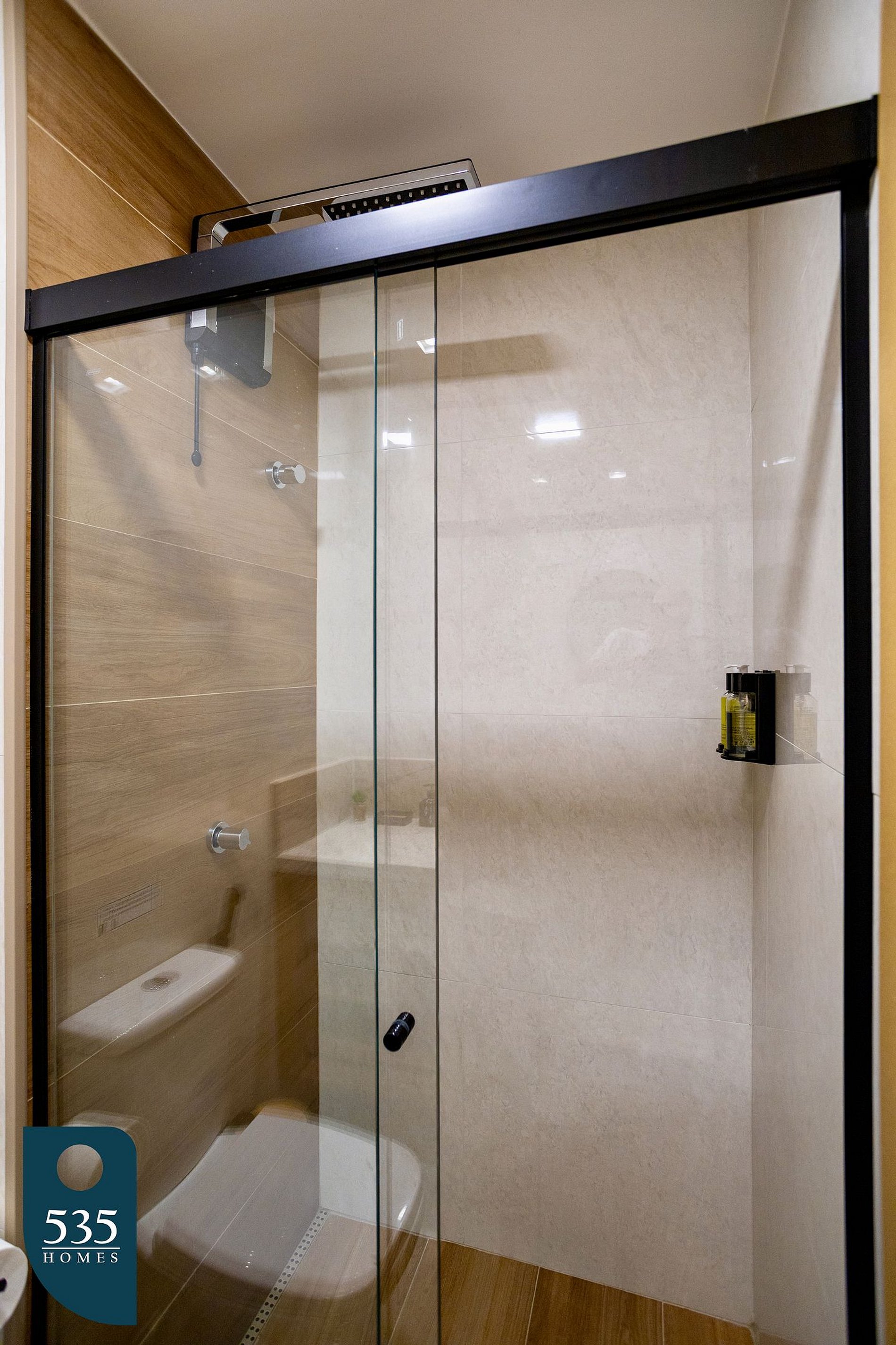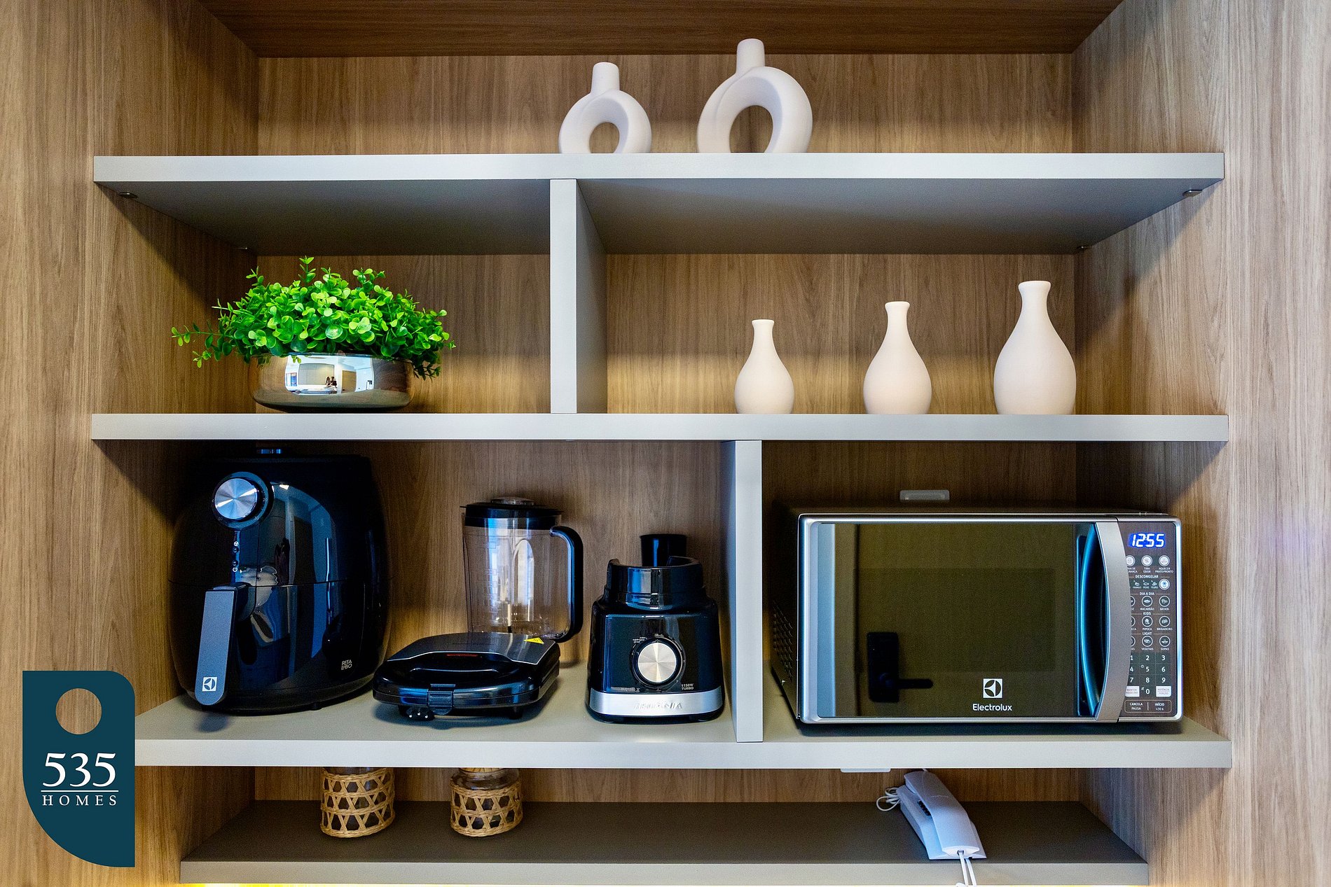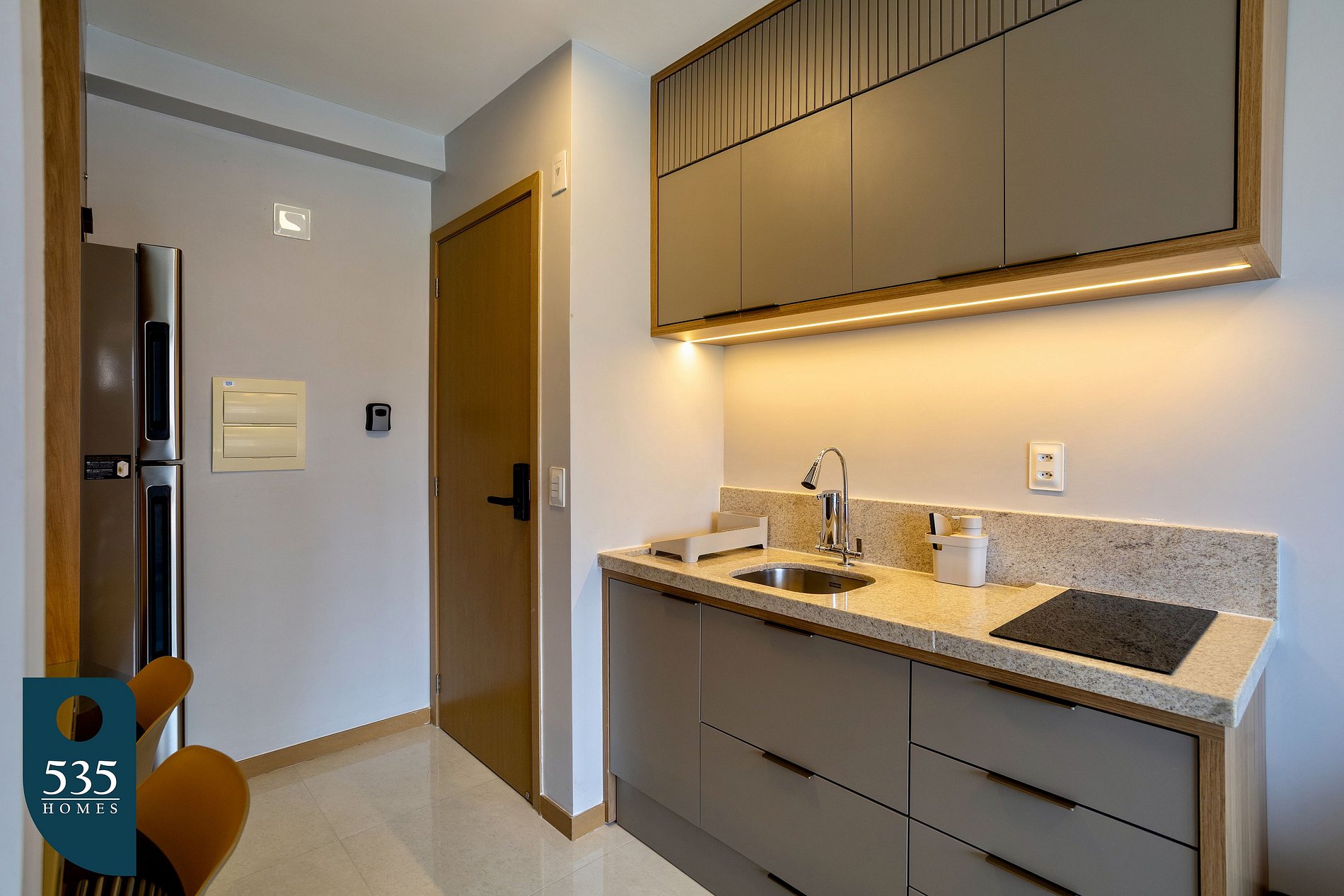 The apartment was designed to offer practicality and well-being in every space. The kitchen includes a dining counter, microwave, air fryer, blender, sandwich maker, coffee machine, water purifier, and a two-burner induction cooktop, along with a thermal bottle, pasta and rice strainer, and cutting board, making meal preparation convenient and easy. In the kitchen you’ll also find a broom, dustpan, floor drying rack, clothespins, floor squeegee, and bucket, ensuring convenience for daily tasks. The living room is equipped with a 55” Smart TV and blackout curtains with sheer voile, perfect for leisure and relaxation. The enclosed balcony with Reiki glass features a dining table and chairs, creating a pleasant space to unwind. In the bedroom, comfort is guaranteed with air conditioning, USB outlet, full-length mirror, and luggage stand, as well as an iron, compact ironing board, and hangers for added practicality during your stay. The bathroom offers an exhaust fan, electric shower, bidet shower, hairdryer, and mirror.