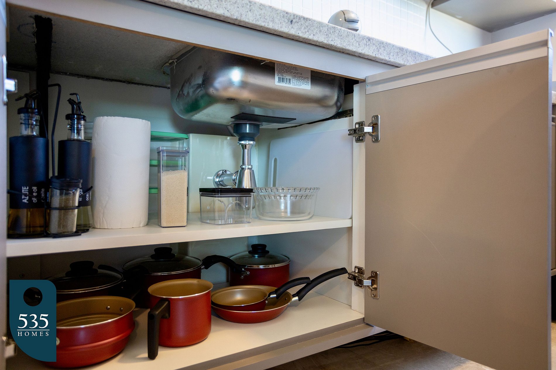 The kitchen includes a refrigerator, microwave, blender, sandwich maker, two-burner electric cooktop, electric coffee maker, and capsule coffee machine. It comes fully stocked with deep, shallow, and dessert plates, coffee cups with saucers, water and wine glasses, cutlery, and a wide variety of utensils. You’ll find a complete knife set (for meat, bread, and vegetables), pots with glass lids, frying pan, milk pan, strainer, bowls, pasta drainer, juice pitcher, oil and vinegar set, placemats, cutting board, trivet, multi-purpose scissors, wine opener, can opener, dish rack, sink squeegee, and a detergent dispenser. The counter features four chairs, ideal for quick meals.