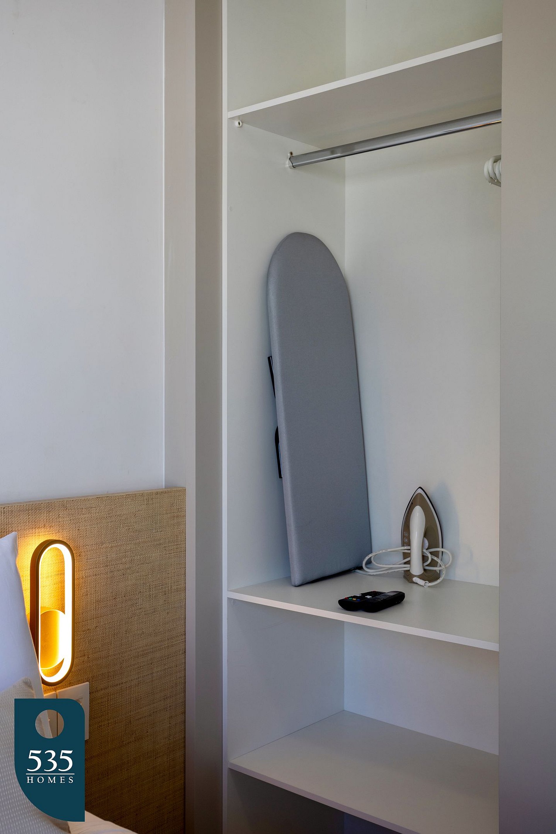 The bedroom offers air conditioning, a 43" smart TV, ironing board, iron, hangers, and a full-length mirror. The bathroom is equipped with an electric shower, bidet shower, hair dryer, toilet brush, pedal bin, and mirror. For added convenience, a collapsible bucket, clothes drying rack, and clothespins are also provided.