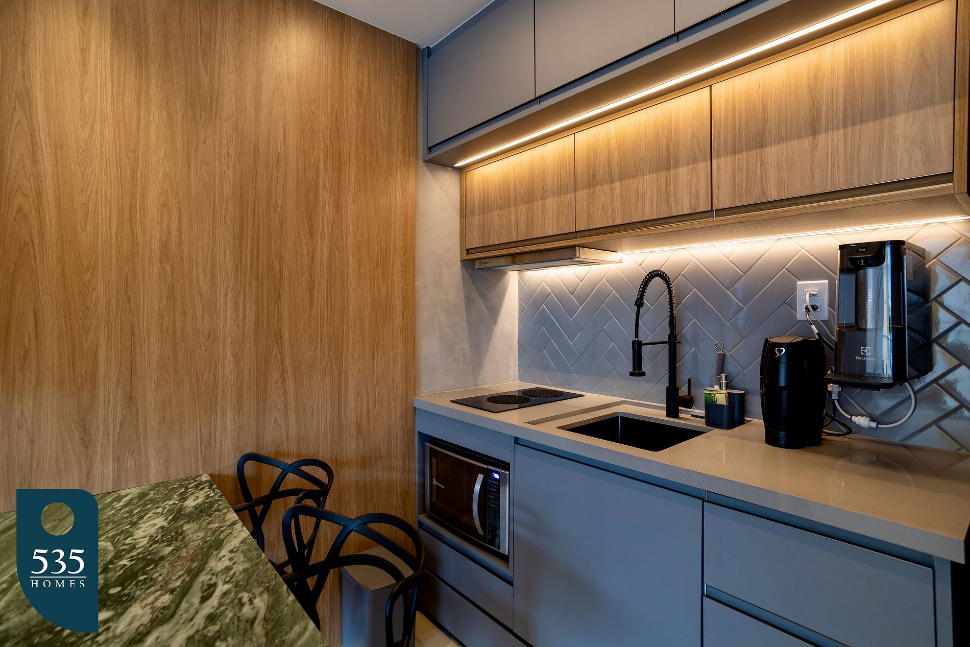 The apartment offers a complete and functional setup, perfect for those seeking practicality without giving up comfort. The kitchen is equipped with a two-burner induction cooktop, a retractable range hood, a water purifier, refrigerator, microwave with grill, pop-up power tower, gourmet faucet, blender, sandwich maker, air fryer, and a coffee machine. In the bedroom, the queen-size bed, sofa bed, Reiki glass enclosure, and blackout roller shade ensure privacy and thermal comfort. These are complemented by a desk lamp and a dedicated workspace with an armchair, ideal for working from home. The bathroom features an electric shower, hairdryer, and a lamp with blue chromotherapy lighting, adding a relaxing touch to the space. For everyday needs, the apartment includes a clothes-drying rack, collapsible bucket, brooms, squeegee, dustpan, and vacuum cleaner. The living room is climate-controlled with central air conditioning and offers comfort with a 40” smart TV and a floor lamp.