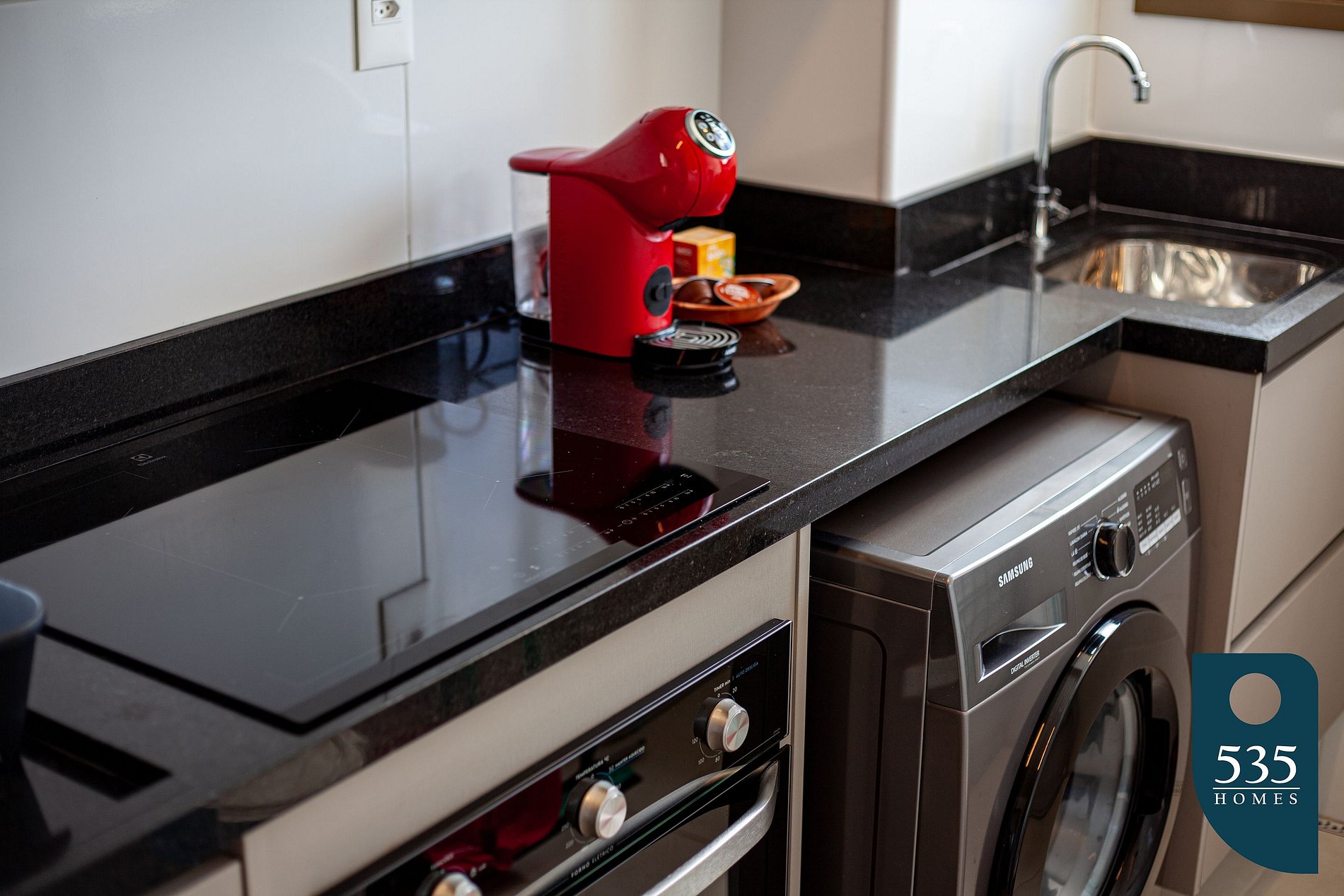The space is well-equipped with a 50" Smart LED TV with YouTube and Netflix, Split air conditioning in the bedroom and living room, 200 Mbps Wi-Fi Internet, Refrigerator, Blender, Sandwich maker, Grill, Iron and ironing board, Front-loading washing machine.