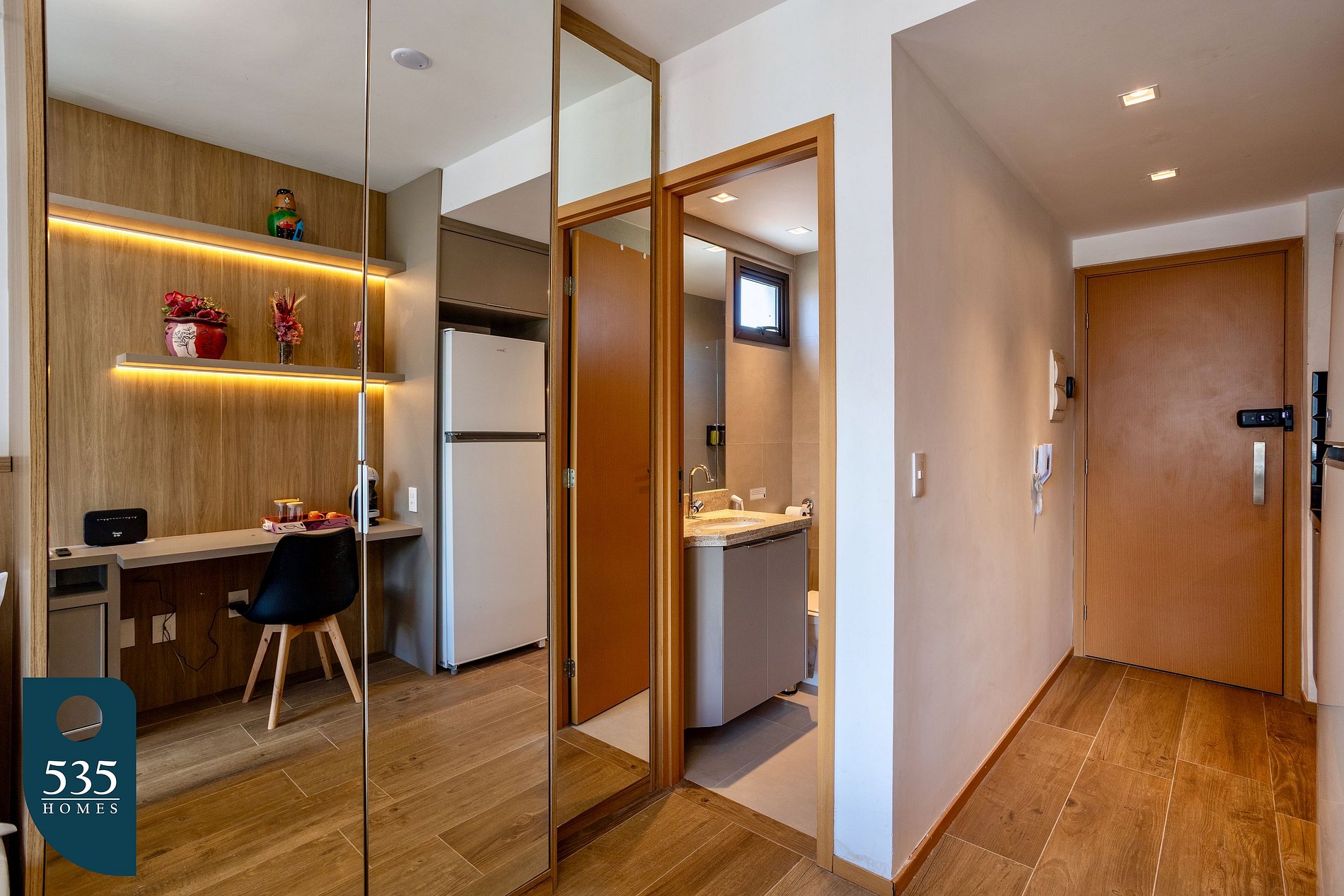 O quarto oferece conforto e funcionalidade, com ar-condicionado, Smart TV de 43”, estação de trabalho com cadeira, cortinas blackout e luminária com opções de luz fria e quente. Para mais comodidade, há ferro e mesa de passar roupa, cabides, varal de chão e itens de limpeza como rodo, vassoura e pá de lixo.